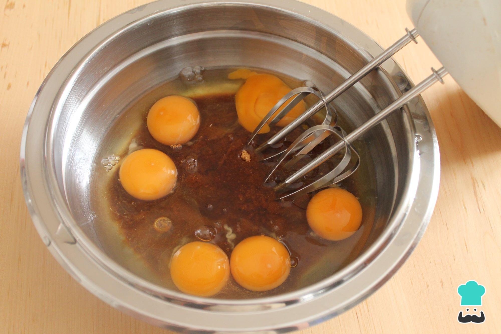 Para realizar la receta de pionono de jamón y queso, primero vamos a elaborar la base del pionono. Para ello, casca los huevos en un bol y añade el azúcar. Con unas varillas eléctricas bate hasta que resulte una mezcla muy espumosa.