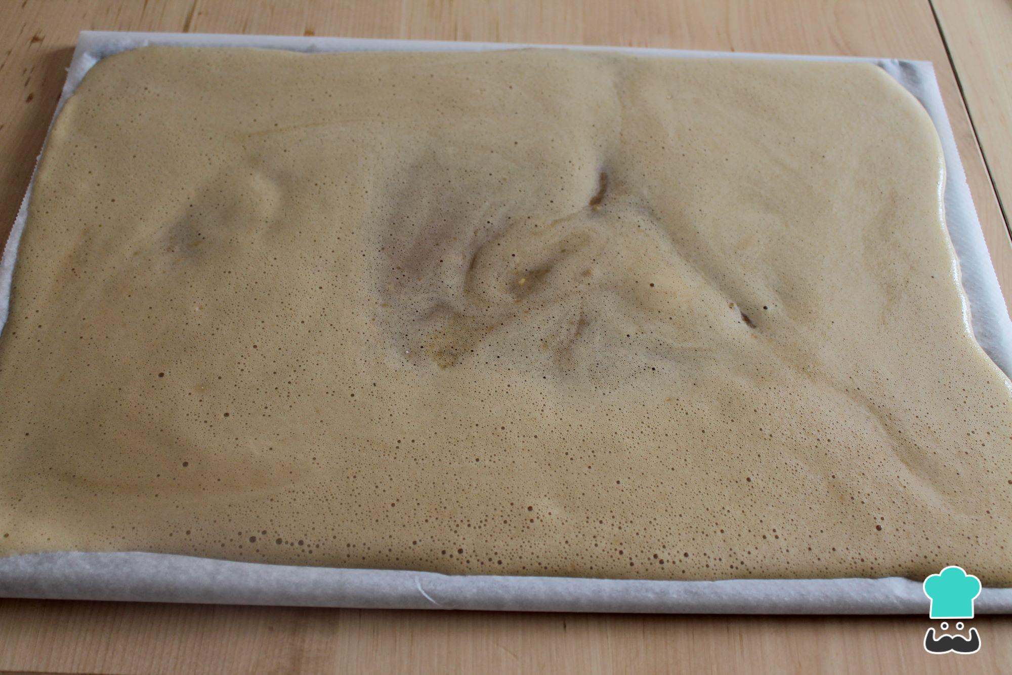 Precalienta el horno a 180 ºC y, a continuación, forra una bandeja con papel de horno, extiende la masa de los piononos en ella con una espátula. Luego, hornea con calor arriba y abajo a 180 ºC durante 5 minutos o hasta que la plancha de pionono esté dorada.