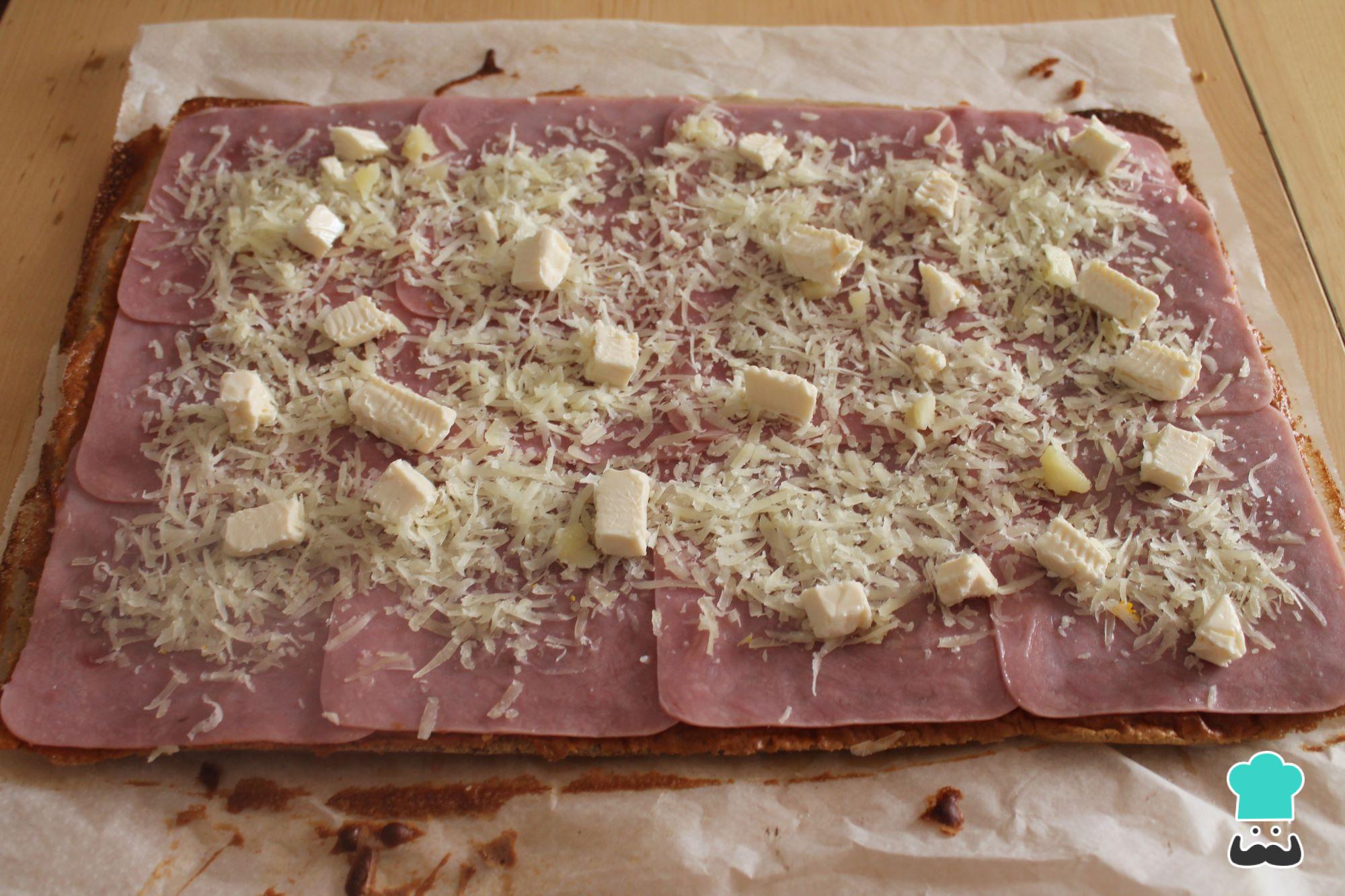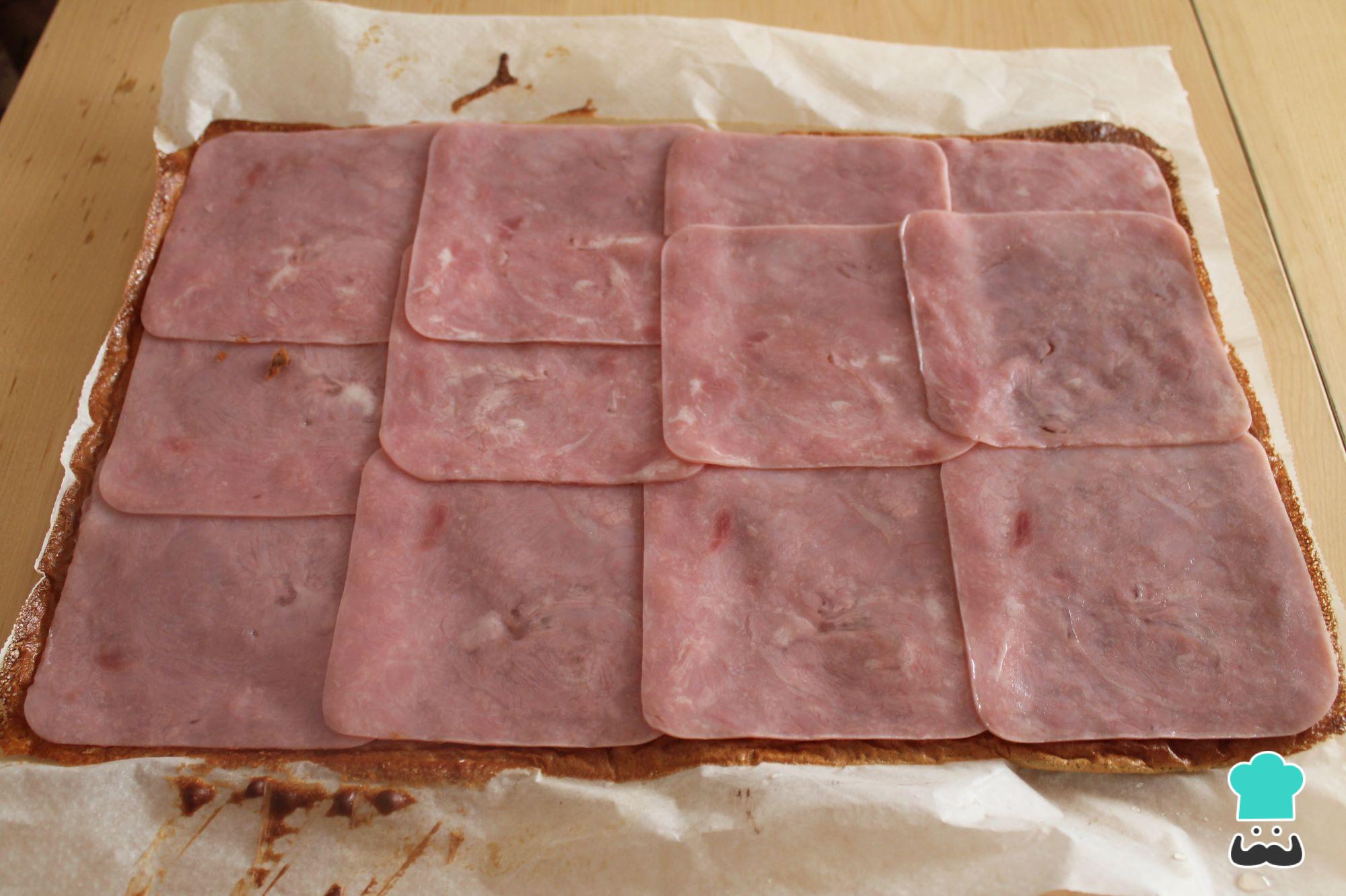 ¿Te preguntas cómo rellenar un pionono? Pues bien, primero retira la plancha de pionono del horno y coloca encima de ella las lonchas de jamón cocido.