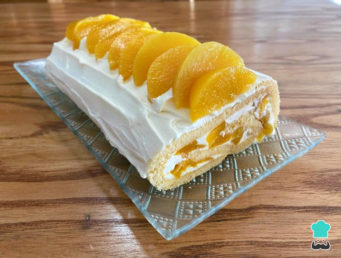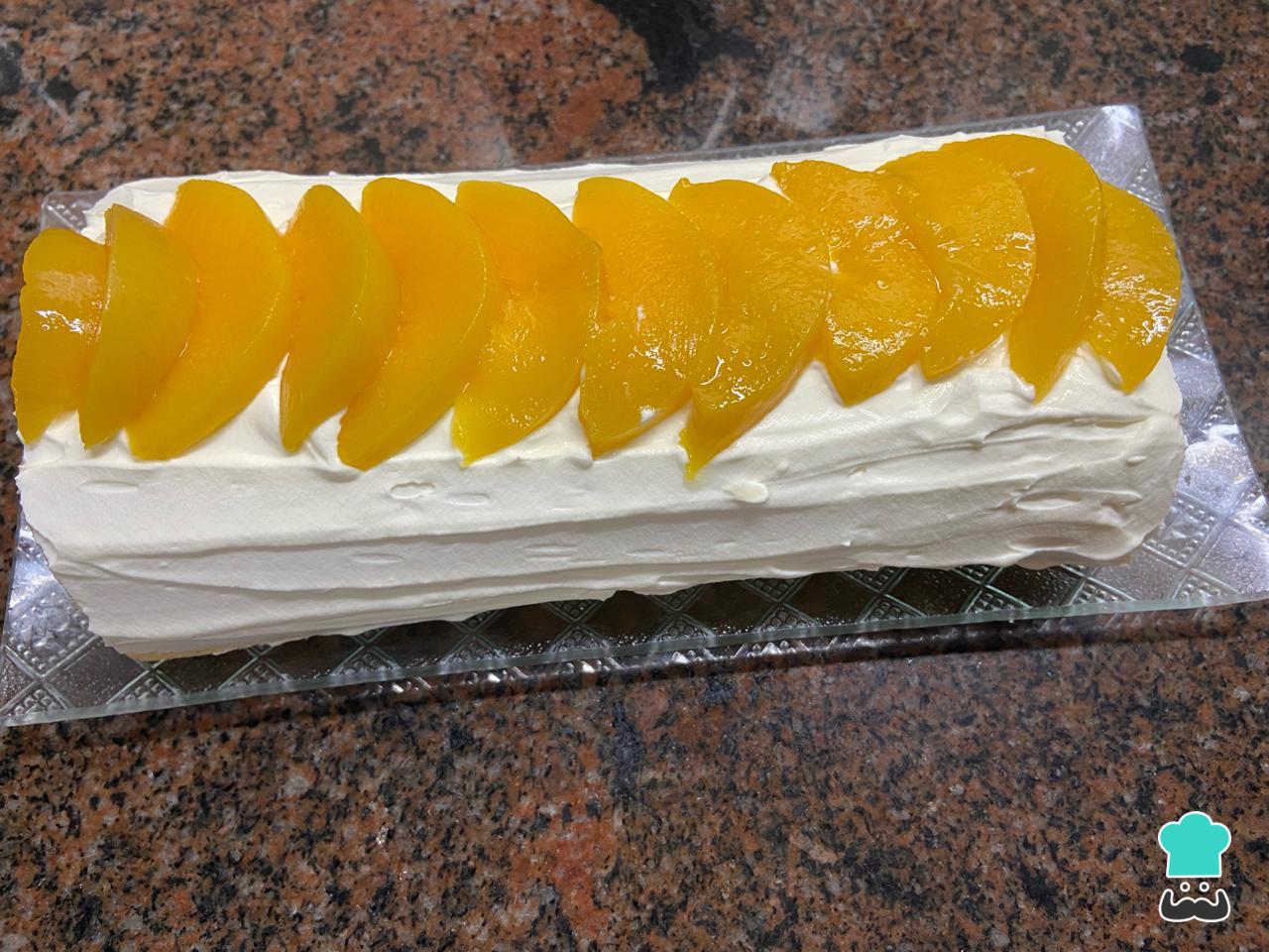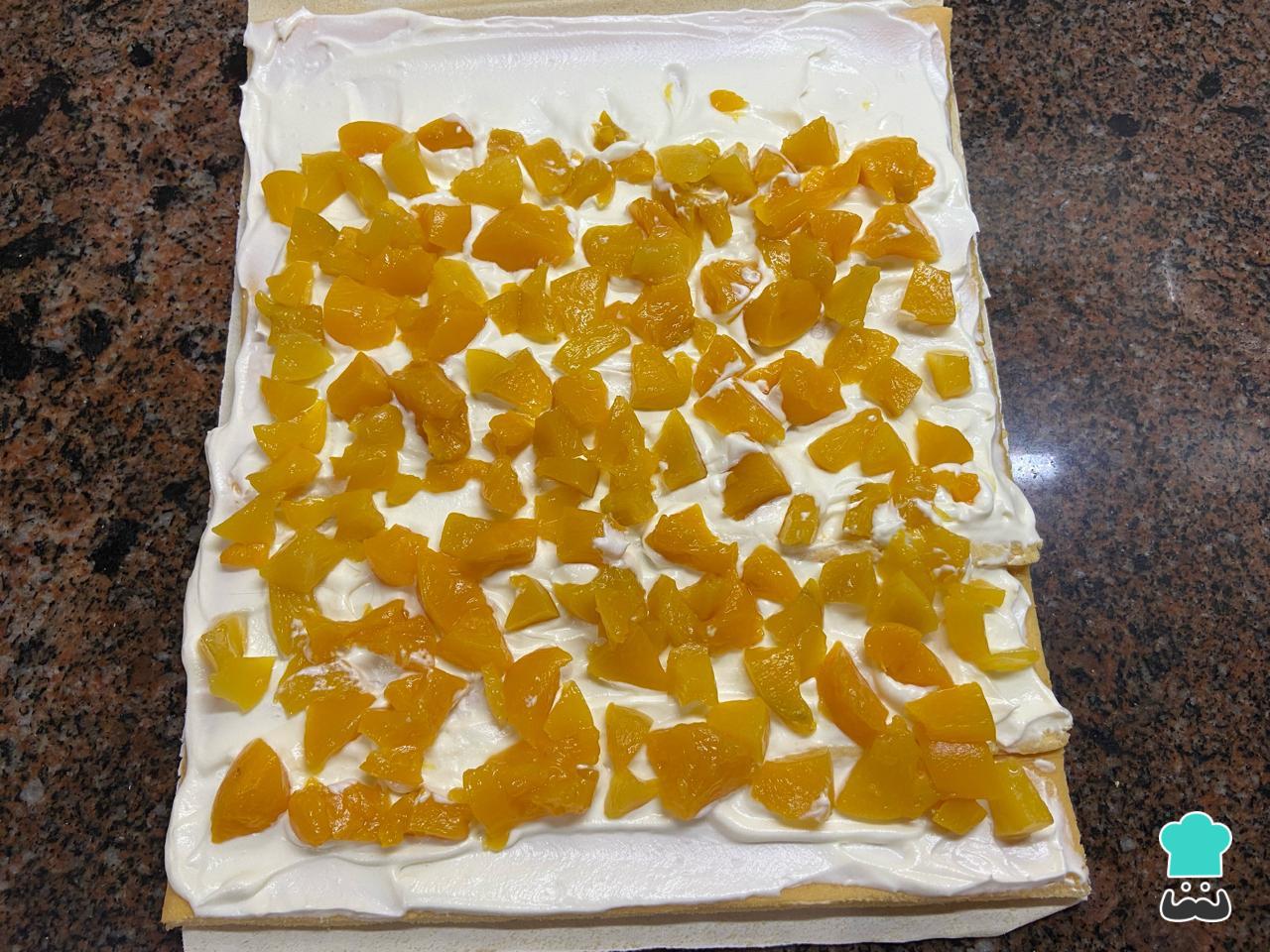Distribuye los cubos de duraznos. Deja libre los últimos 8 cm para que, al enrollarlo, puedas cerrarlo bien y no se te escapen los trocitos de fruta. Luego, arrolla y lleva a la heladera por 1 hora y media o 2 horas (cuanto más frío esté mejor.)
