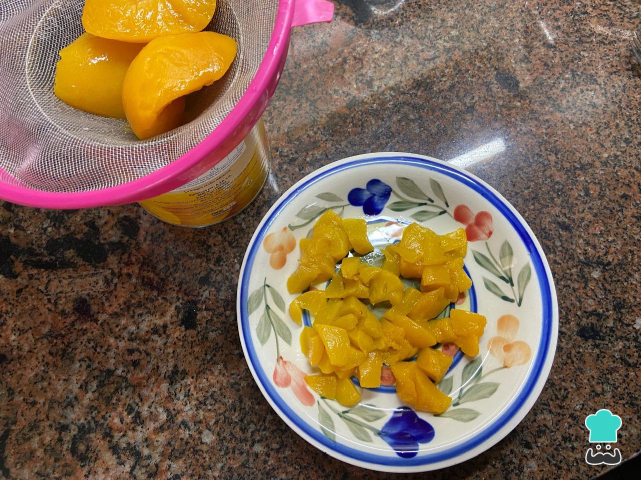 Escurre el almíbar de los duraznos y córtalos en cubos. Reserva 3 mitades para la decoración.