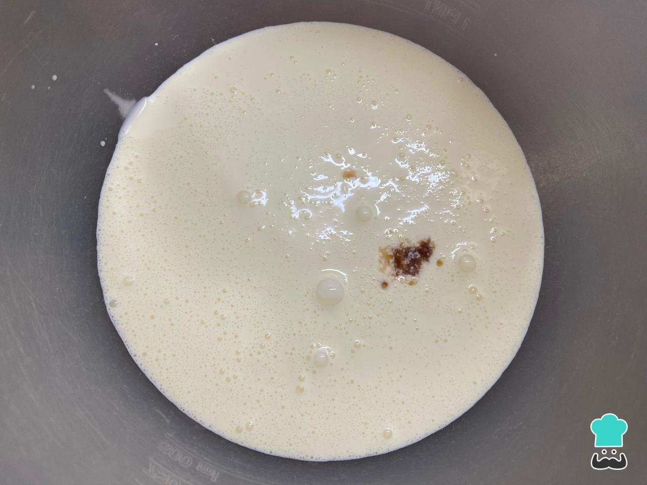 Coloca en un bol la crema de leche junto con el azúcar impalpable tamizada y la esencia de vainilla.