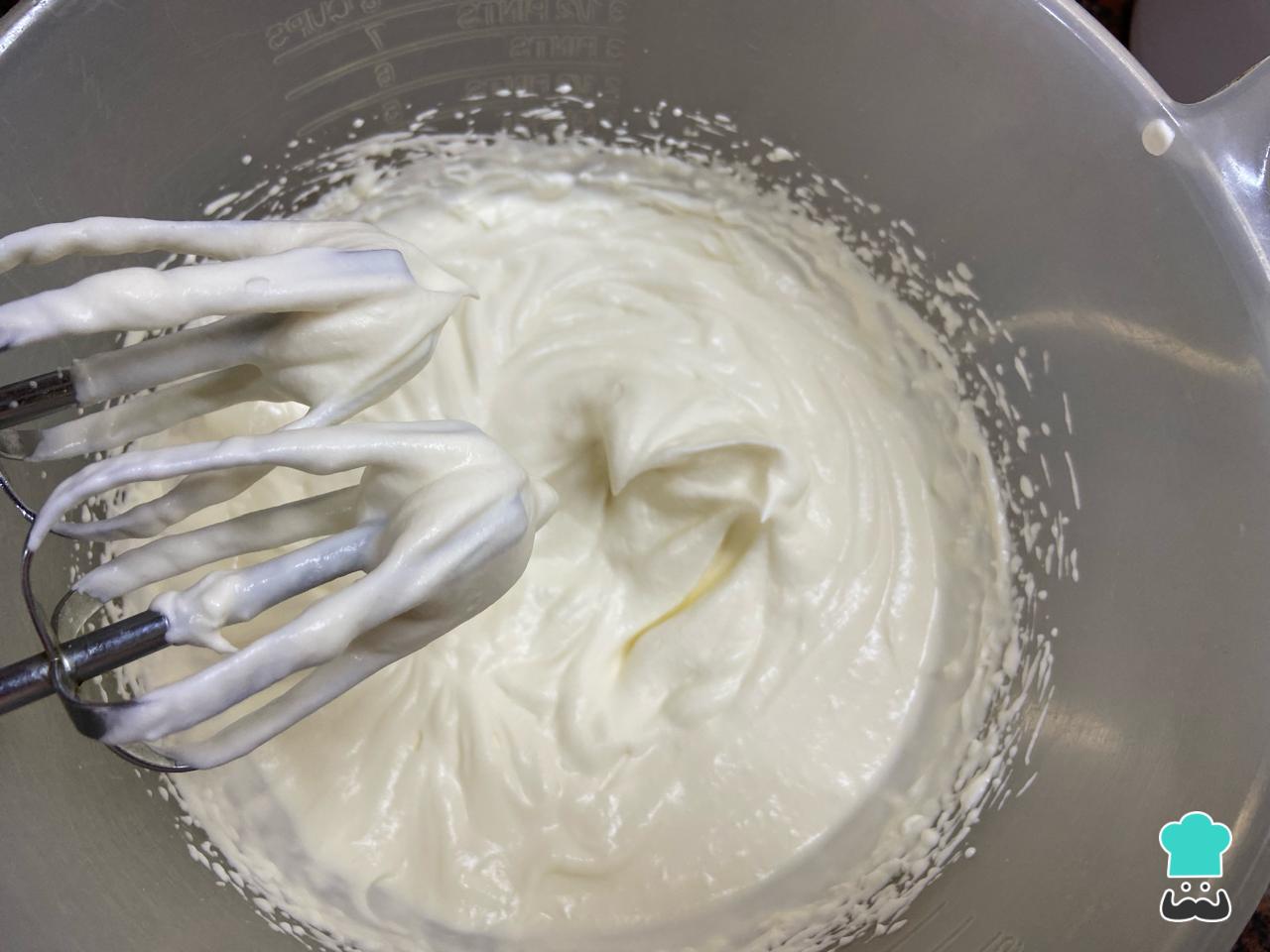Bate con batidora eléctrica hasta que tome cuerpo y puedas armar picos sostenidos como ves en la foto.