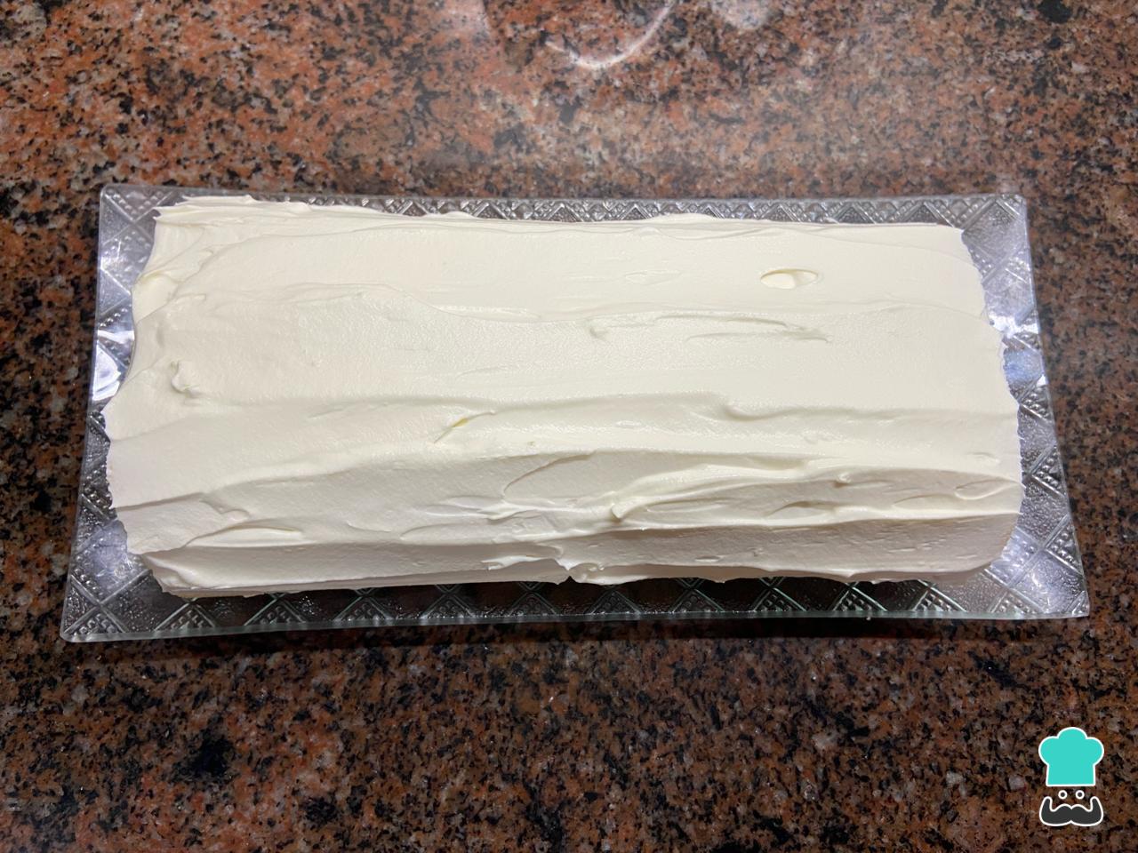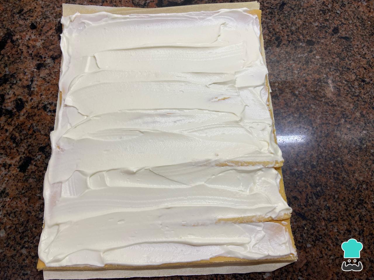 Despliega el pionono sobre la mesada y unta toda la superficie con ¾ partes de la crema. Reserva el ¼ restante para la decoración en la heladera.