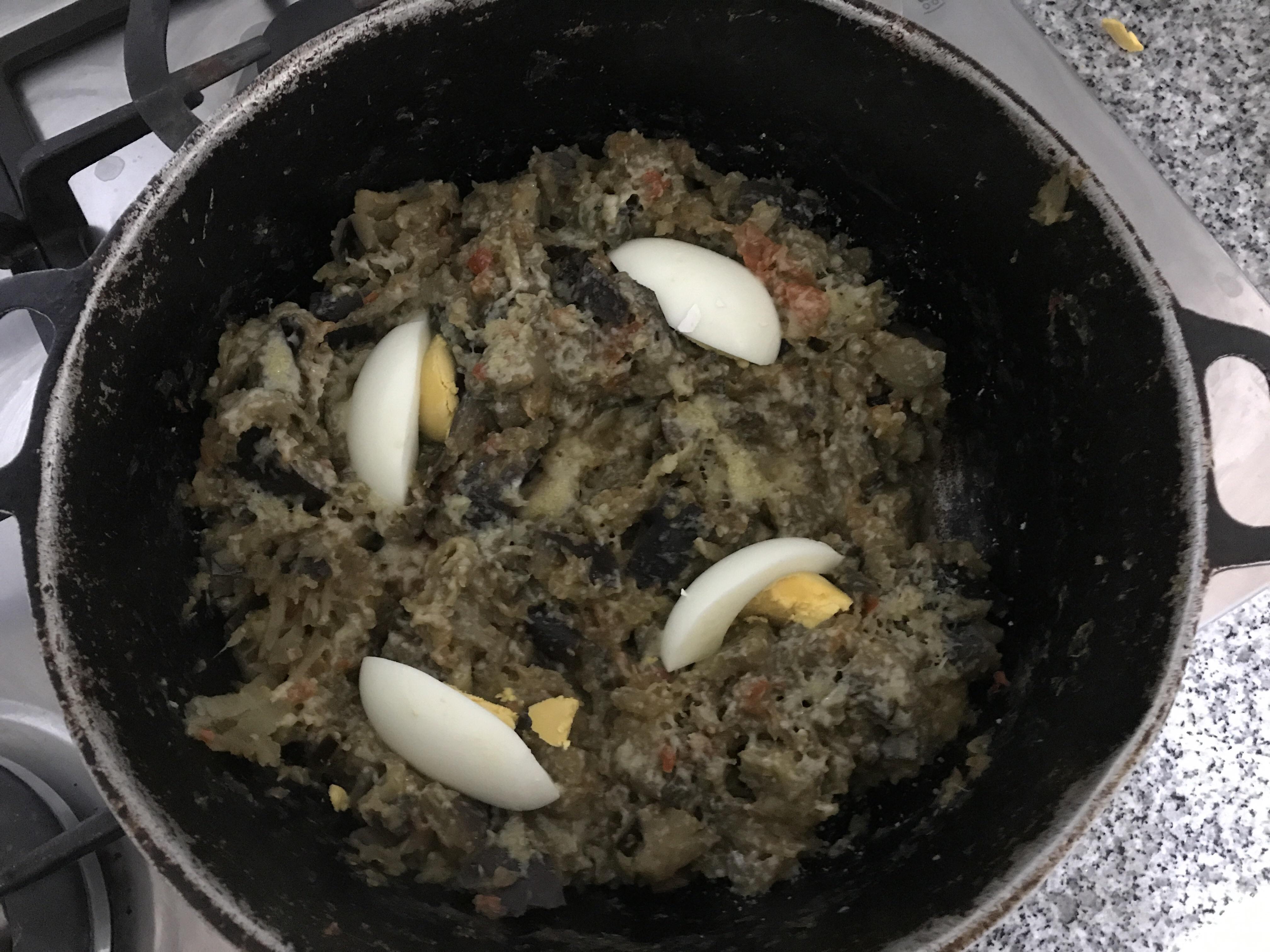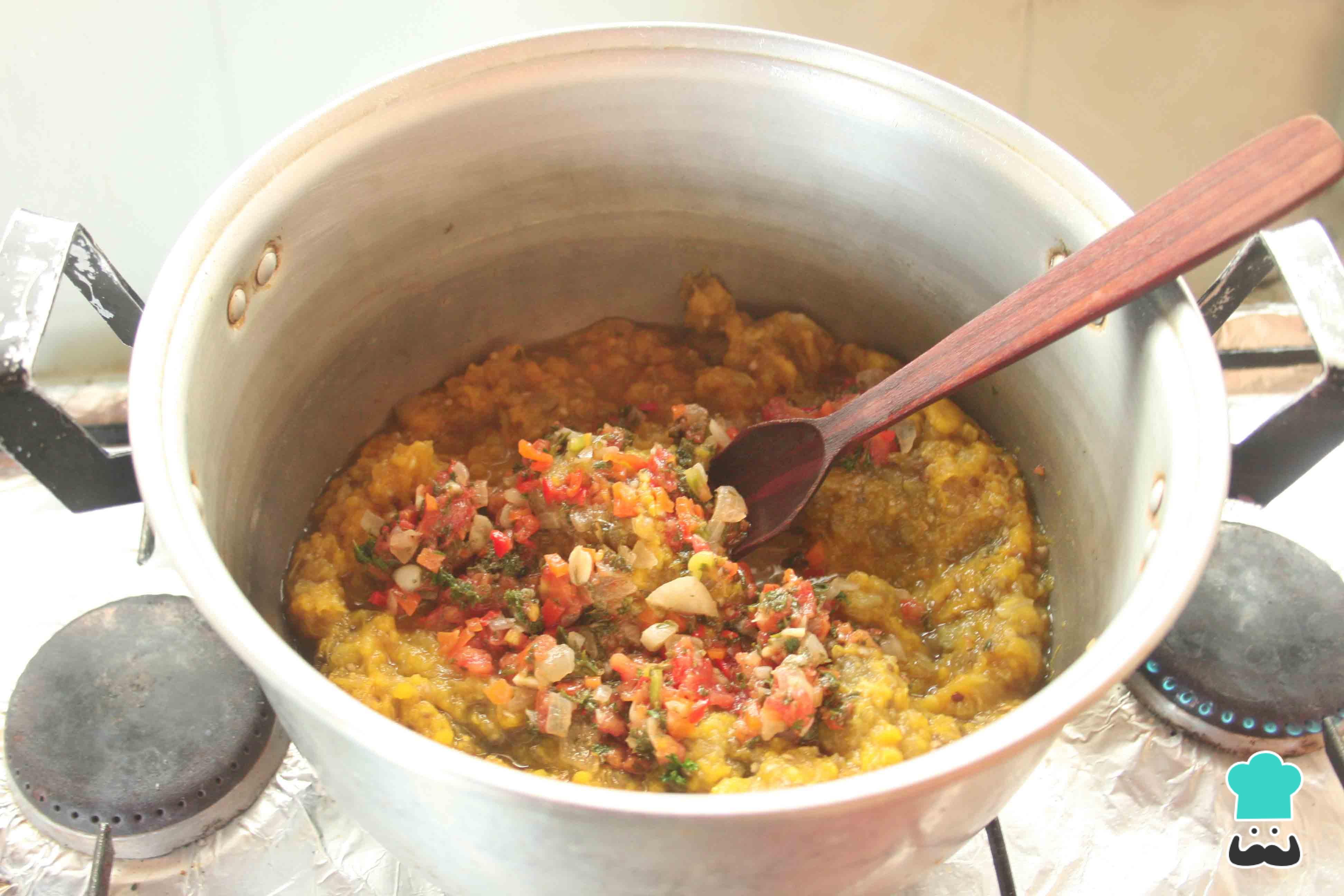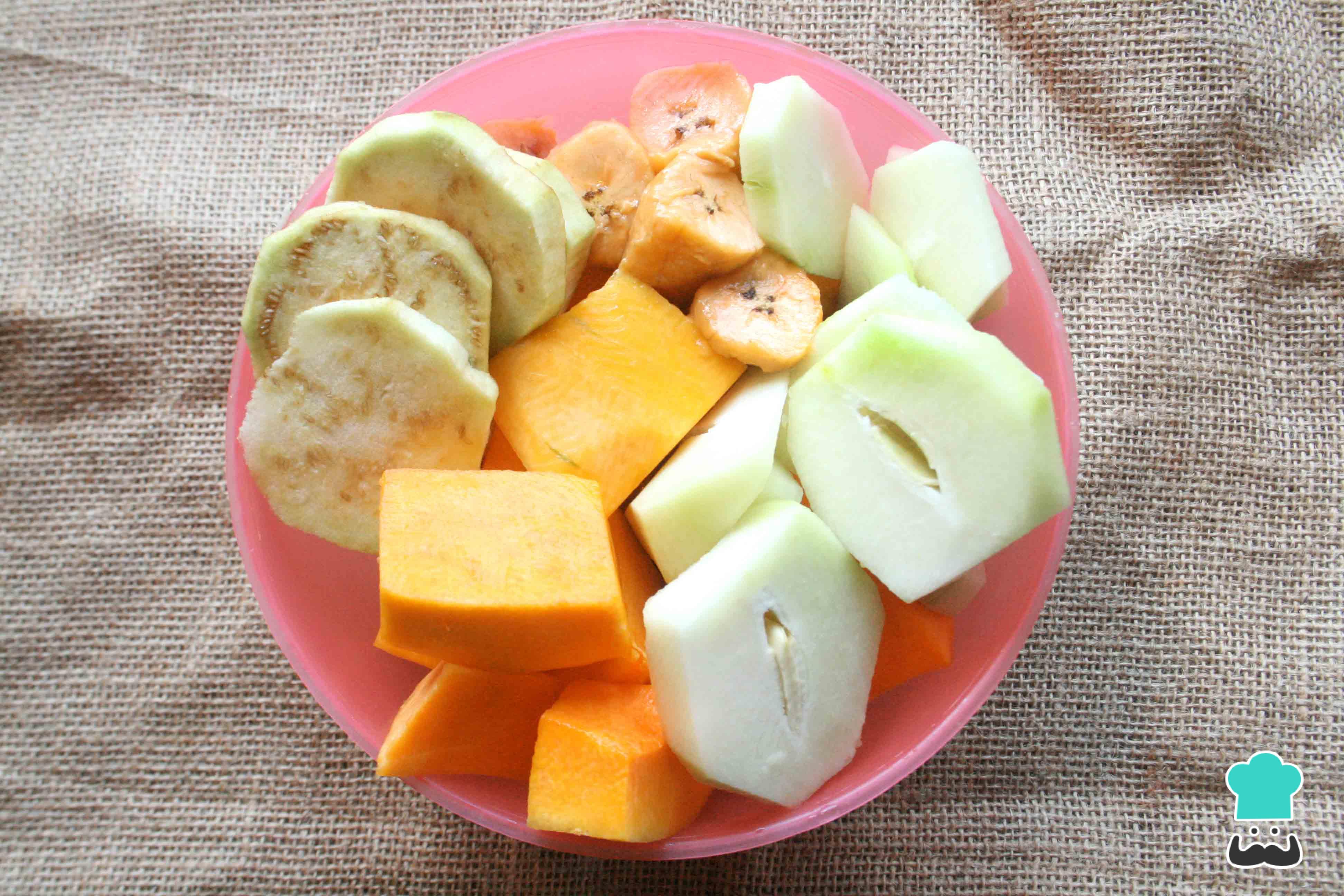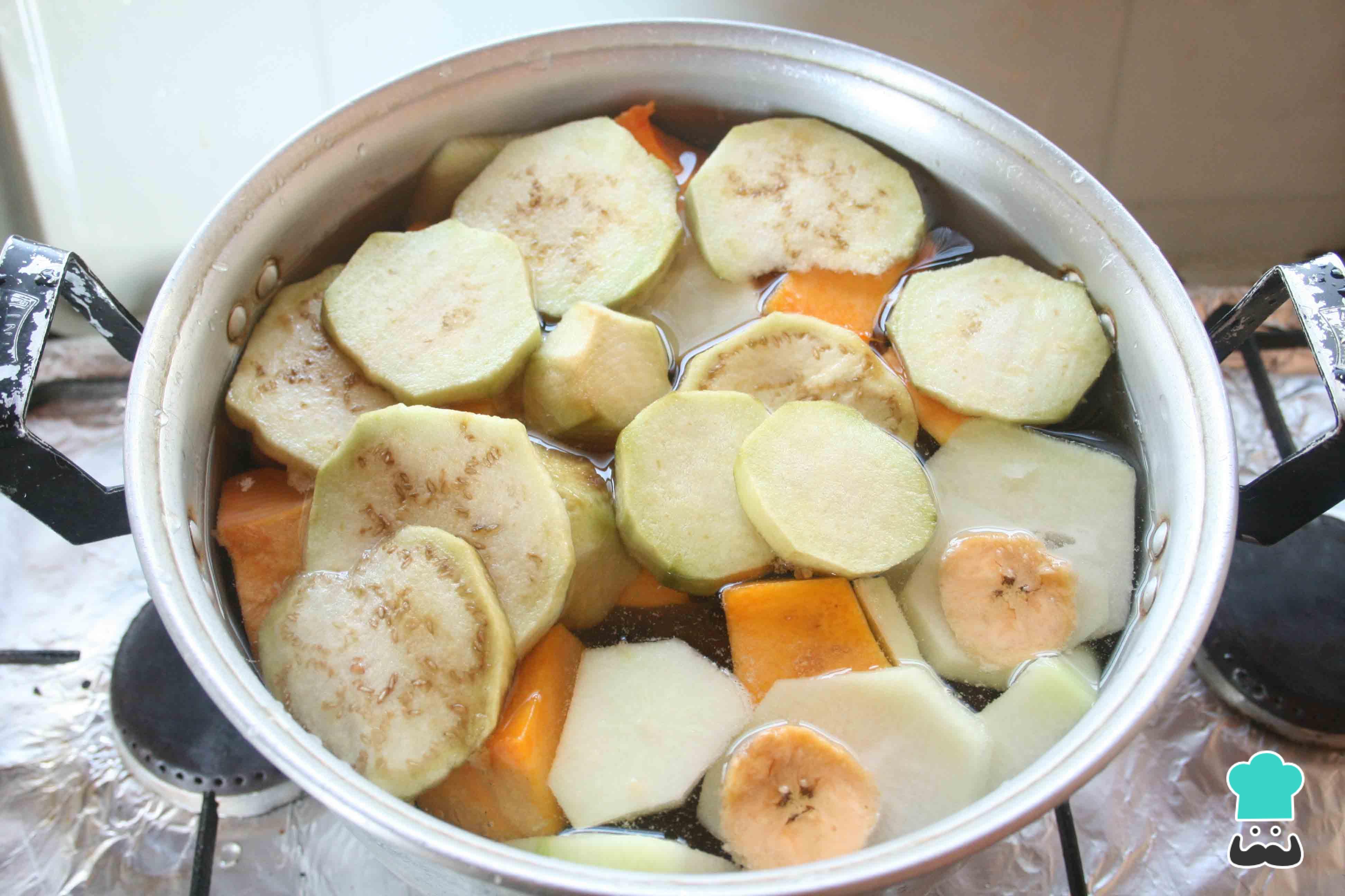 Hierve en una cazuela suficiente agua y agrega el plátano, la berenjena, la chayota y la auyama. Cuando todo ablande, cuela y espera hasta que escurra todo el liquido.