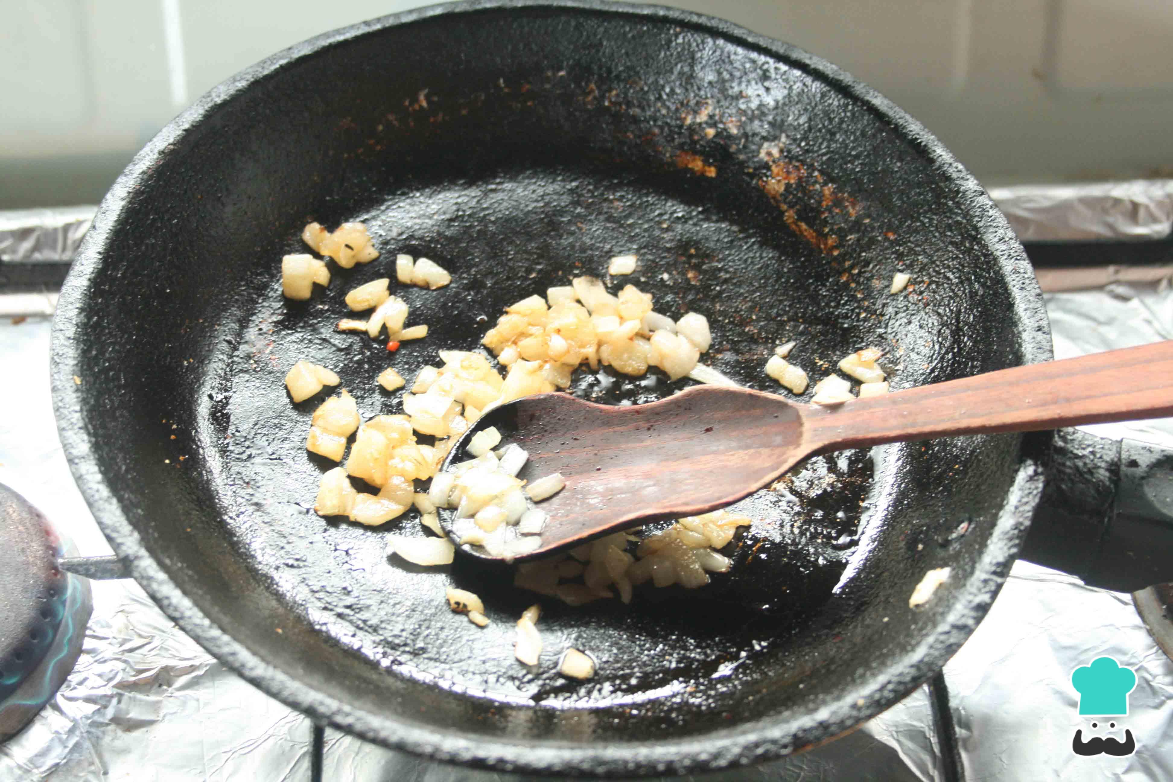 En una sartén, coloca la mantequilla y espera hasta que se derrita un poco. Agrega los ajos machados y las cebollas cortadas en cuadros. Sofríe estos vegetales hasta conseguir que se doren.