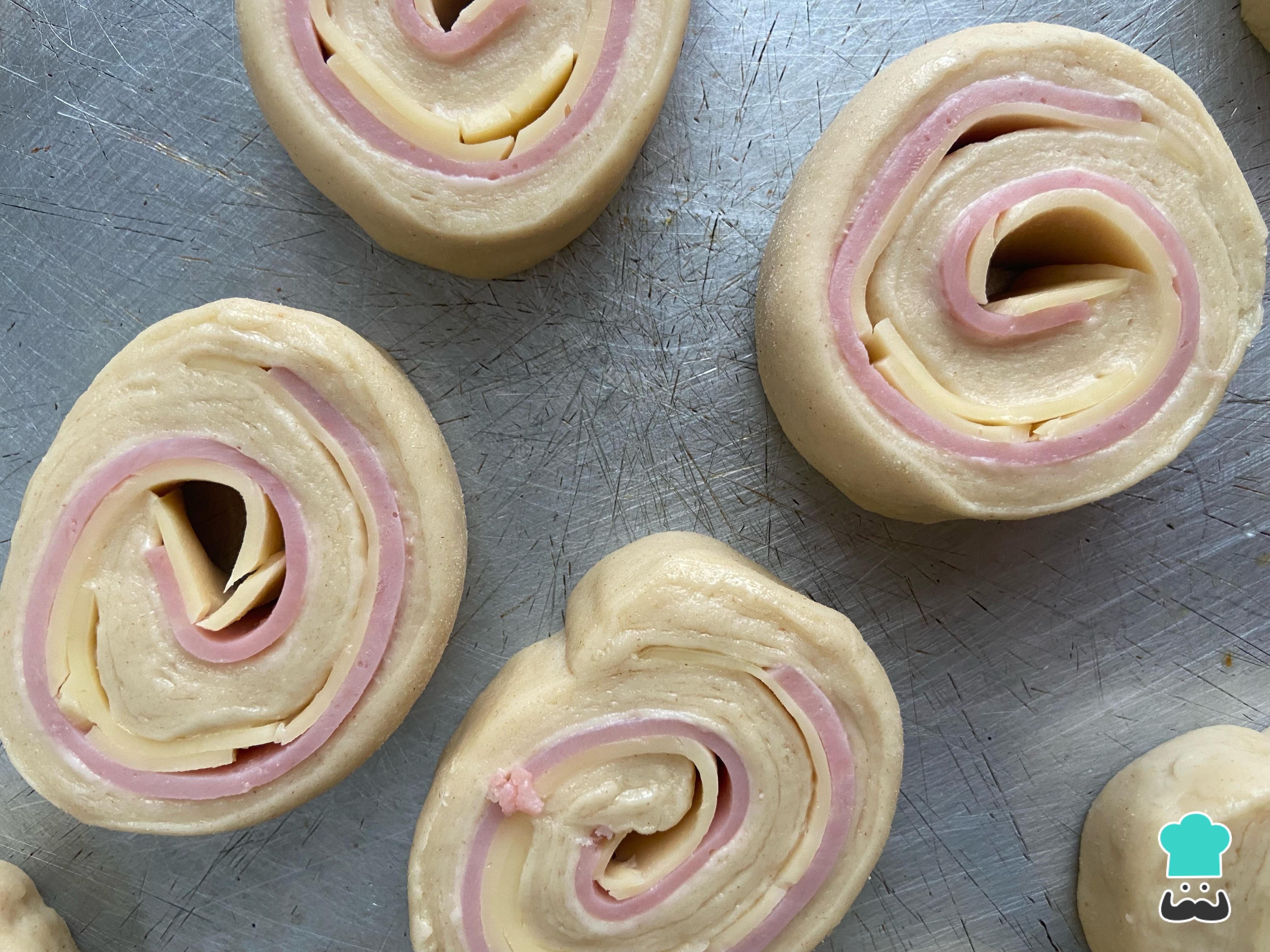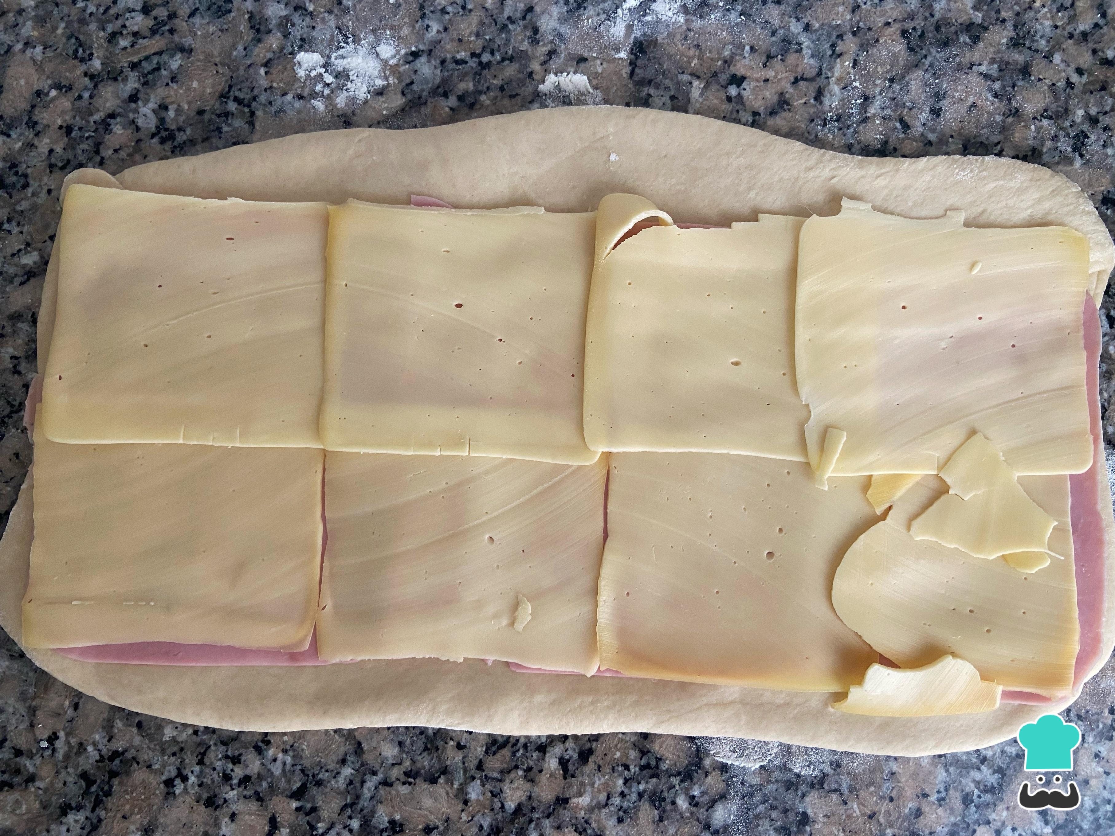 Cuando hayas terminado con el hojaldre, estira la masa de forma rectangular y dejando 1 o 2 centímetros de alto, como has hecho anteriormente. Luego, distribuye el queso y el jamón, dejando los bordes horizontales libres para poder cerrar tus rollitos. Y, si deseas hacer tus piruletas de hojaldre dulces, puedes reemplazar este relleno con azúcar, mermelada, dulce de leche o chocolate en barra picado, entre otras opciones.