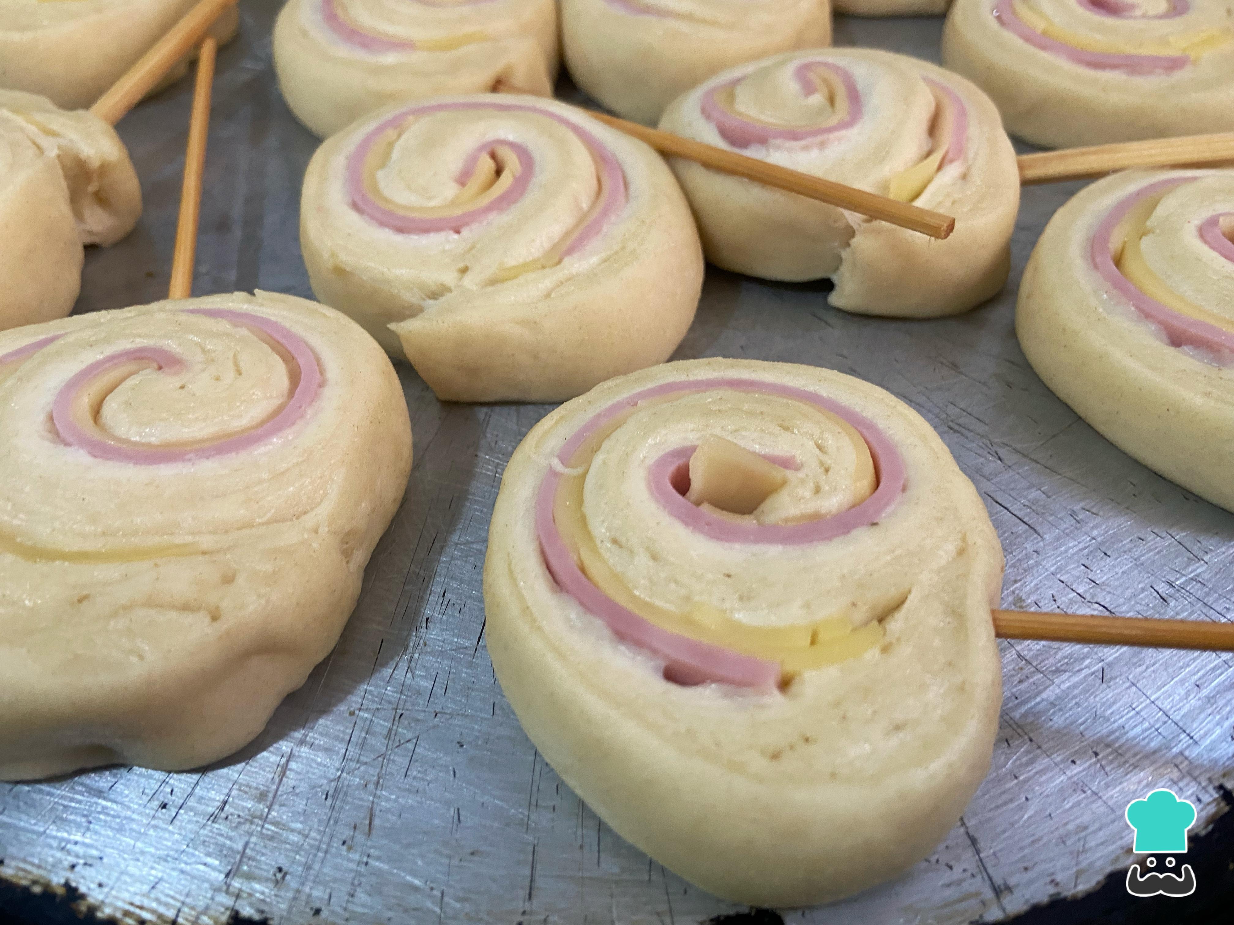 Llévalos a una asadera engrasada, suficientemente separados como para que tengan espacio para leudar nuevamente. Tápalos y déjalos crecer unos 30 minutos más. Mientras, moja los palitos que usarás para tus piruletas de queso y jamón, al llevarlos al horno, no se quemarán. ¿Qué te están pareciendo las piruletas saladas de hojaldre?
