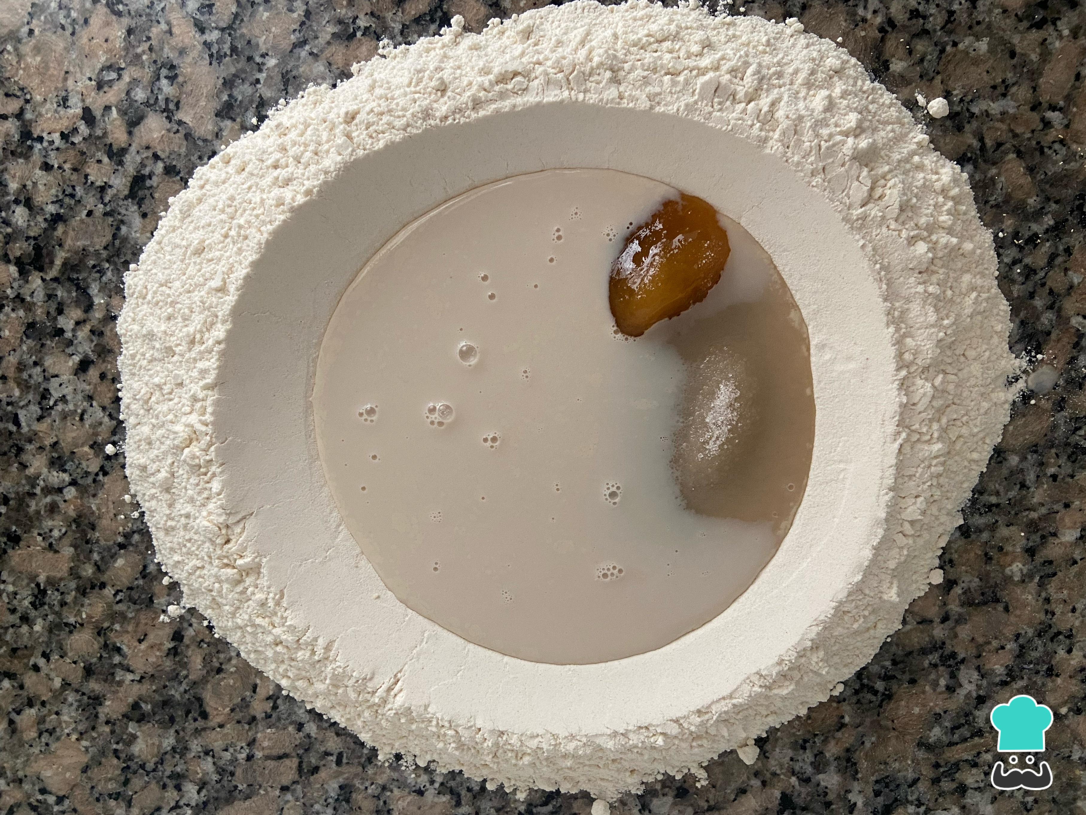 A continuación, vuelca la harina mezclada con la sal sobre la mesada limpia y haz un hueco en el centro. En él, añade la levadura con la leche, el azúcar y la miel. Integra los ingredientes del centro hacia afuera amasando hasta formar un bollo.