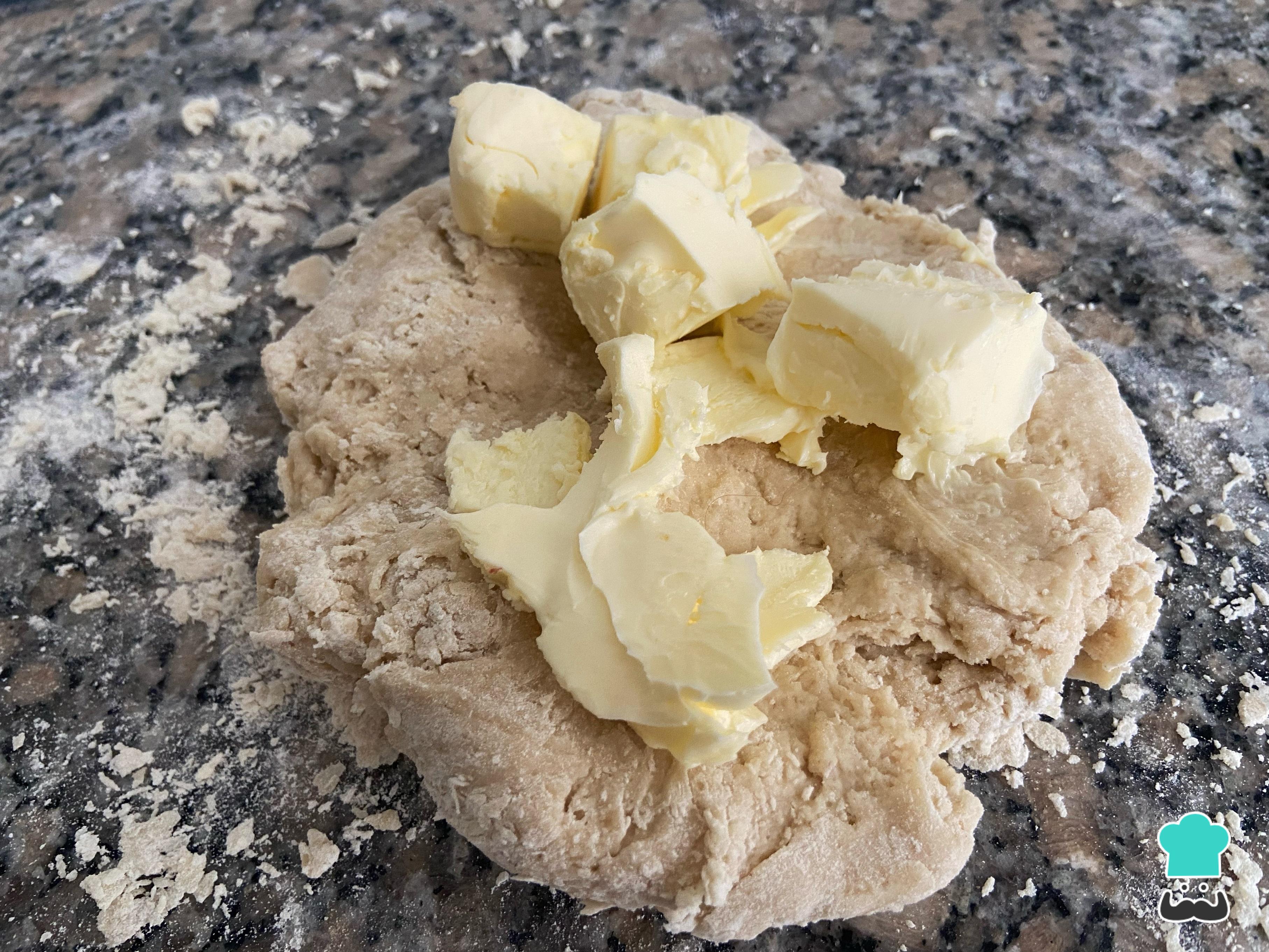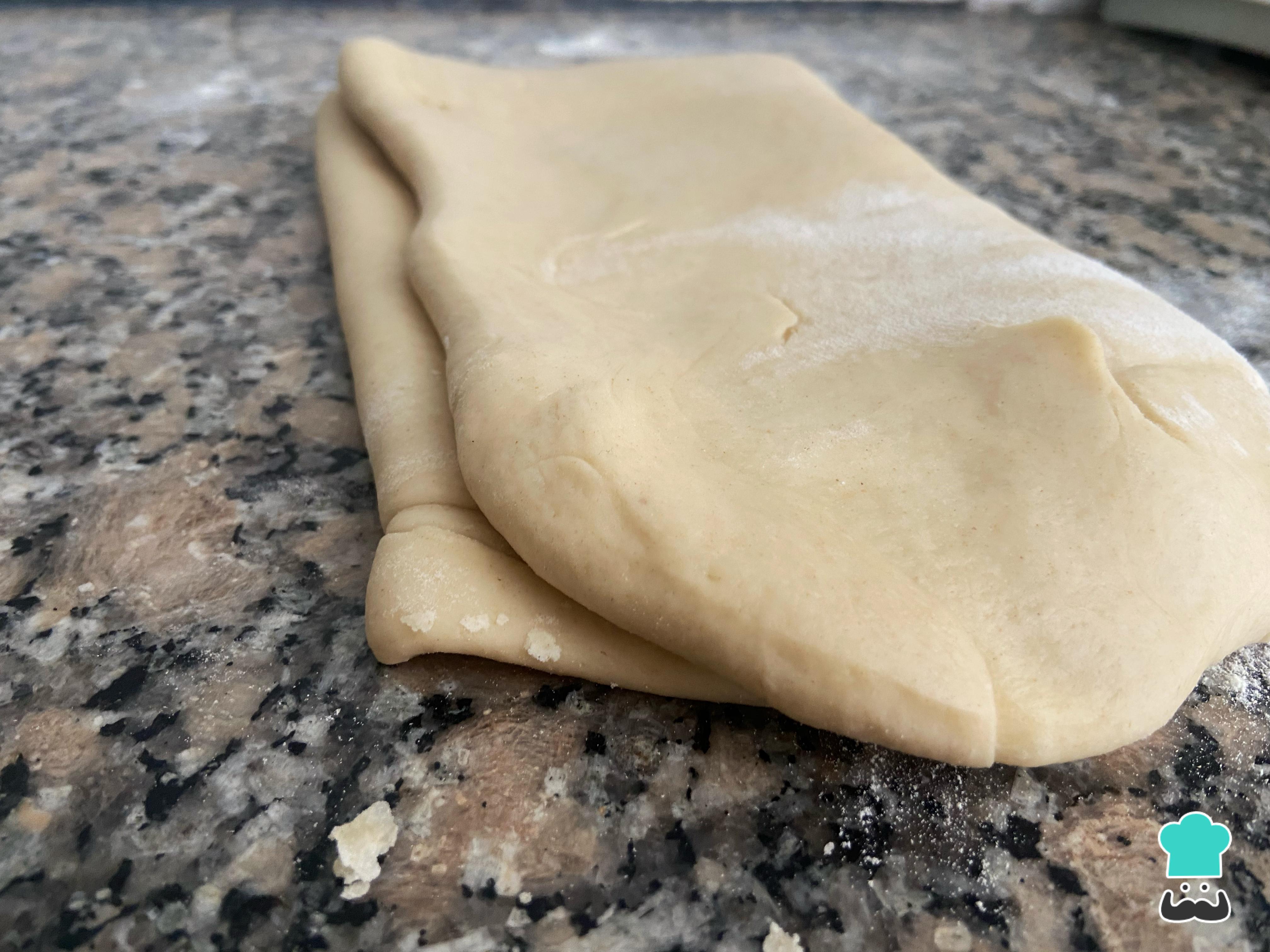 Vuelve a estirar la masa y dóblala en tres, llevando los dos extremos al centro. A continuación, estírala nuevamente, dóblala en dos, estírala y dóblala en tres. Aquí estarás formando el hojaldre. Ten en cuenta que, si se empieza a pegar o romper, puedes guardarla cuidadosamente en una bolsa limpia y refrigerarla antes de seguir.