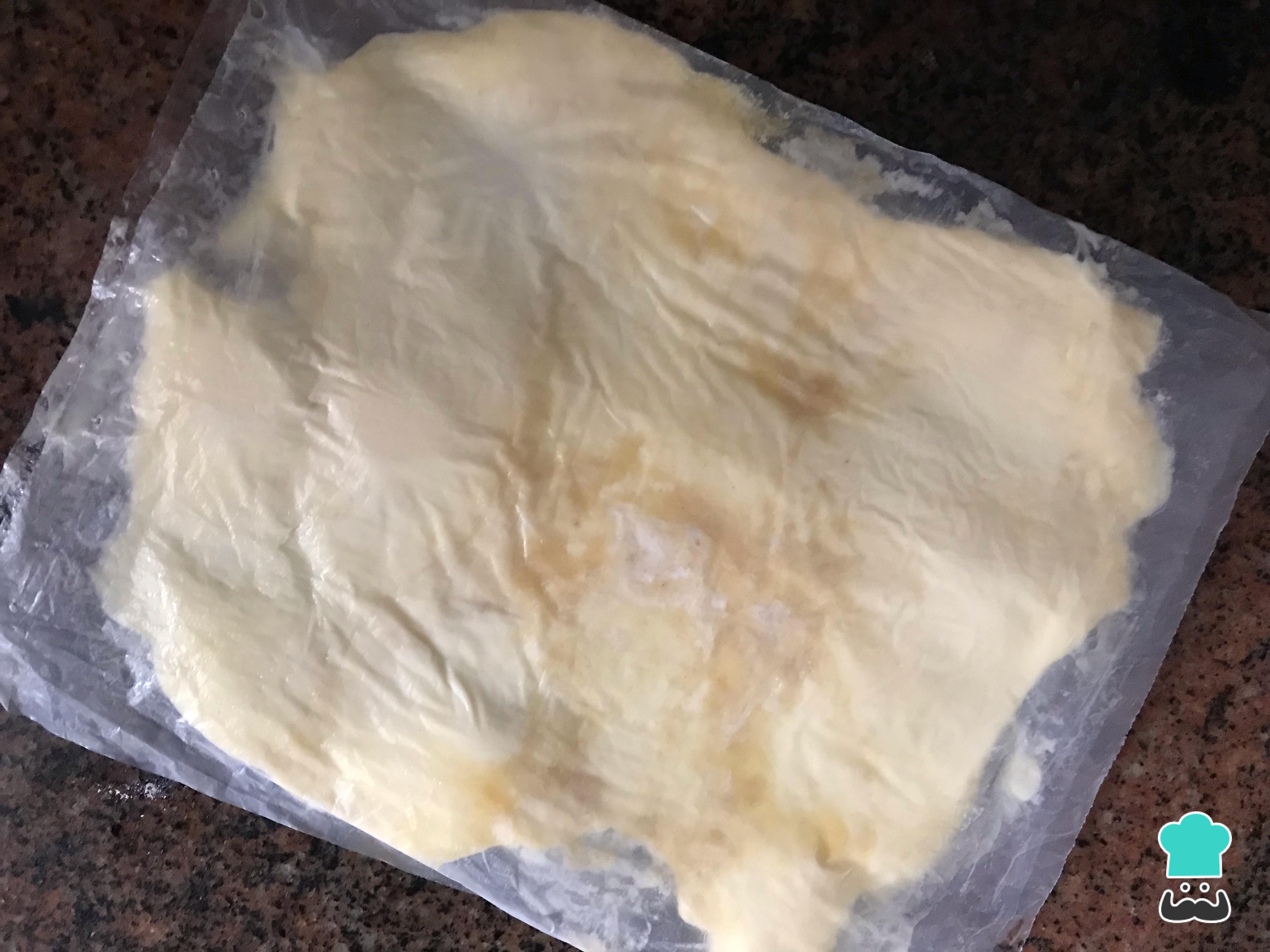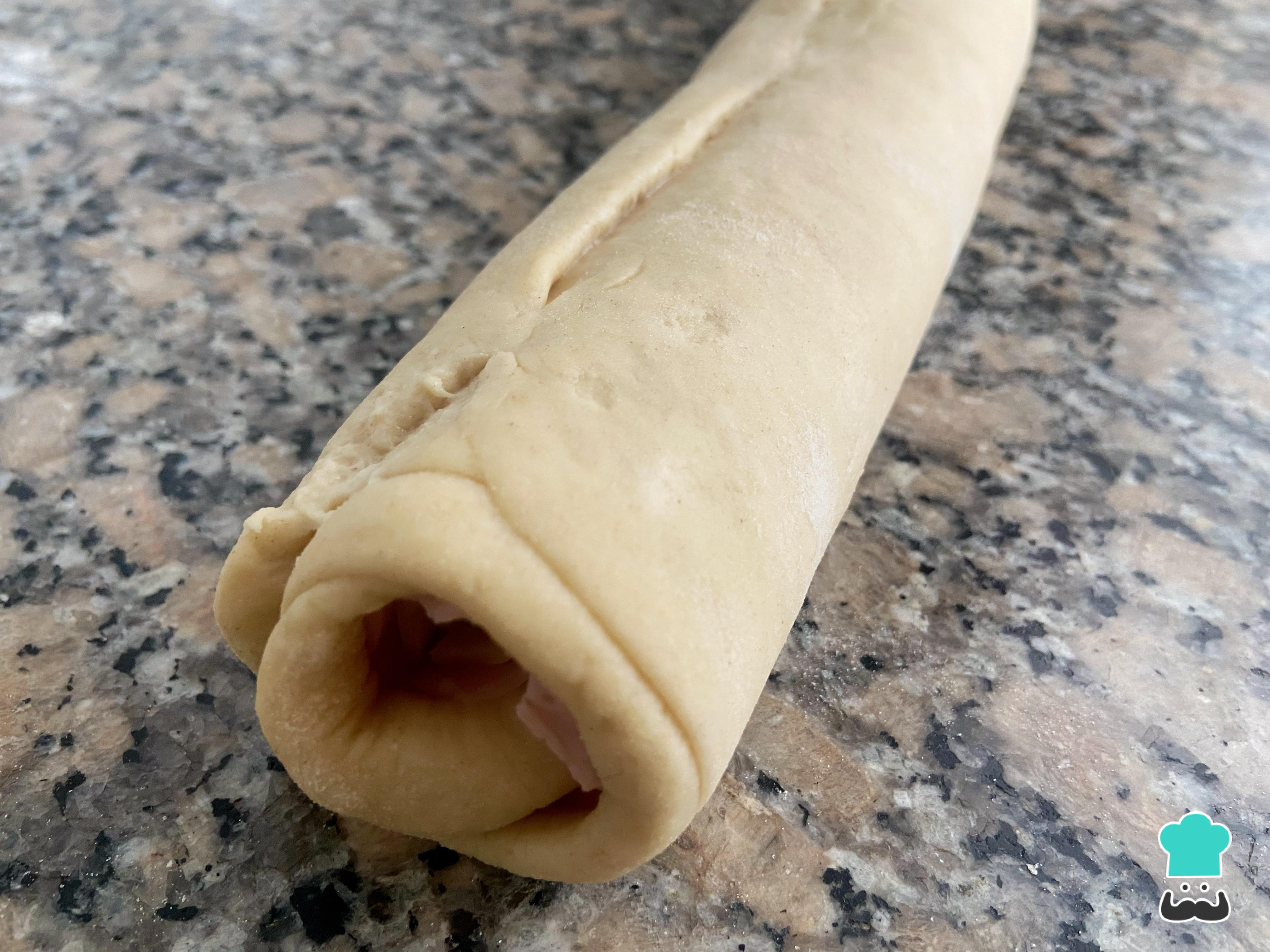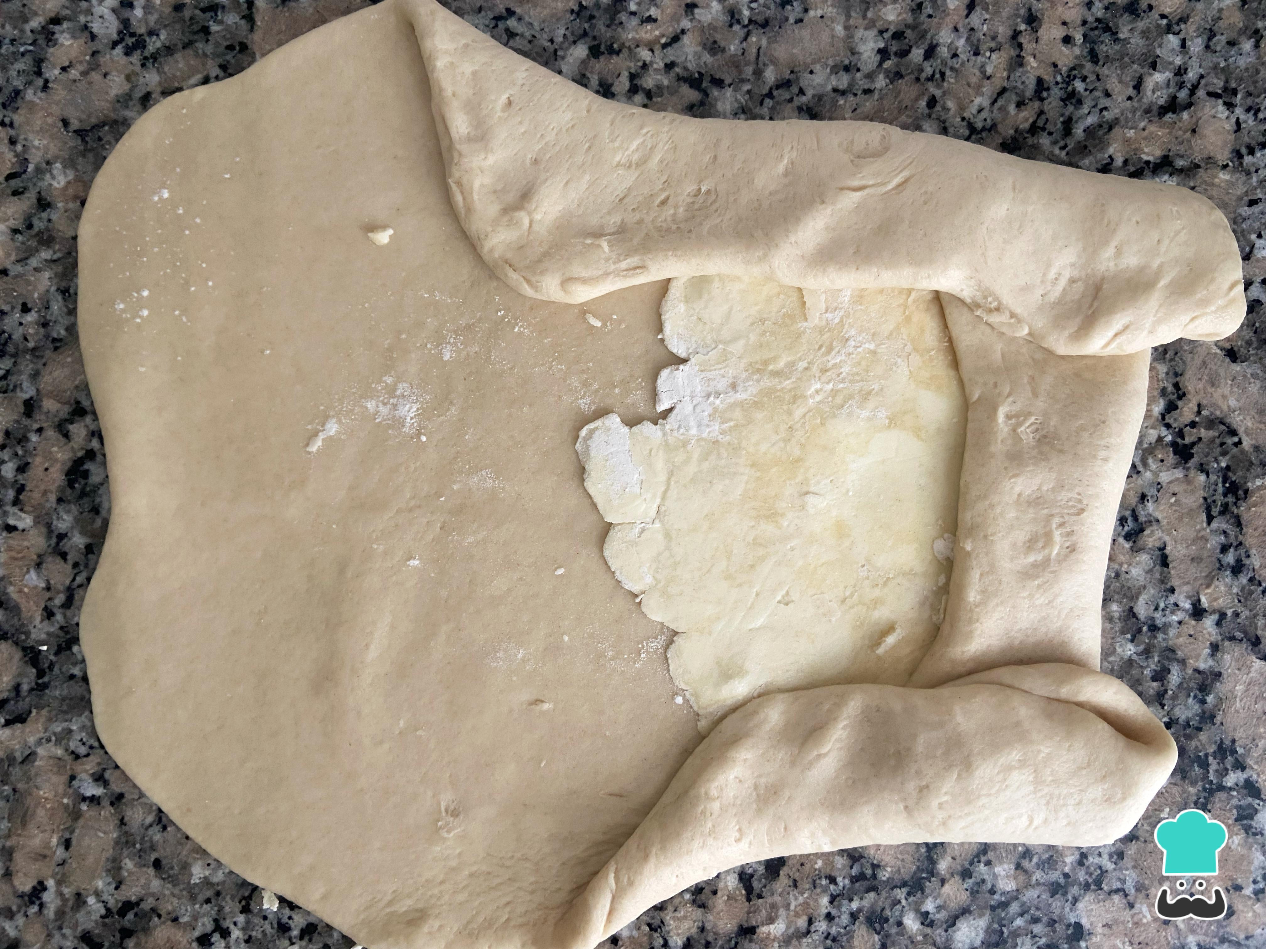 Pasado el tiempo del leudado de la masa, vuélcala sobre la mesada limpia y enharinada. A continuación, estírala de forma rectangular y dejando 2 centímetros de alto. En uno de los extremos, dispón el empaste que has preparado anteriormente y enciérralo con los bordes. Dobla la masa por la mitad.