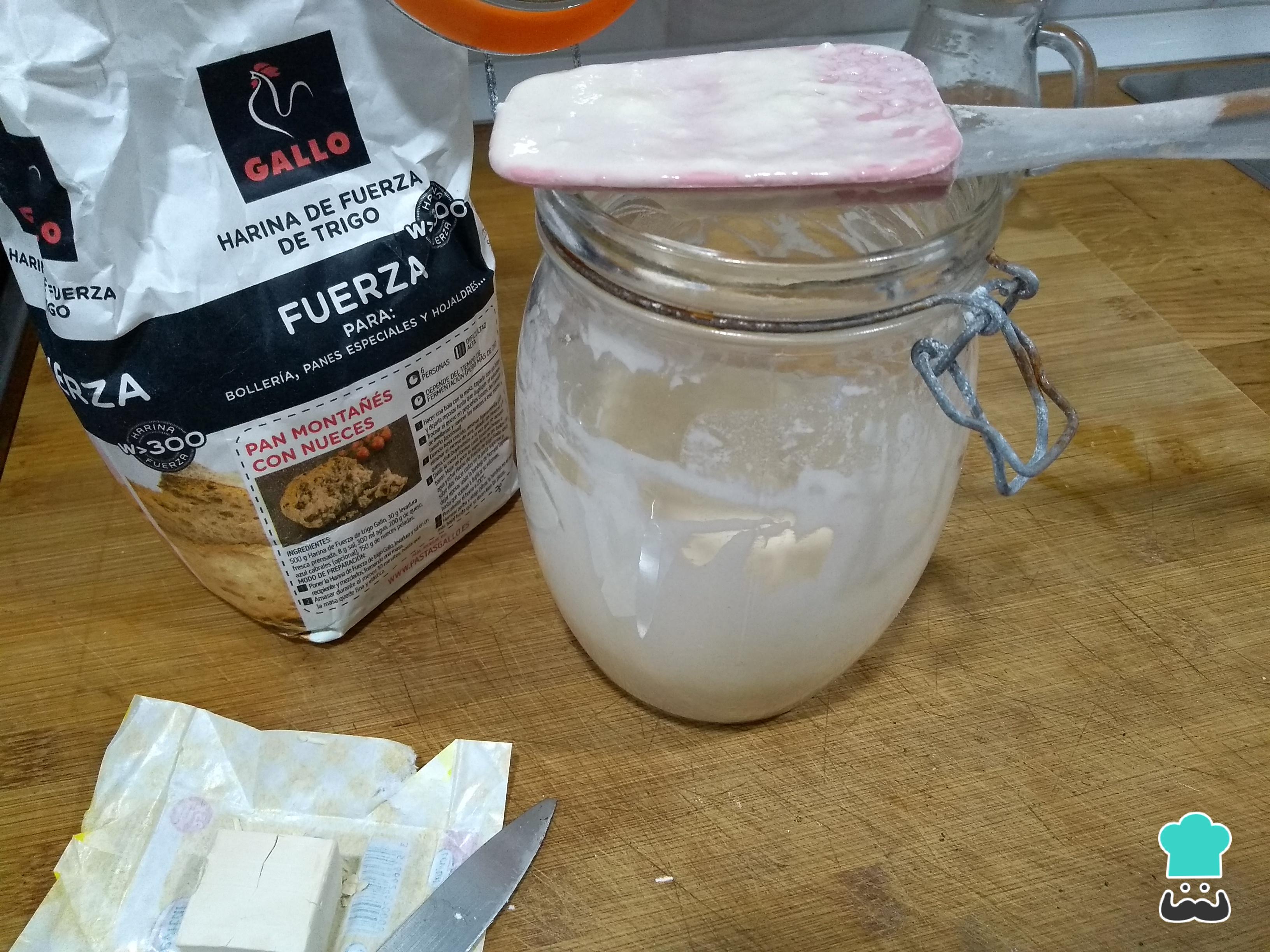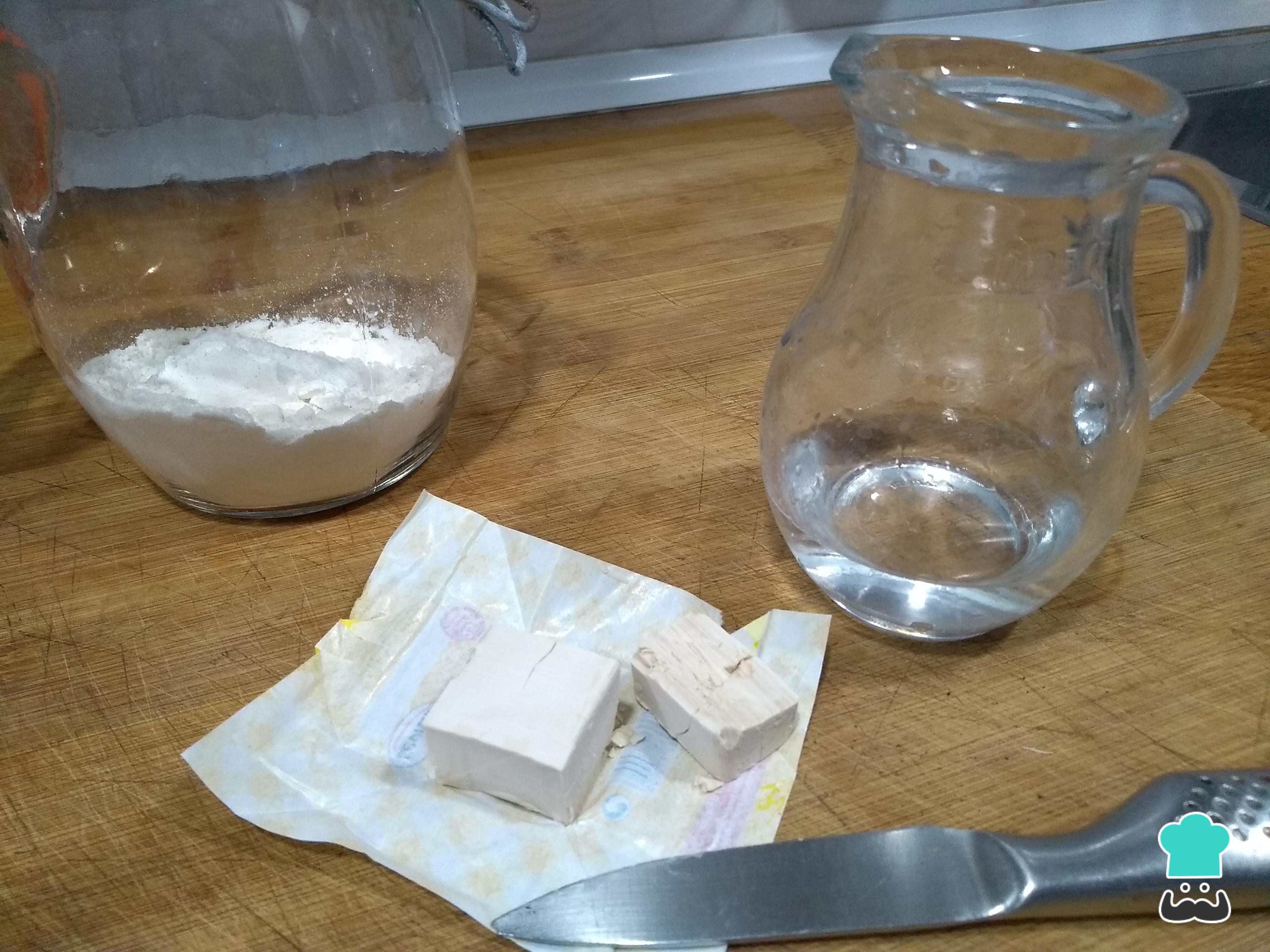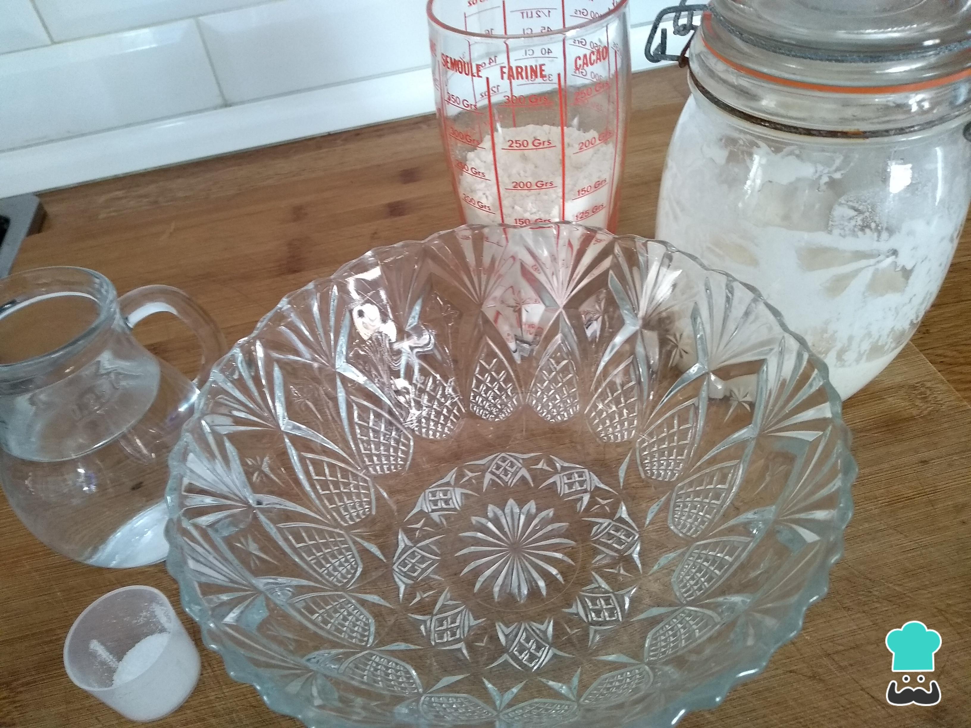 Empieza por la preparación de la masa madre. Para ello, introduce la levadura en unos 100 decilitros de agua tibia.
