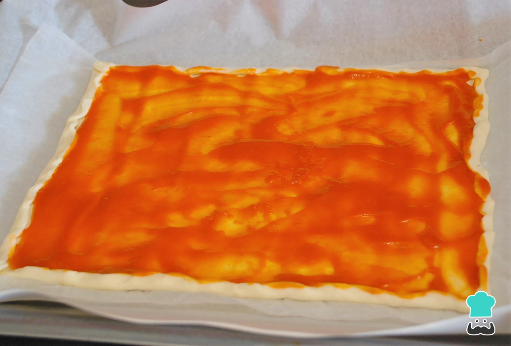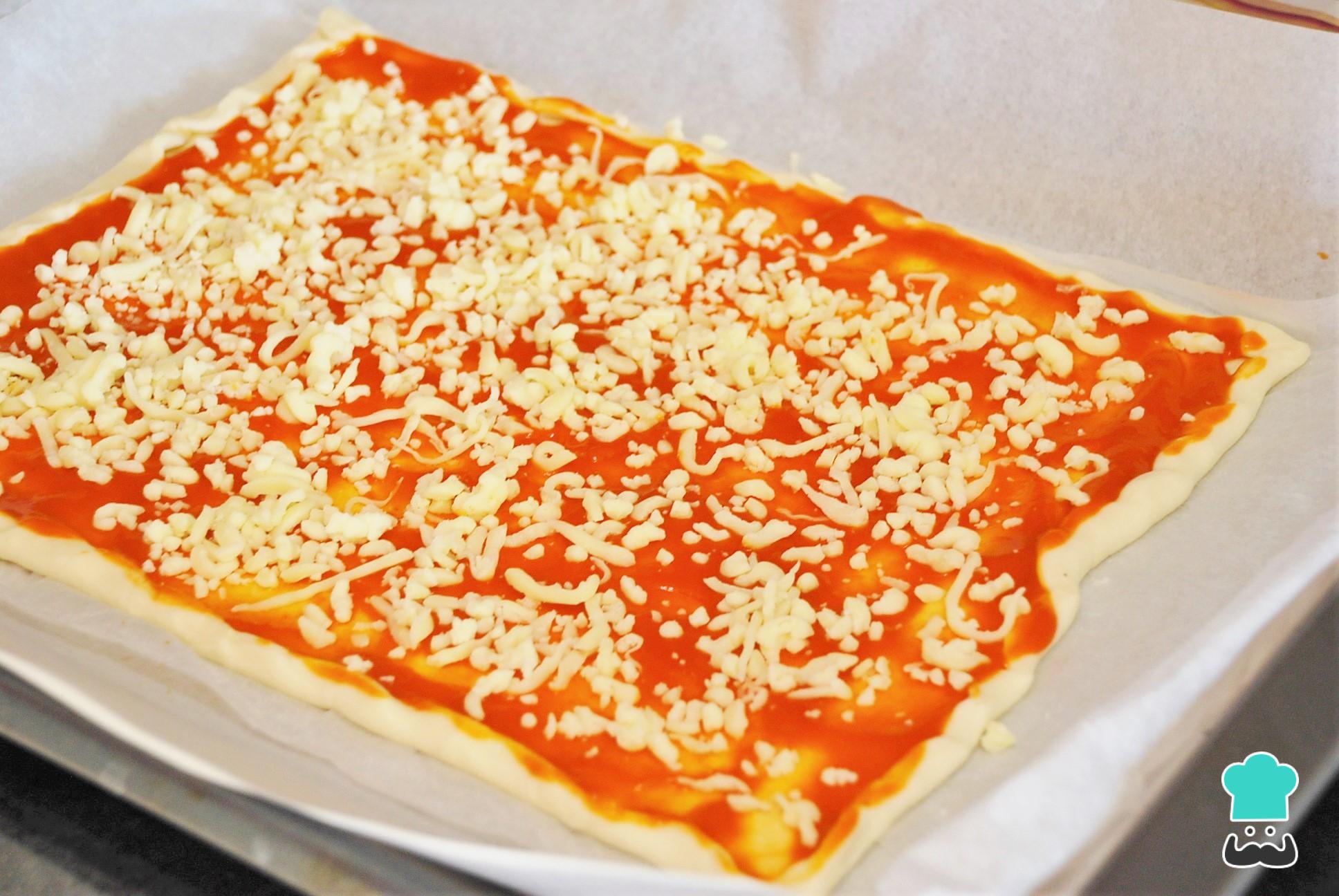 Para preparar esta pizza casera empezaremos por extender la mesa y cubrir con la pasta de tomate. Aquí tienes algunas recetas adicionales que te pueden servir si quieres hacer una pizza totalmente casera: