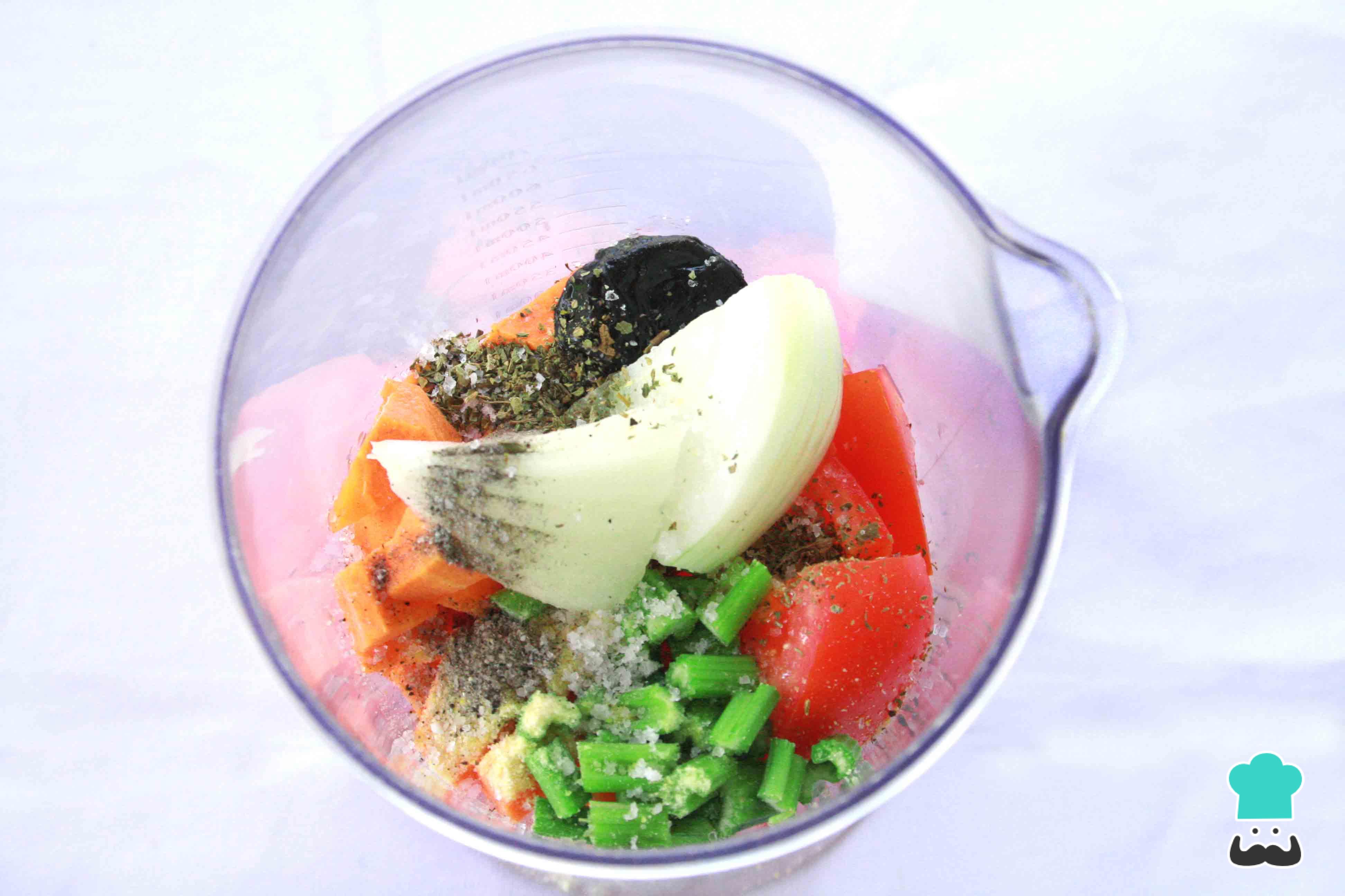Para preparar la salsa tritura el pimentón, la cebolla, la ciruela pasa, la miel de piloncillo, las zanahorias, el celery (apio) y el orégano. Salpimienta al gusto.