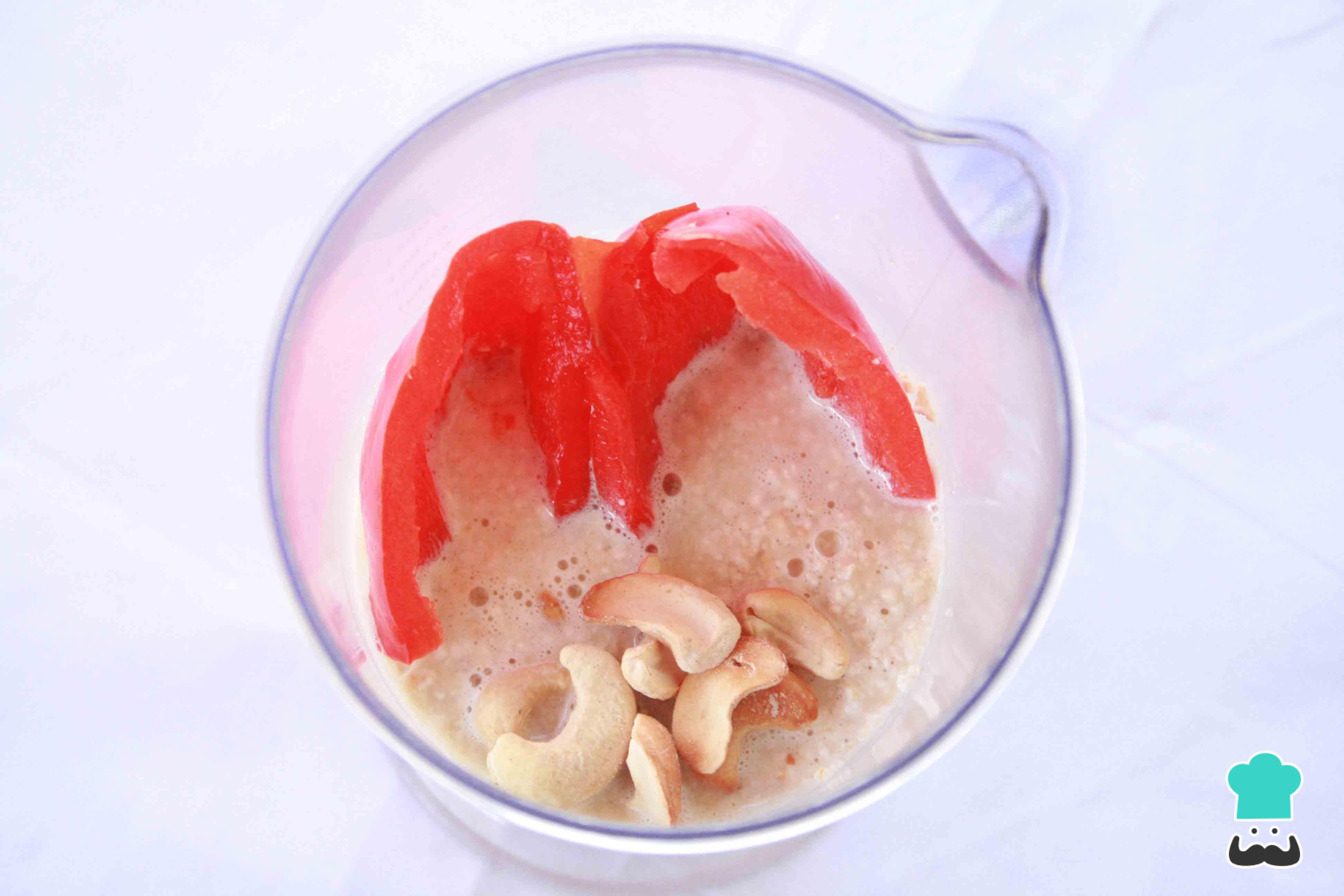 Para elaborar el queso procesa los marañones, el pimentón y la avena. Opcional: puedes añadir levadura nutricional. Agrega sal al gusto.