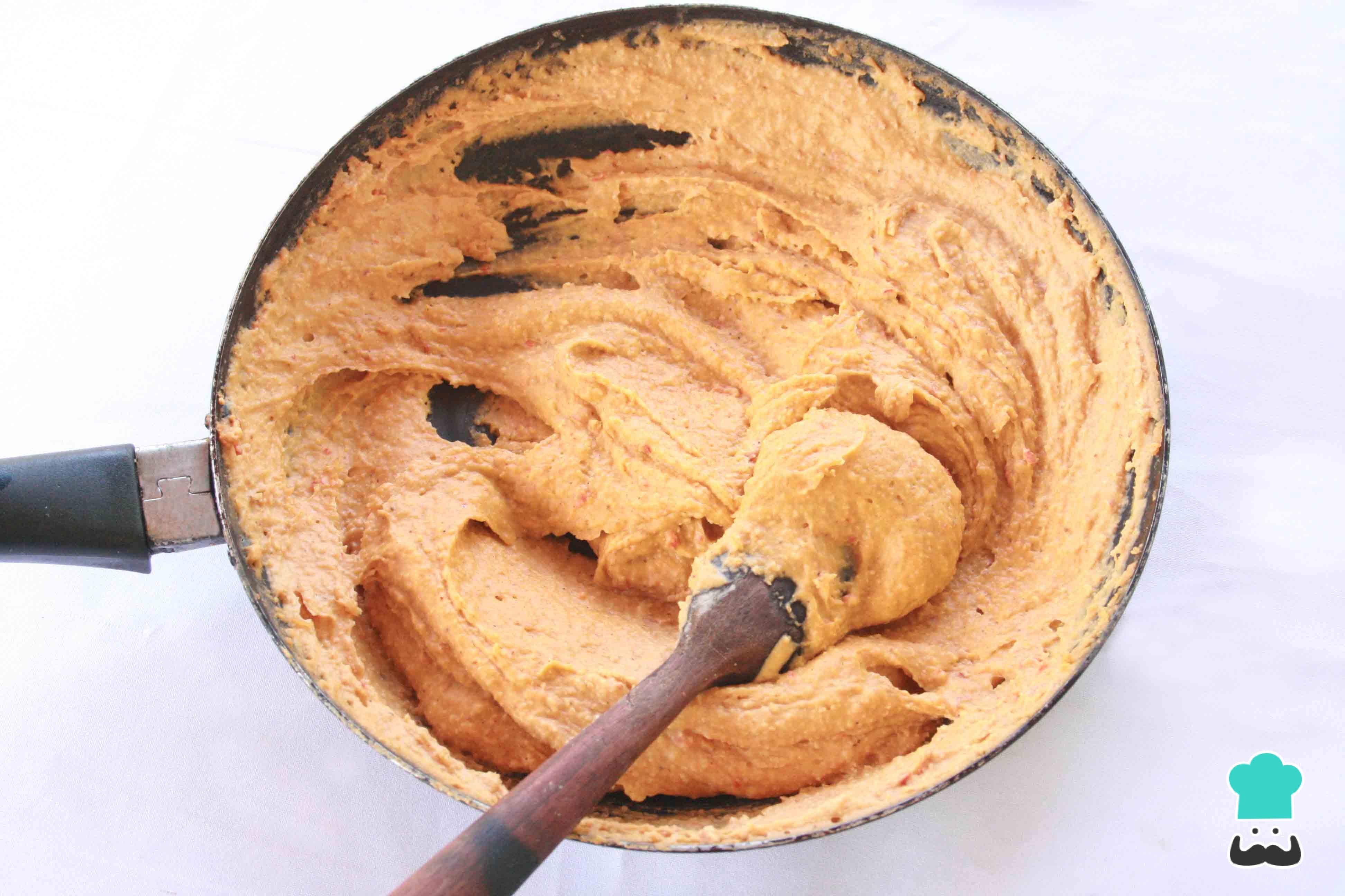 Incorpora en otra sartén los ingredientes del queso ya triturado anticipadamente. Añade 2 ajos machados. Remueve constantemente hasta que espese.