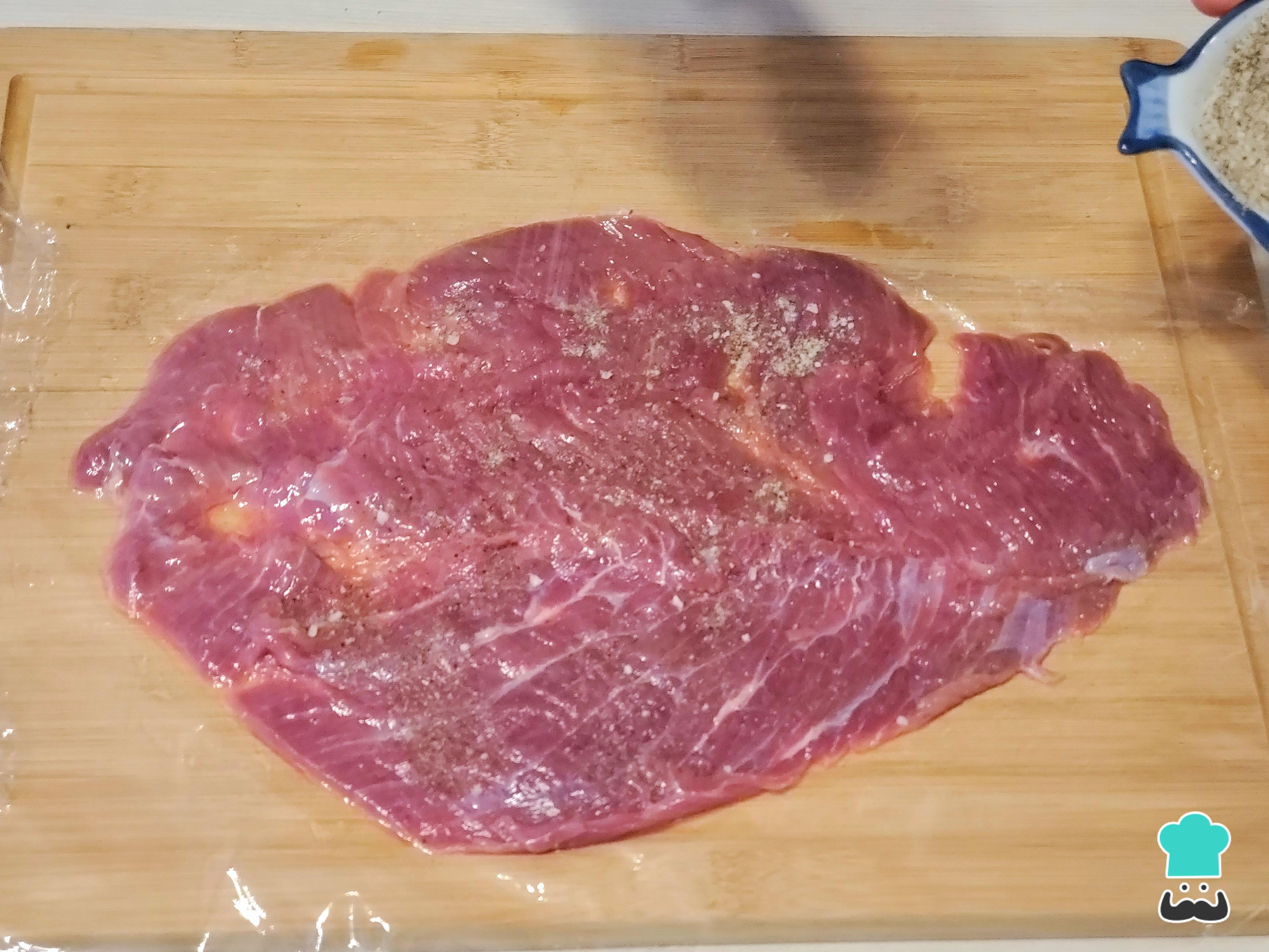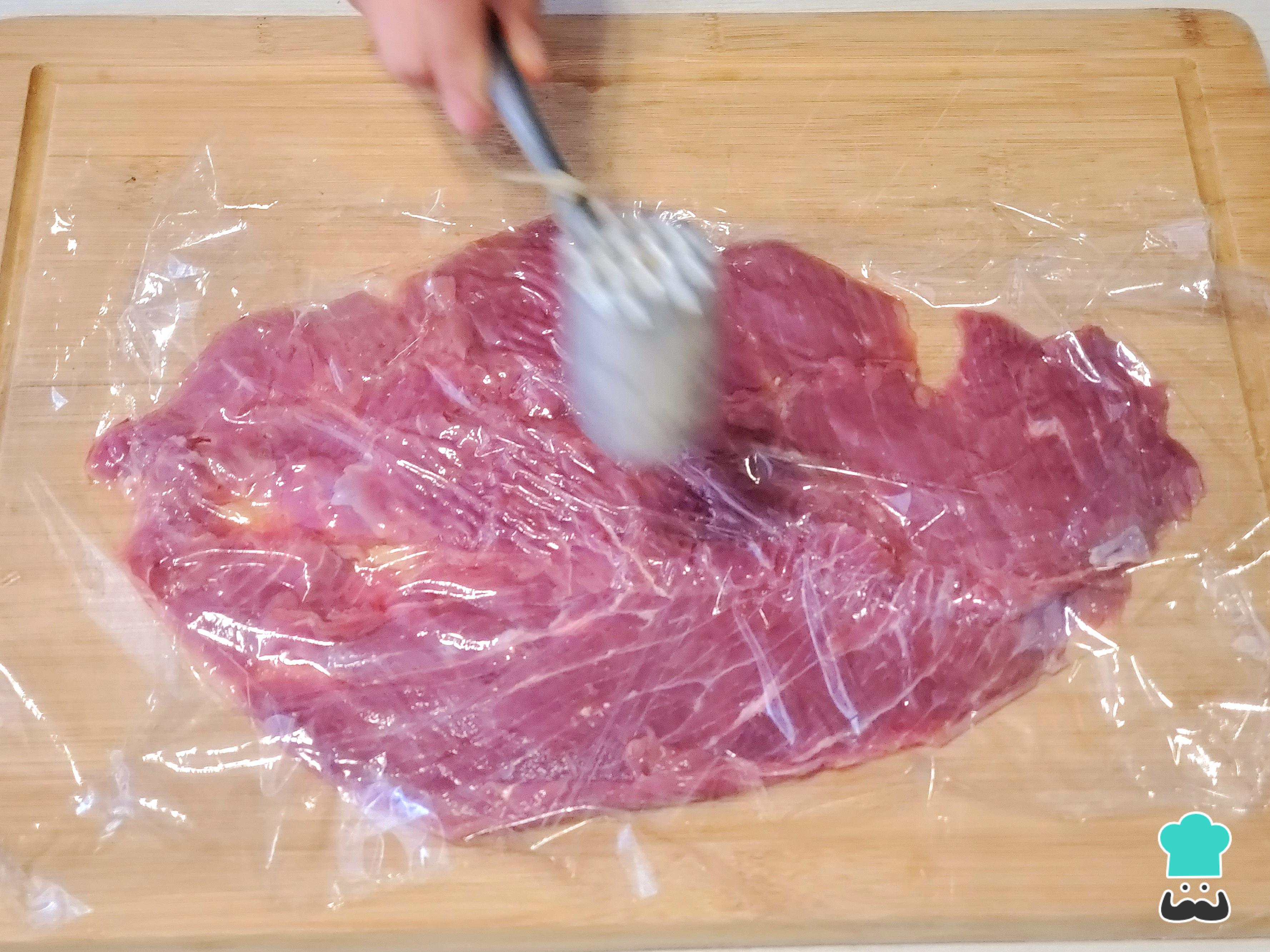 Empieza preparando las milanesas que serán la base de esta pizza sin masa. Aplasta o golpea los churrascos para que queden más suaves y planos. Coloca una hoja de film sobre la carne antes de golpearla, y si estás usando varios cortes pequeños, puedes unirlos intentando formar un círculo.