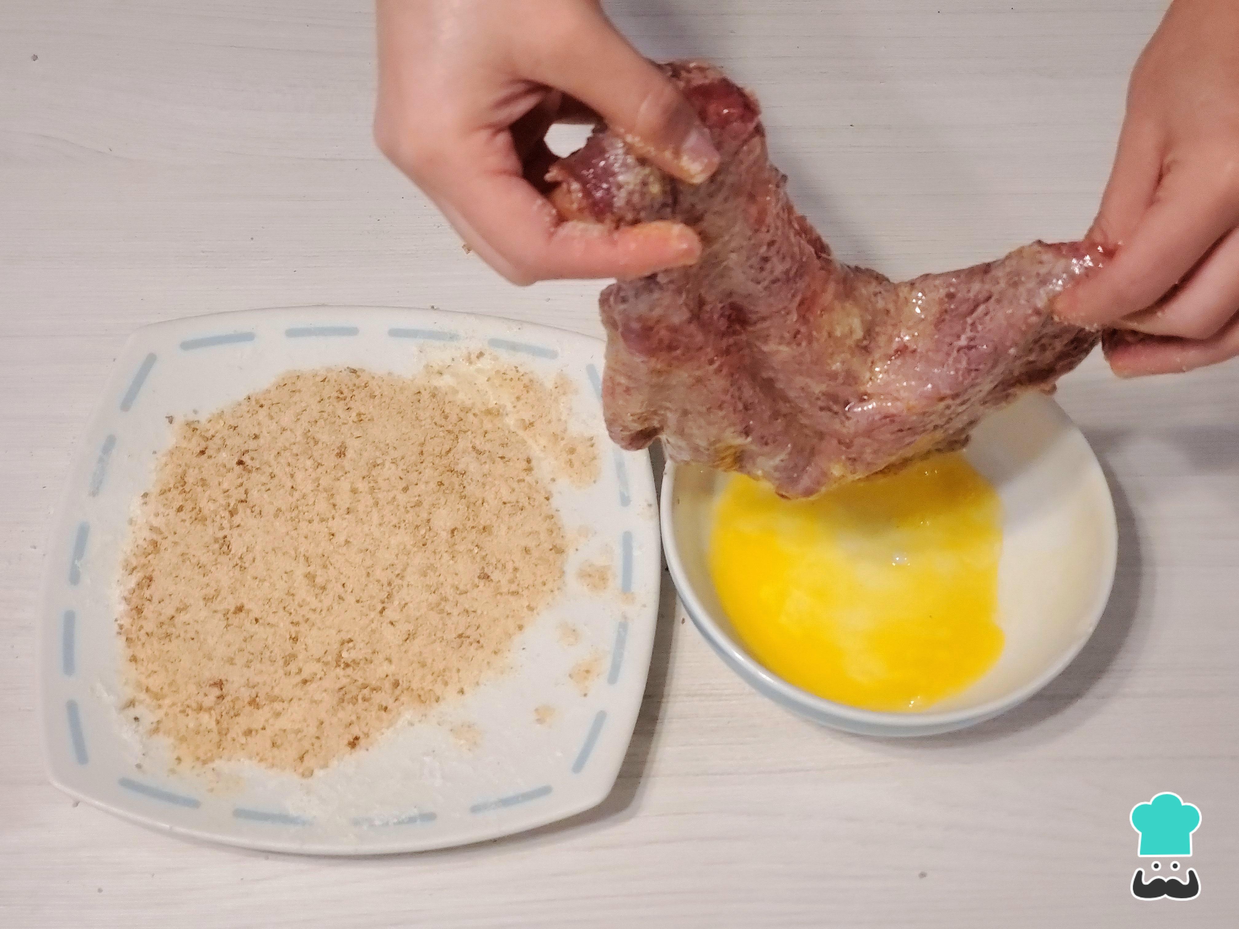 Condimenta los filetes con sal, pimienta, mostaza, ajo molido y hierbas como perejil. Luego pásalos por huevo batido, asegurándote de cubrir ambos lados.