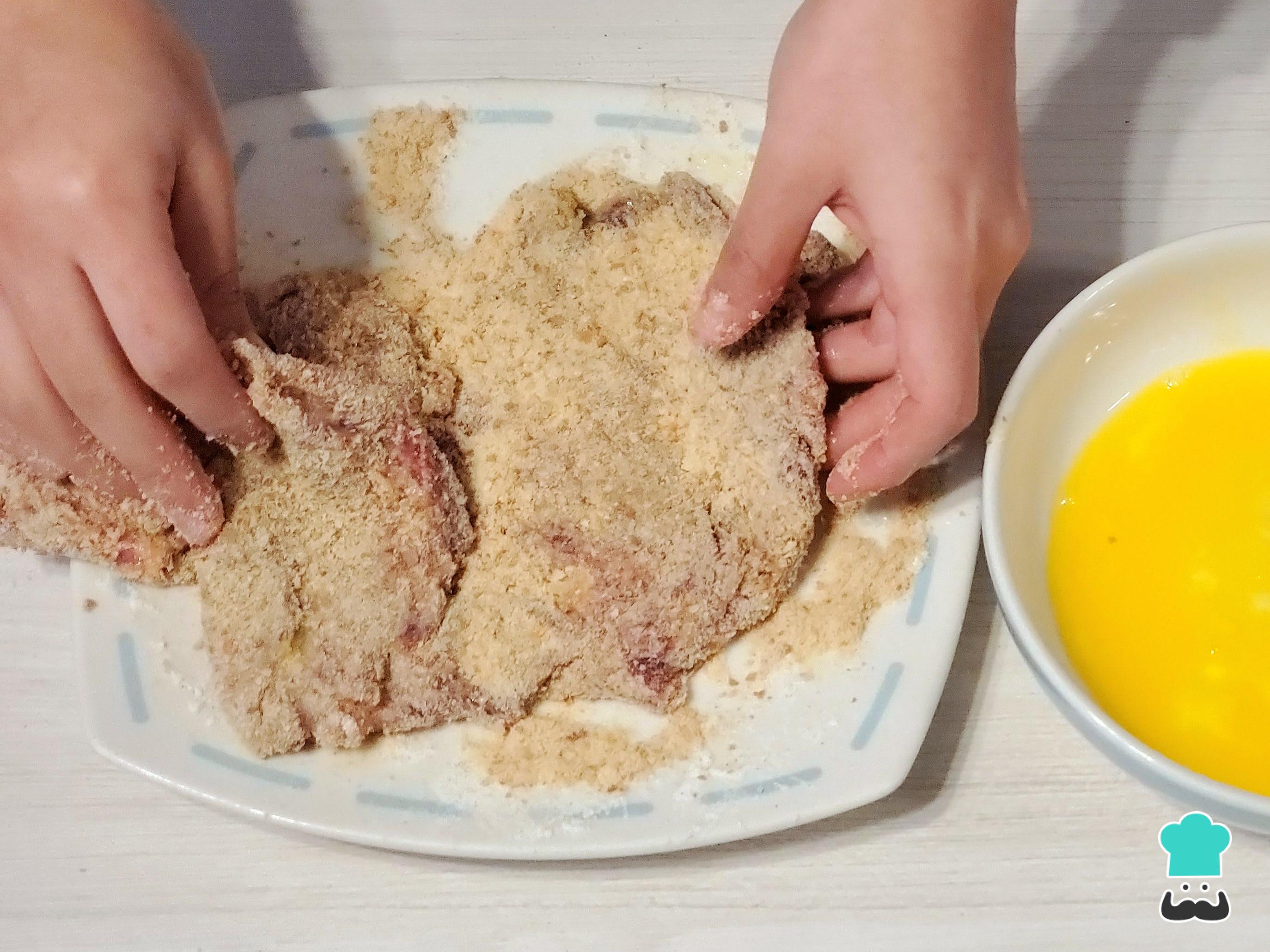 Empaniza de inmediato, presionando sobre una bandeja con pan rallado. Cúbrelo bien, levanta y sacude para retirar el exceso.
