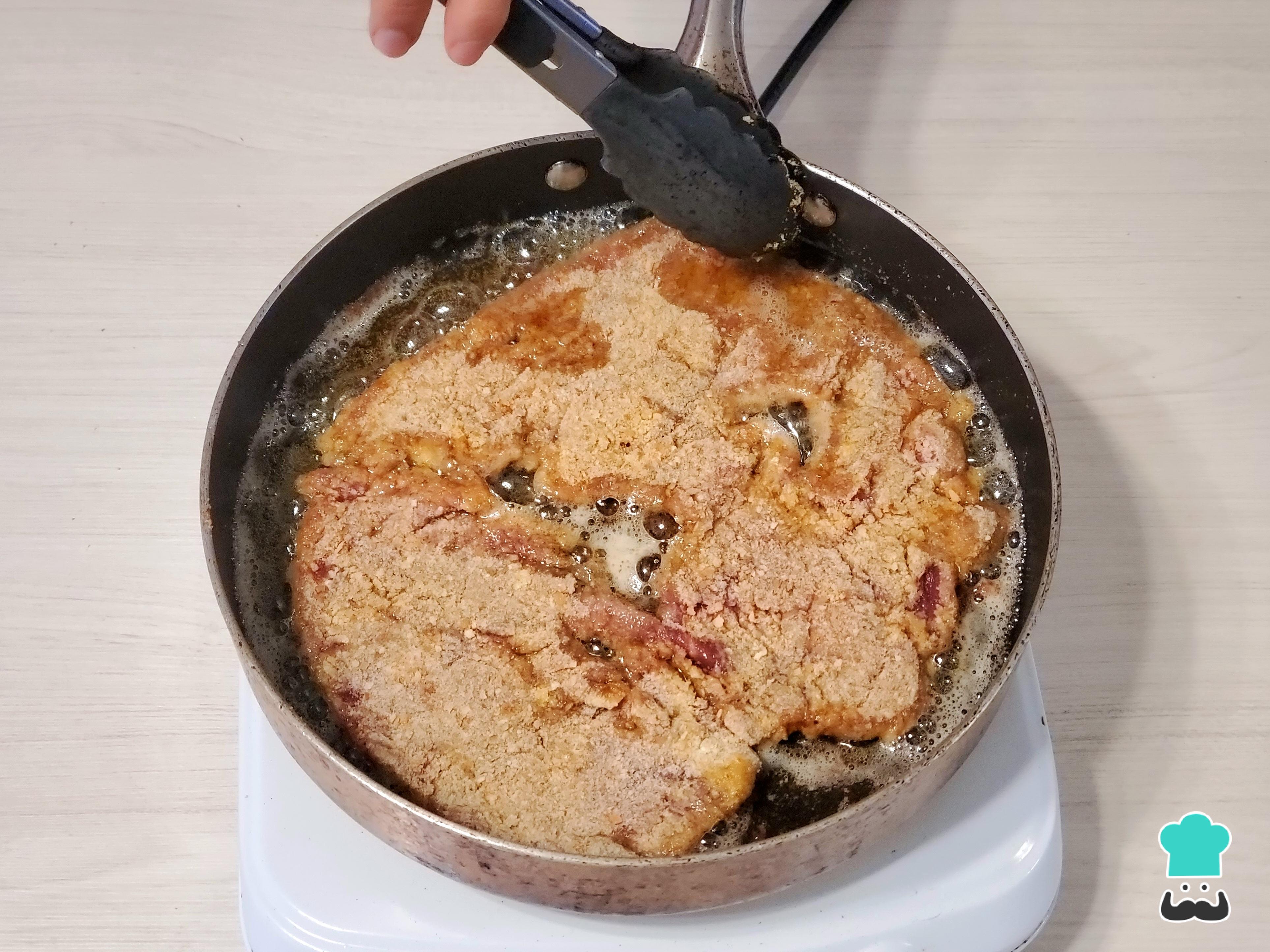 Fríe la milanesa en una sartén grande con abundante aceite caliente. Cuando la base esté dorada, da la vuelta con cuidado y deja que el otro lado también se dore.