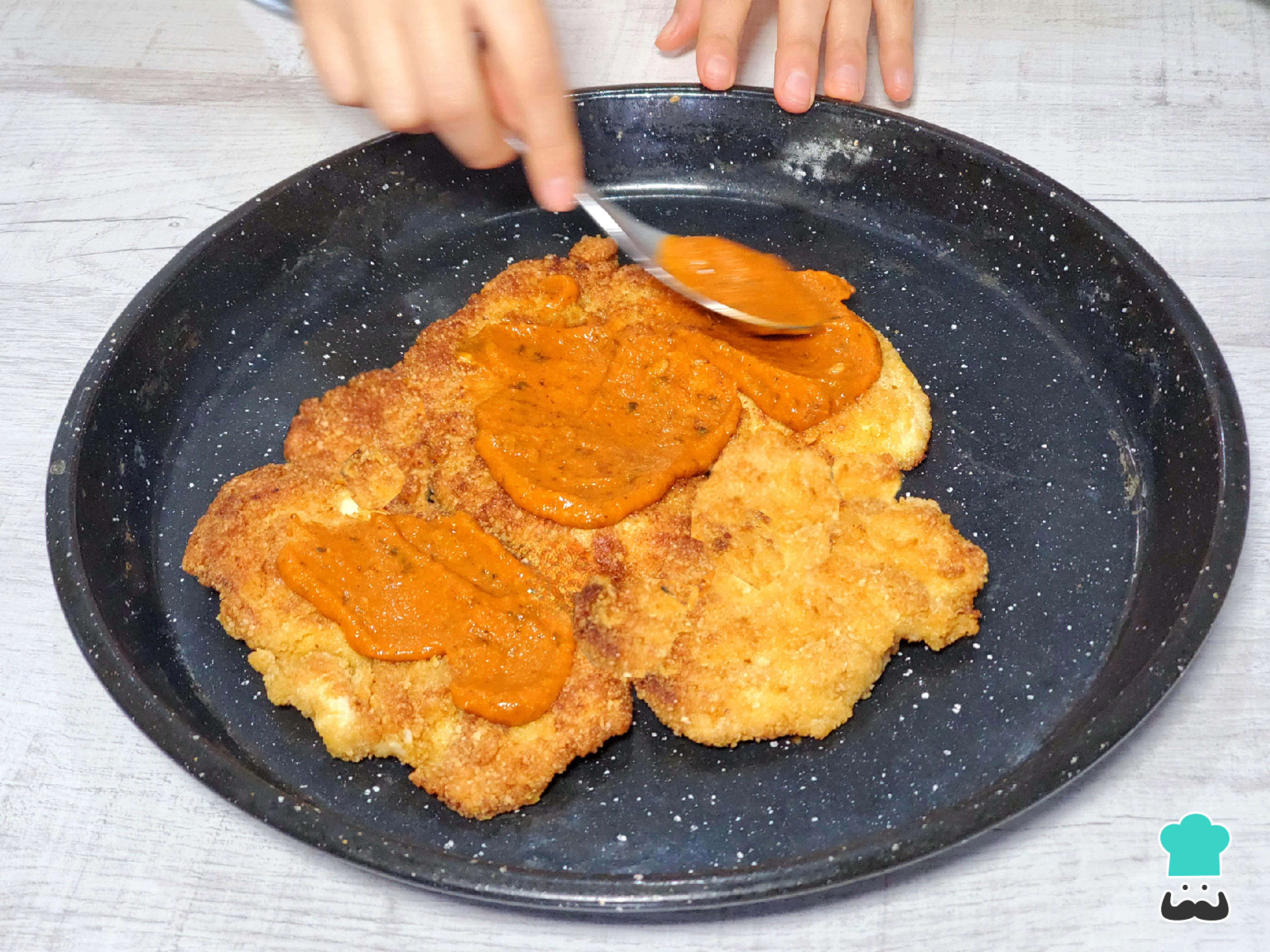 Coloca la milanesa sobre una placa y cubre con salsa de tomate. Esparce bien. Si preparaste varias milanesas pequeñas, puedes juntarlas dándoles forma circular.