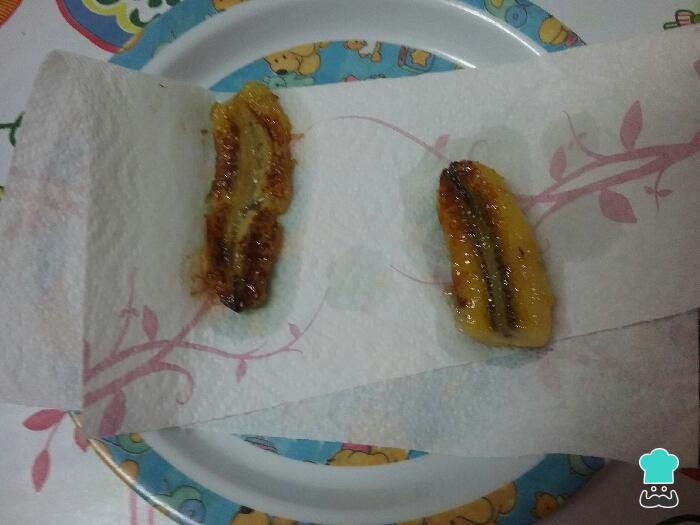 Finalmente, retiramos el plátano frito de la sartén y lo ponemos en un plato con papel de cocina para eliminar el exceso de grasa y aceite.