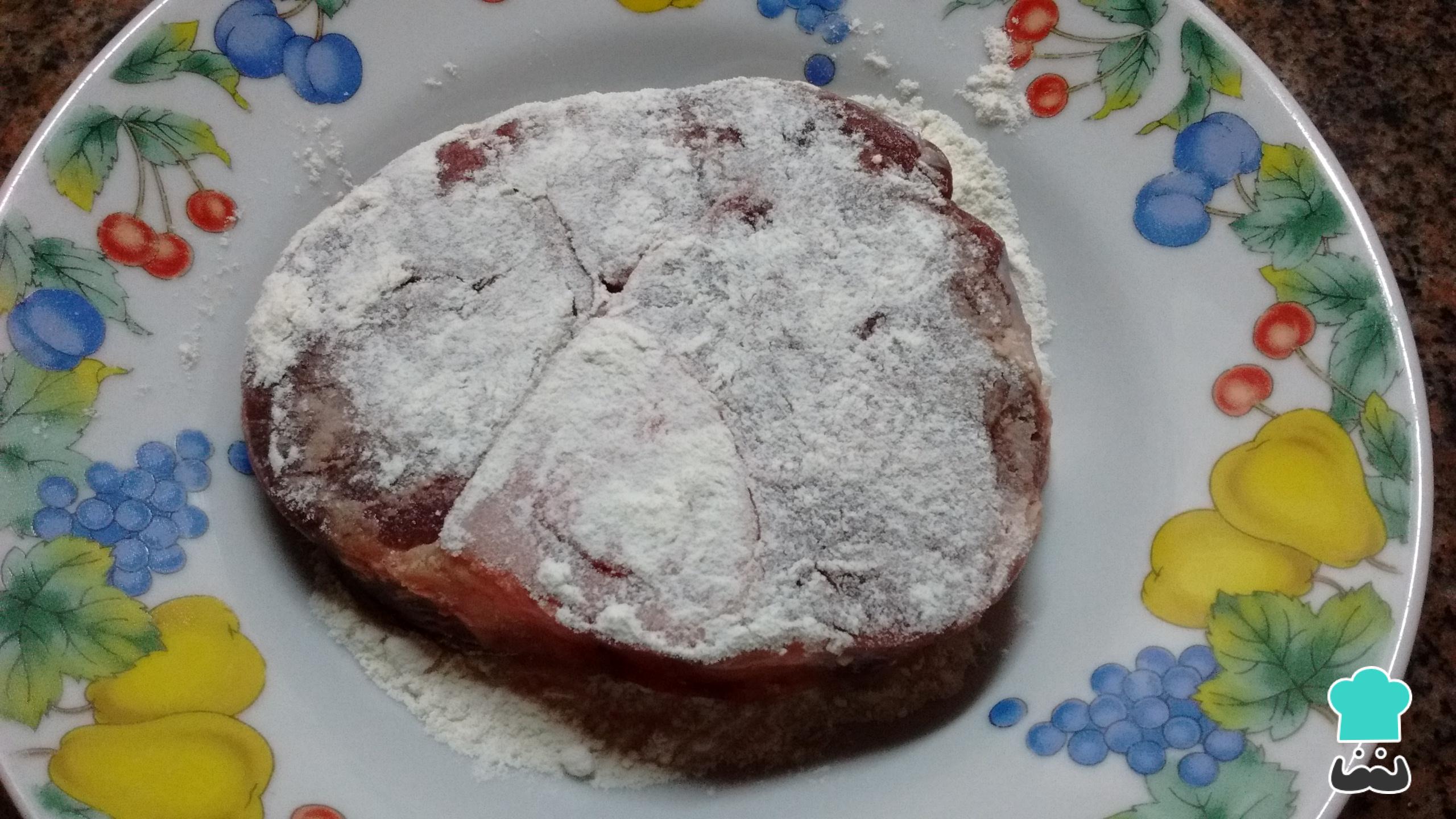 El primer paso para hacer la polenta con osobuco es rebozar las rodajas de osobuco en la harina. Este punto es clave para proporcionar un gran sabor, consistencia y jugosidad a la carne. La sellaremos para guardar los jugos dentro de ella y la harina le dará cremosidad al fondo de cocción.