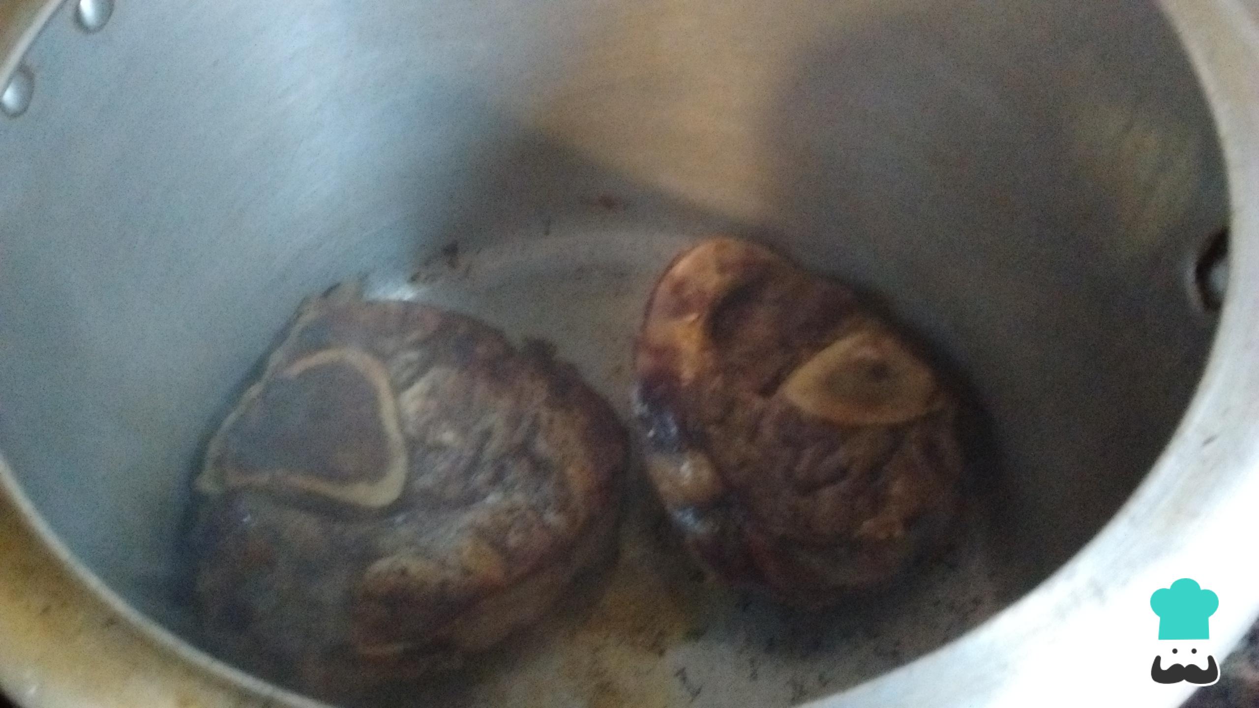 Calienta la olla a presión con 1 cucharadita de aceite. Cuando esté bien caliente, agrega las rodajas de osobuco y dóralas por ambos lados. Si haces más rodajas de las que entran en el fondo, haz este paso en etapas para que cada una se dore completamente. Aquí no buscamos cocinar la carne, solo dorarla.