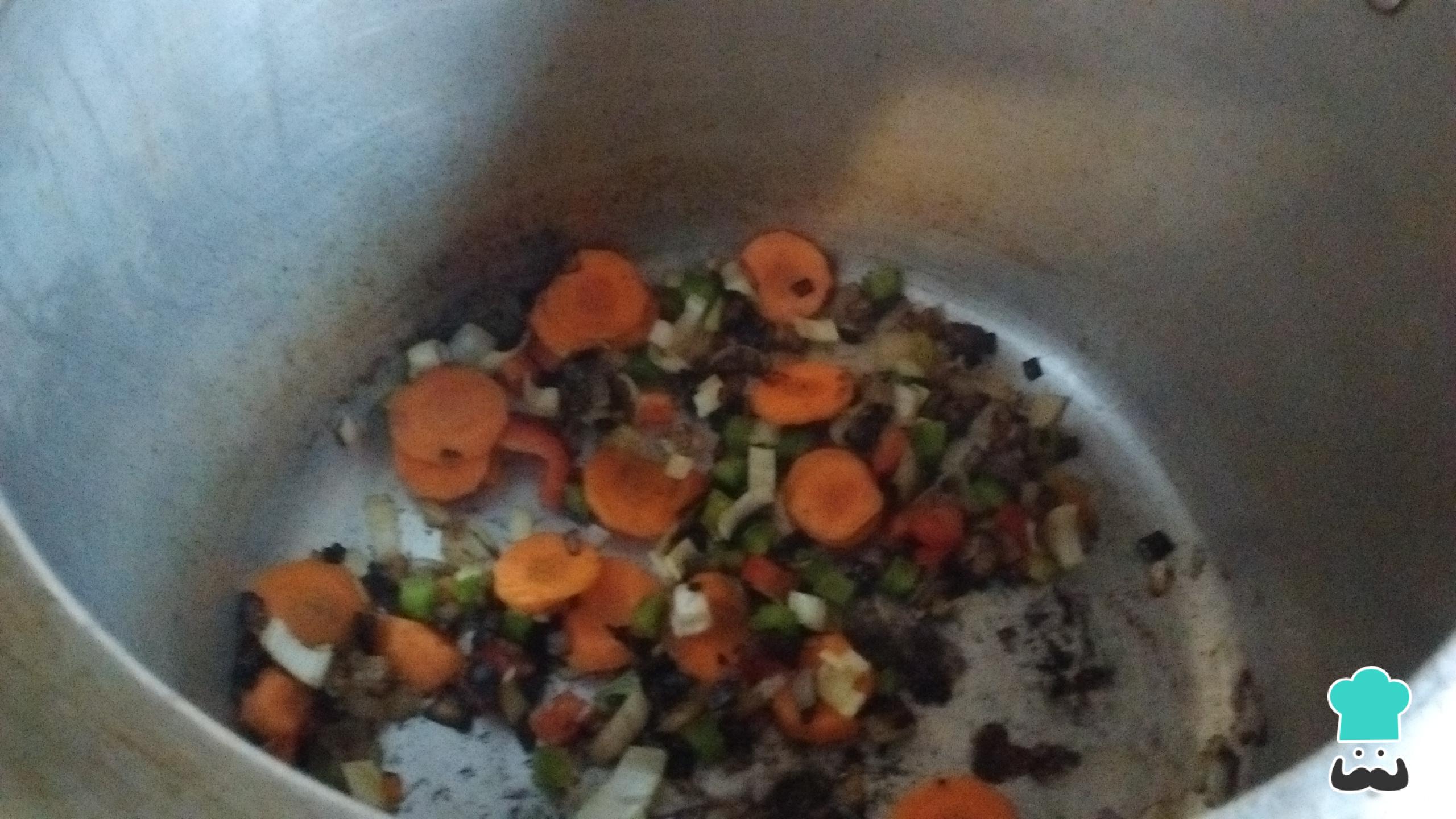 Cuando la cebolla esté dorada, agrega el puerro y los morrones limpios y picados sin su parte blanca ni semillas, junto con la zanahoria pelada y cortada en rodajas. Agrega agua caliente a cucharadas cada vez que el salteado lo necesite. Solo buscamos dorar las verduras para que tomen sabor, se cocinarán luego.