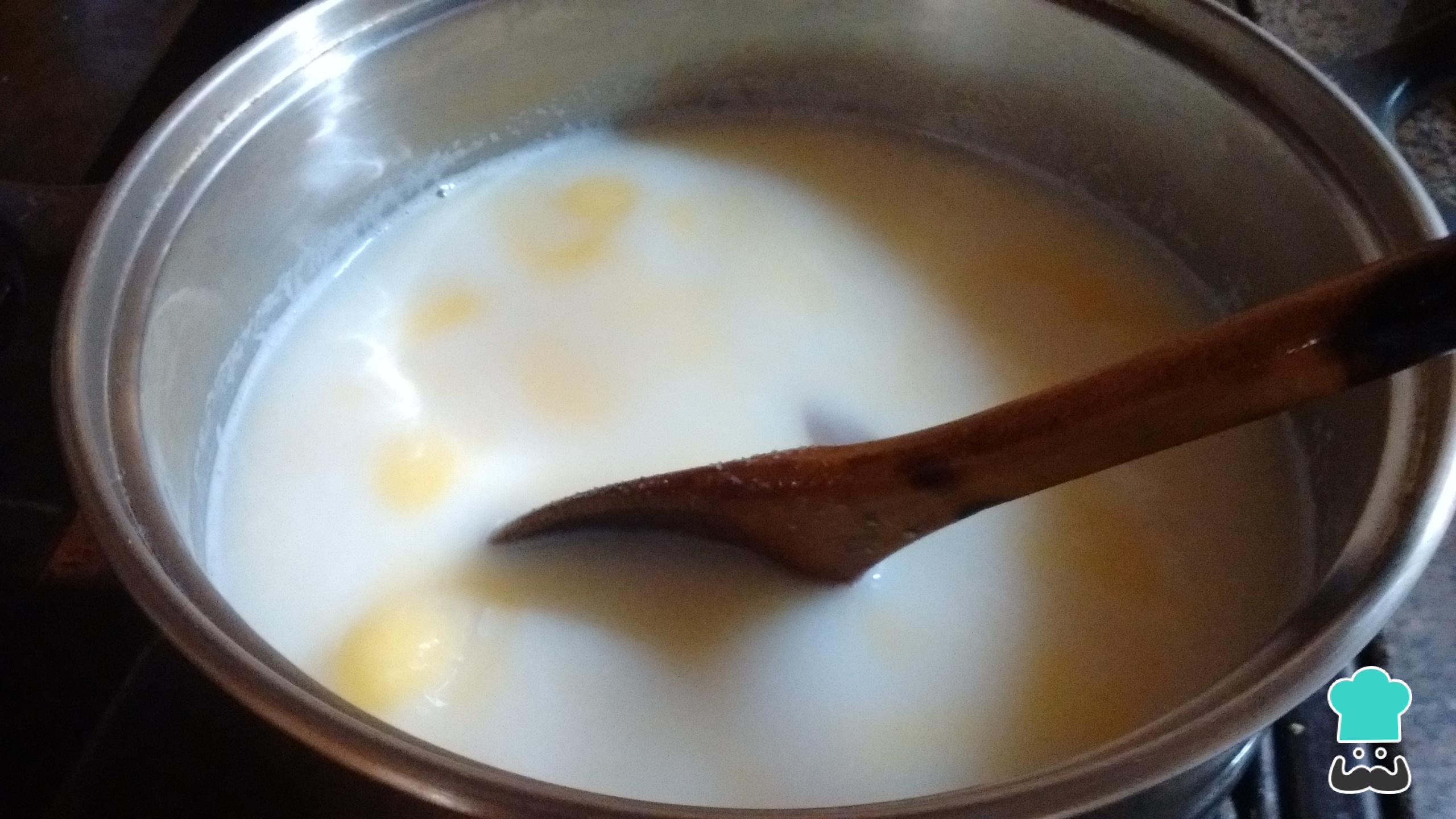 Al hervir, agrega la polenta en forma de lluvia y revuelve con cuchara o batidor de mano hasta que espese, esto puede llevar aproximadamente 1 minuto o lo que indique el envase.