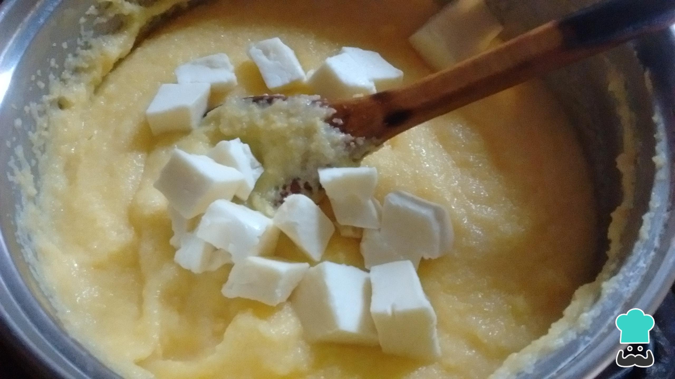 Cuando tu polenta esté cremosa, apaga el fuego y agrega el queso fresco, revuelve para que se derrita.