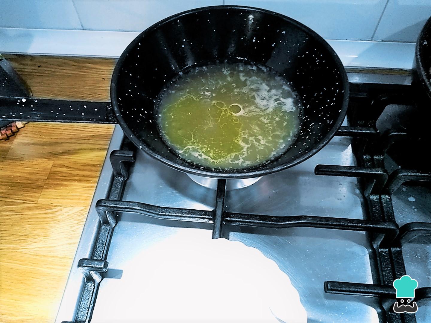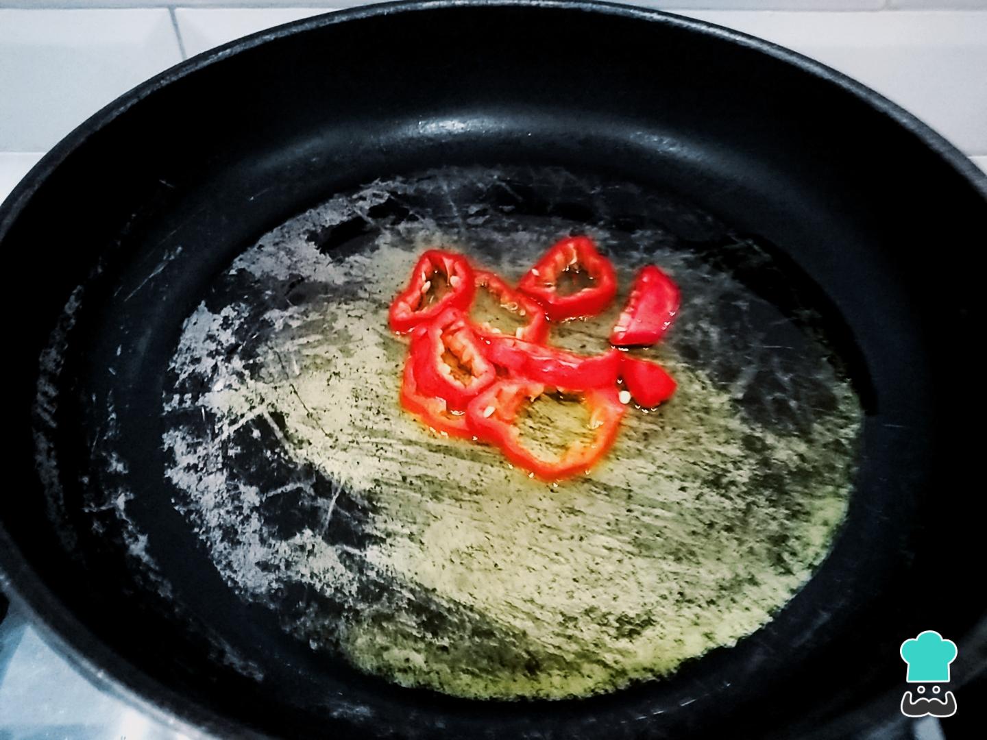 En una sartén, pon a calentar aceite de oliva y añade el pimiento en rodajas finas.