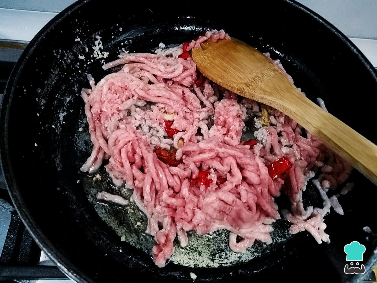 Agrega la pulpa de tomate y cocina 3 minutos más a fuego medio. Condimenta con sal, azúcar, ají, pimienta negra, ajo picado y, por último, el vino tinto. Baja el fuego y deja cocinar lentamente para conseguir una salsa de carne guisada deliciosa.