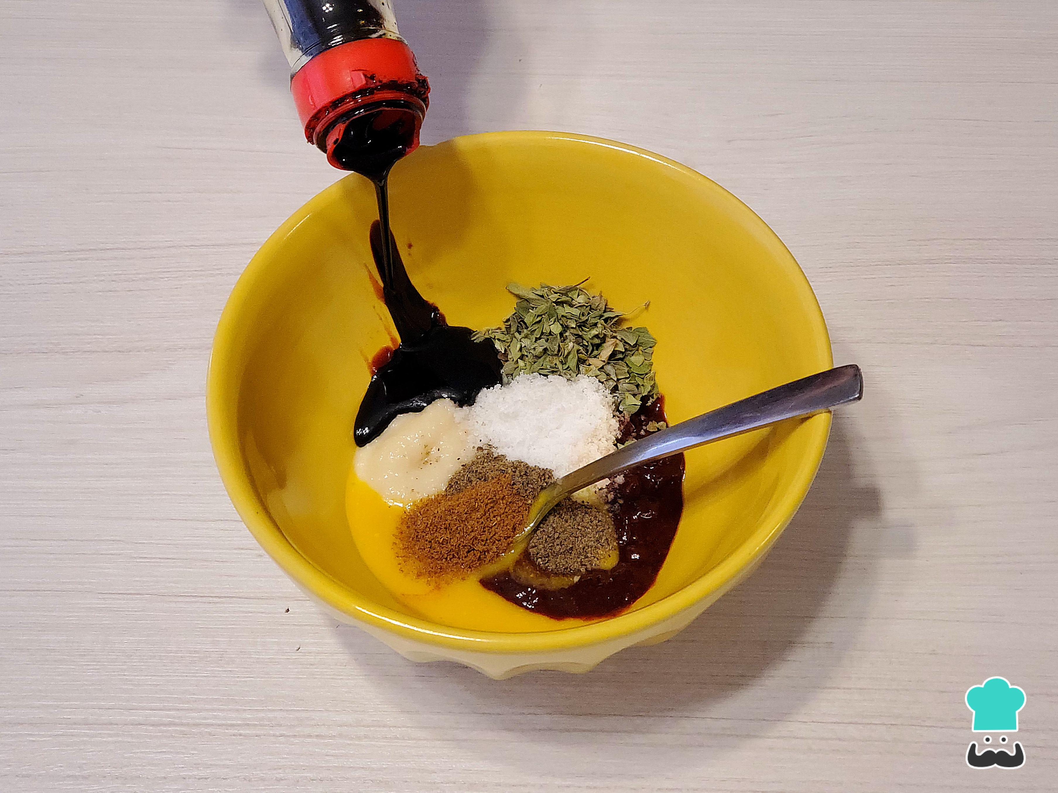 Empieza vertiendo en un bowl el ají panca en pasta, el ajo molido, mostaza, un buen chorro de sillao y vinagre tinto. También añade las especias y las hierbas secas como el orégano, comino, pimienta negra y media cucharadita de sal.