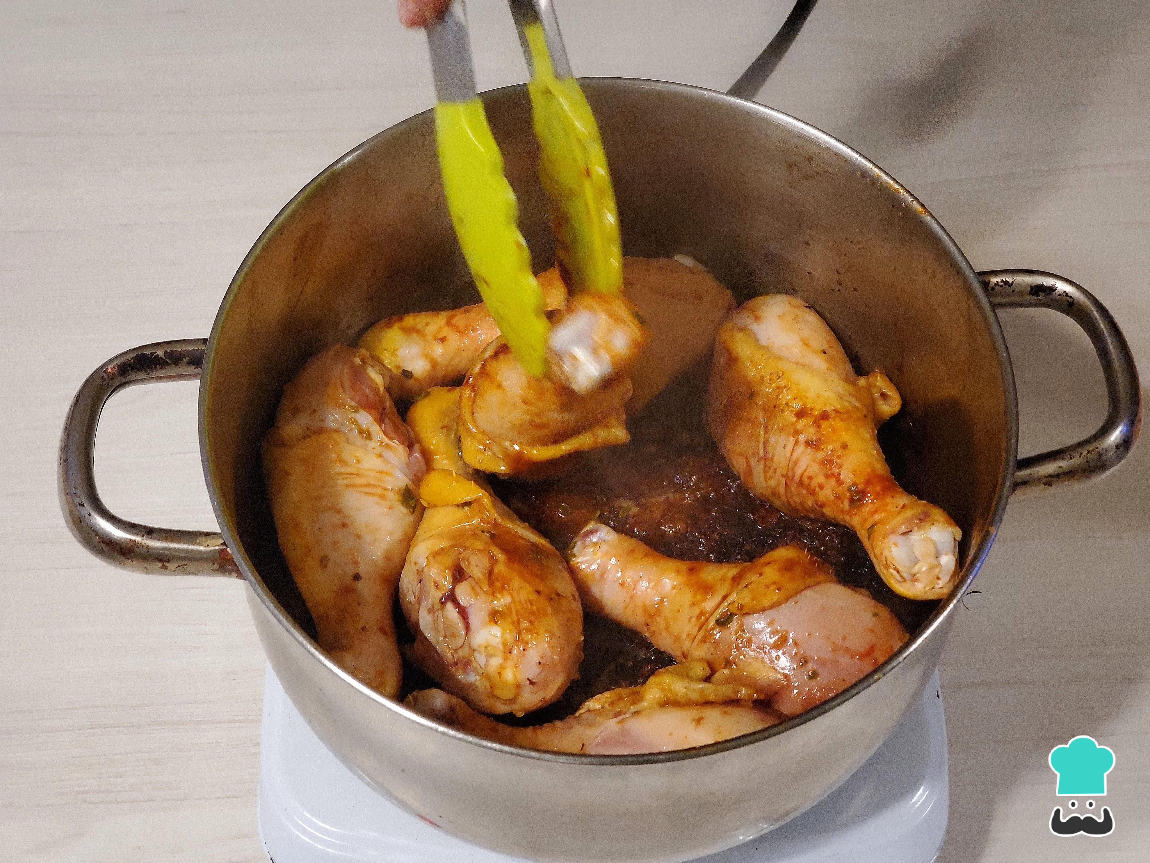 Cuando el fondo de la olla se vea sin residuos, vuelve a colocar las piezas de pollo junto con el jugo que hayan podido soltar y cúbrelas con caldo de pollo o agua.