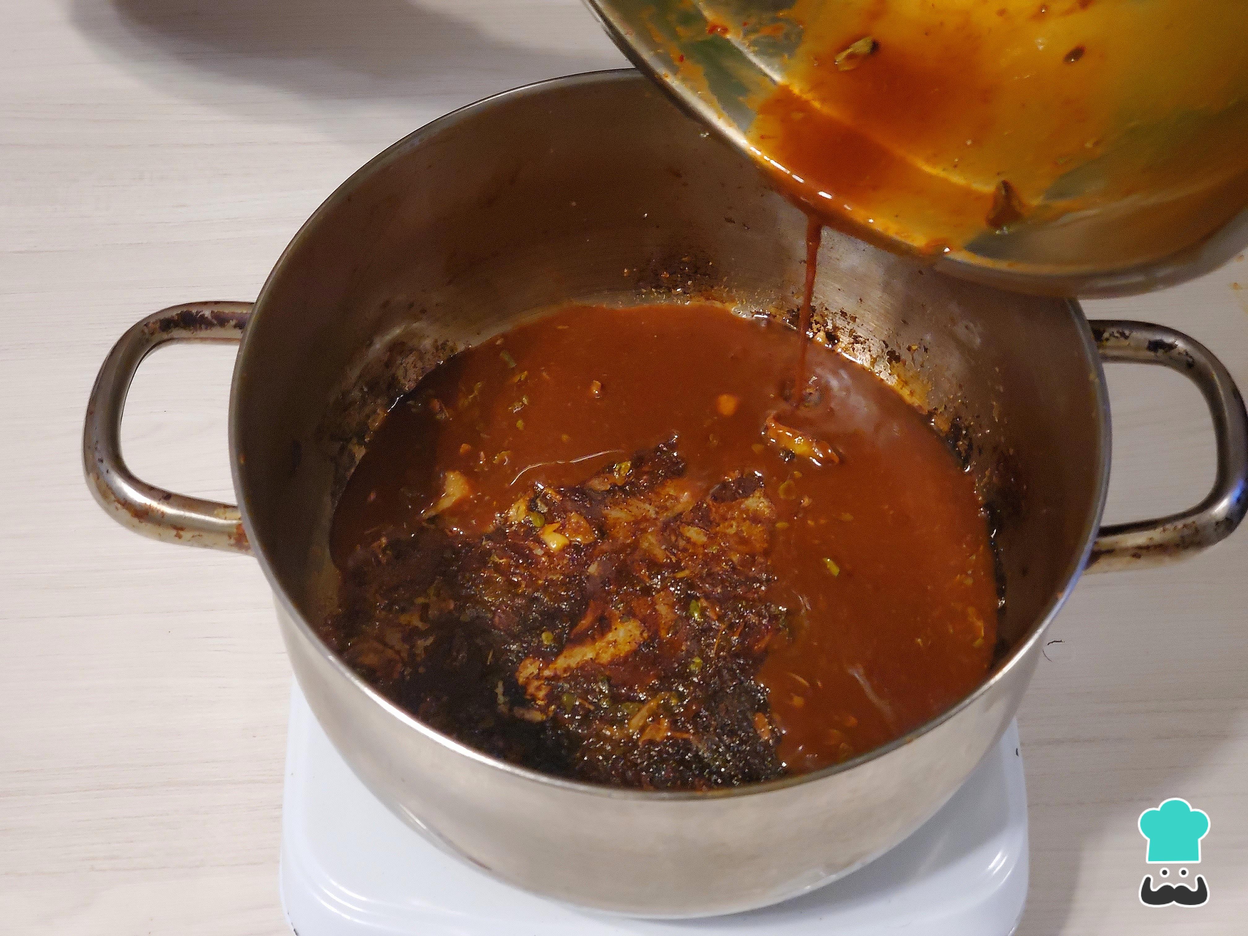 Vierte el aderezo en la olla mientras remueves con una cuchara de palo para despegar los residuos llenos de sabor que se han pegado en el fondo.