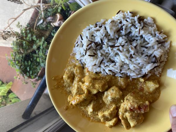 Emplatamos y acompañamos el pollo al curry con arroz, que puede ser basmati para servir la receta hindú en toda su esencia.