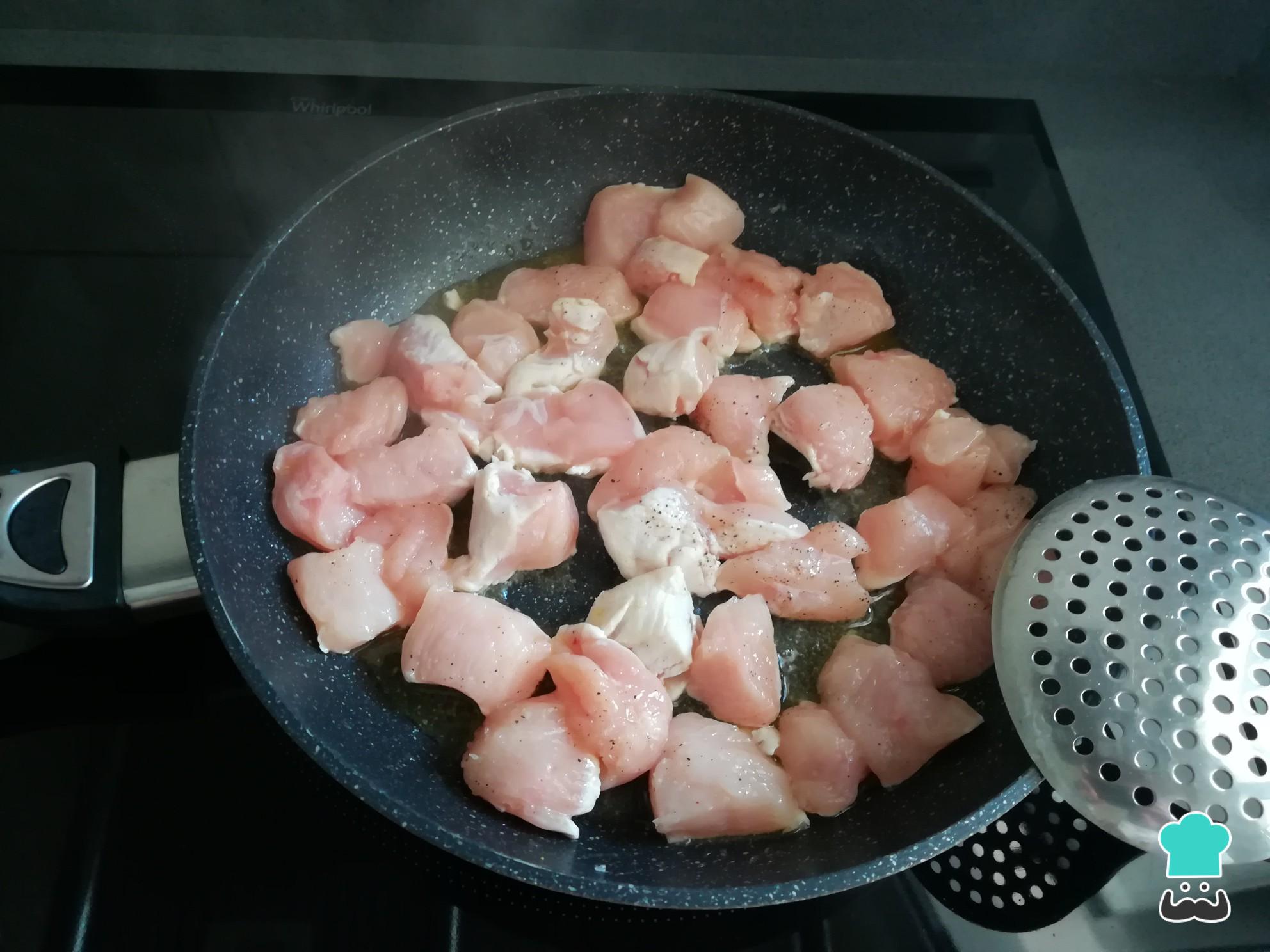 En una sartén echamos un poco de aceite y añadimos las pechugas de pollo troceadas en taquitos, previamente salpimentadas.