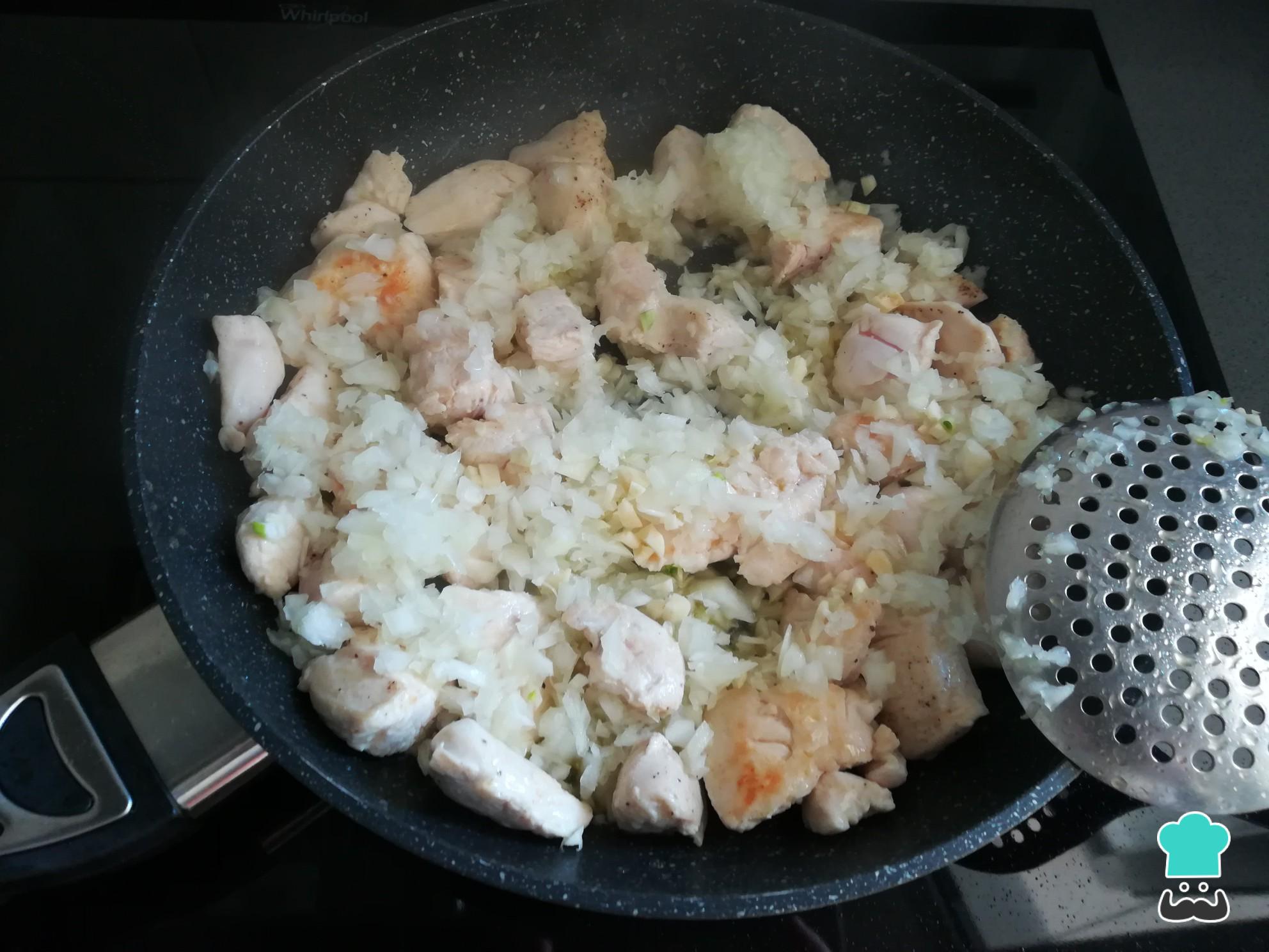 - Otra opción es sofreír la cebolla con el ajo antes de añadir la carne, e incorporar el pollo cuando adquiera un tono transparente.