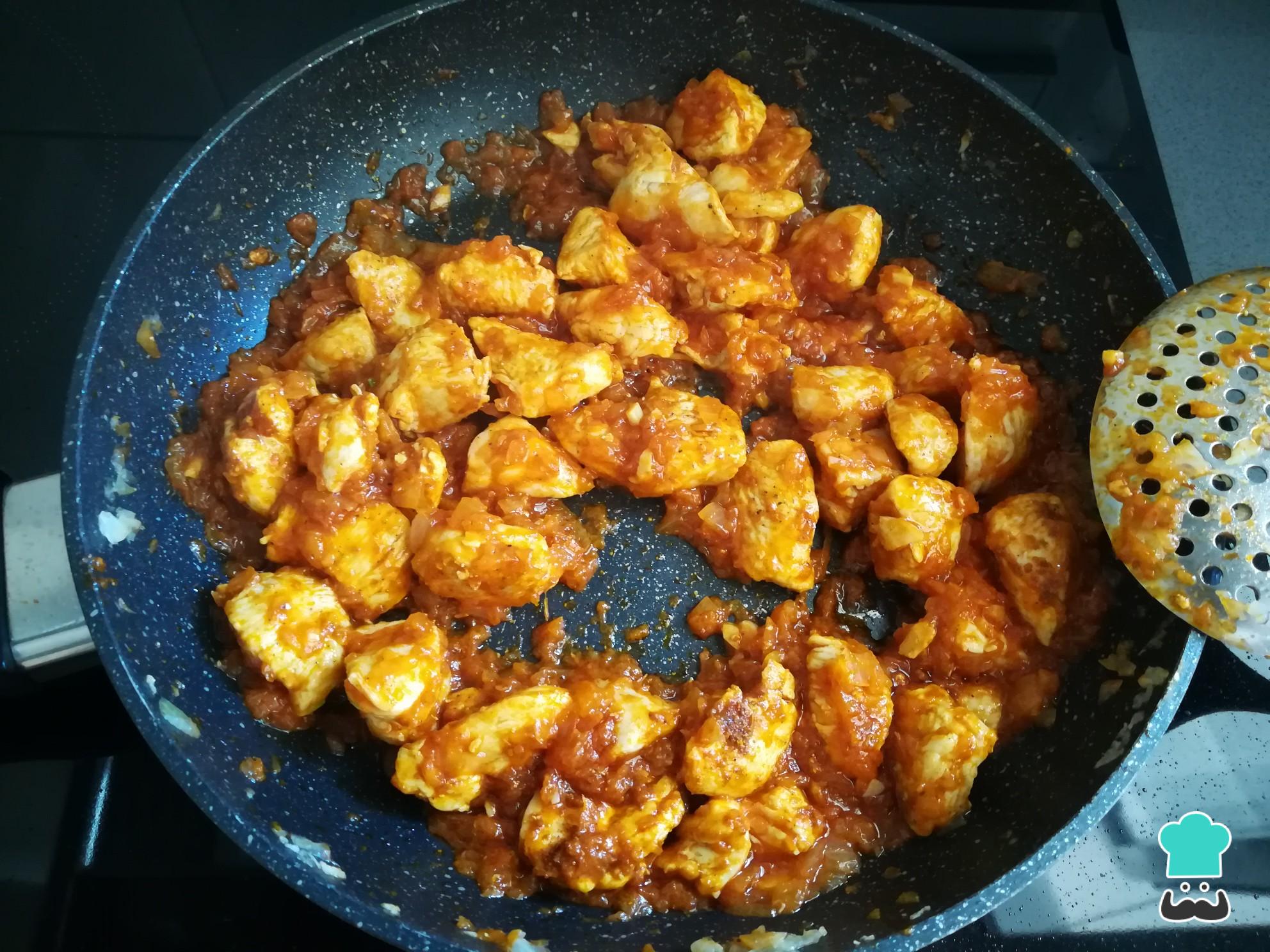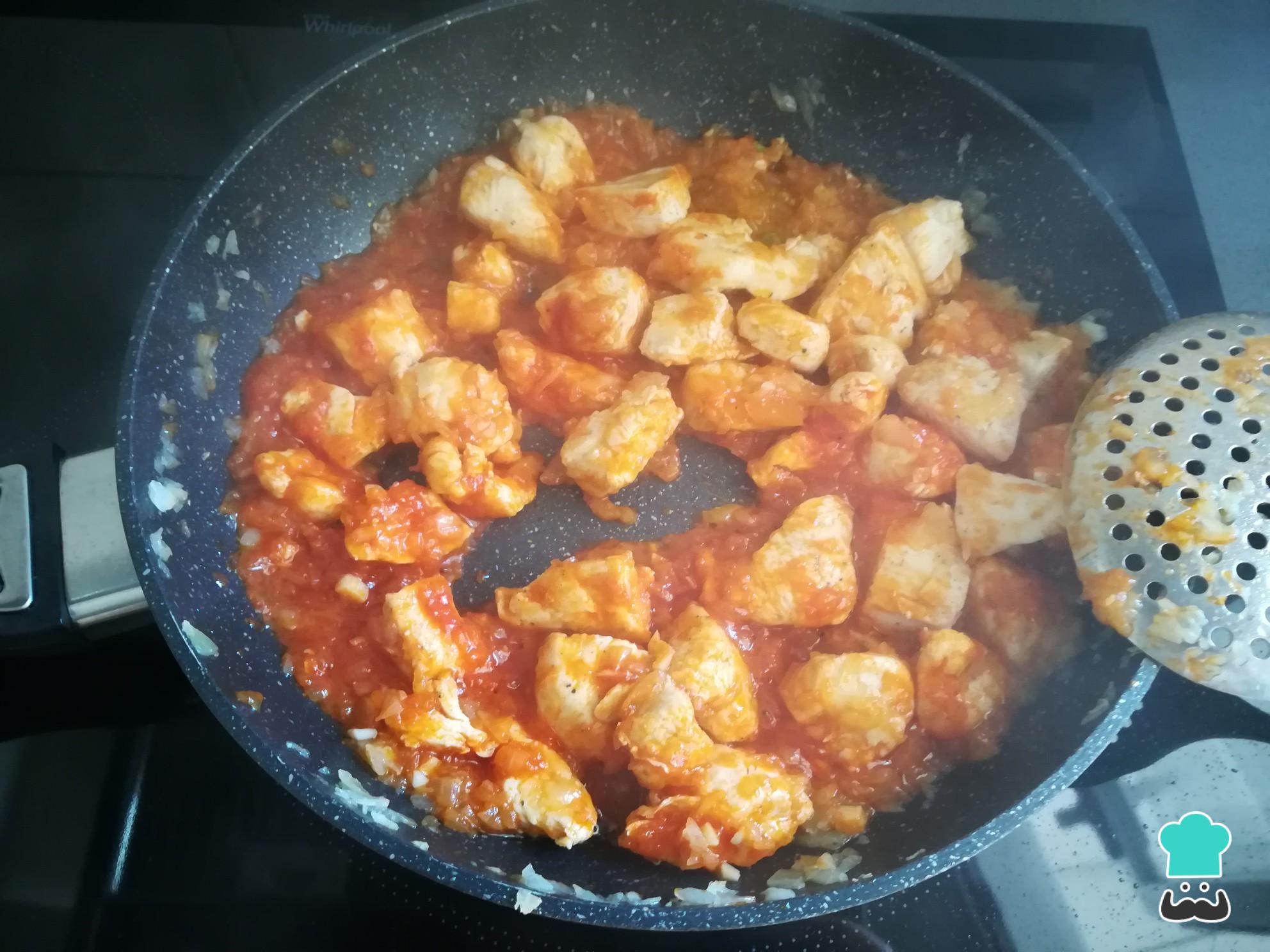 Una vez que ha cogido color la pechuga, agregamos las tres cucharadas soperas de tomate natural. Removemos todo y bajamos el fuego a la mitad, en mi caso al 5, para seguir con la receta de pollo al curry. Si quieres, puedes aprender a preparar tu propia salsa de tomate india.