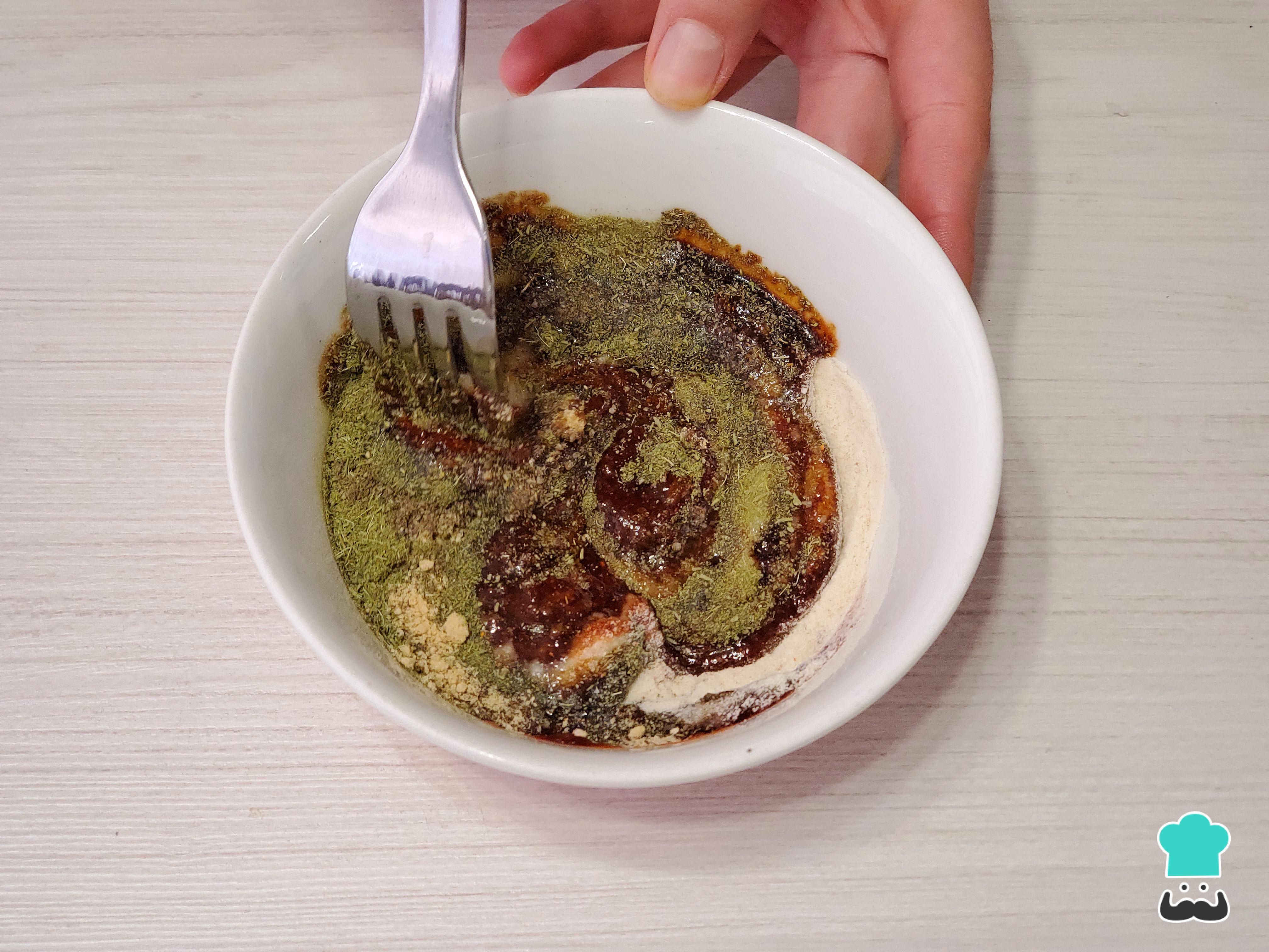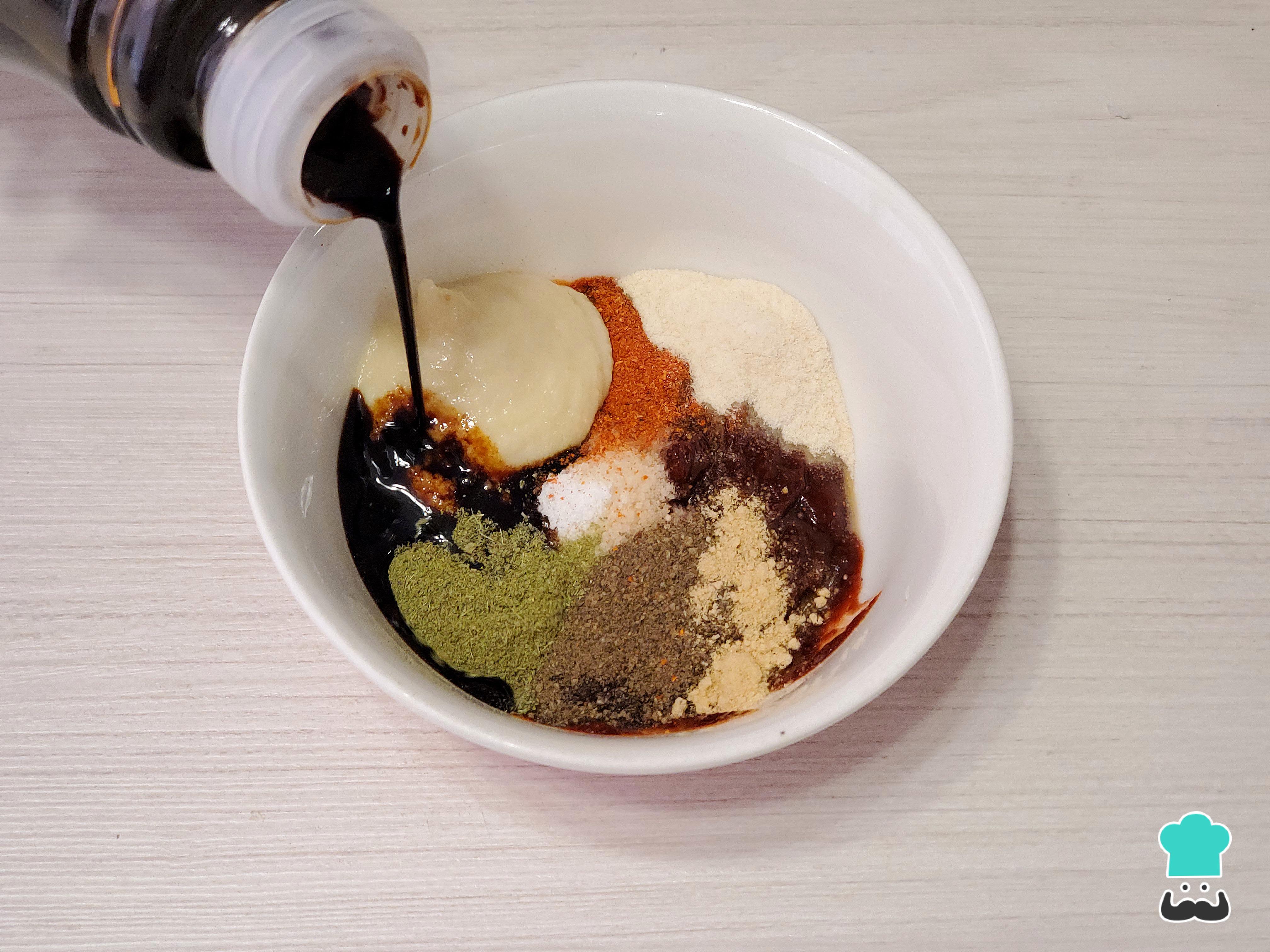 Comienza preparando la marinada para el pollo al horno peruano. En un bowl mezcla el ají panca en pasta, el ajo molido, ajo en polvo, pimienta negra molida, orégano seco molido, jengibre en polvo, ají en polvo si te gusta el picor o paprika, un par de cucharaditas de sal y un buen chorro de sillao.