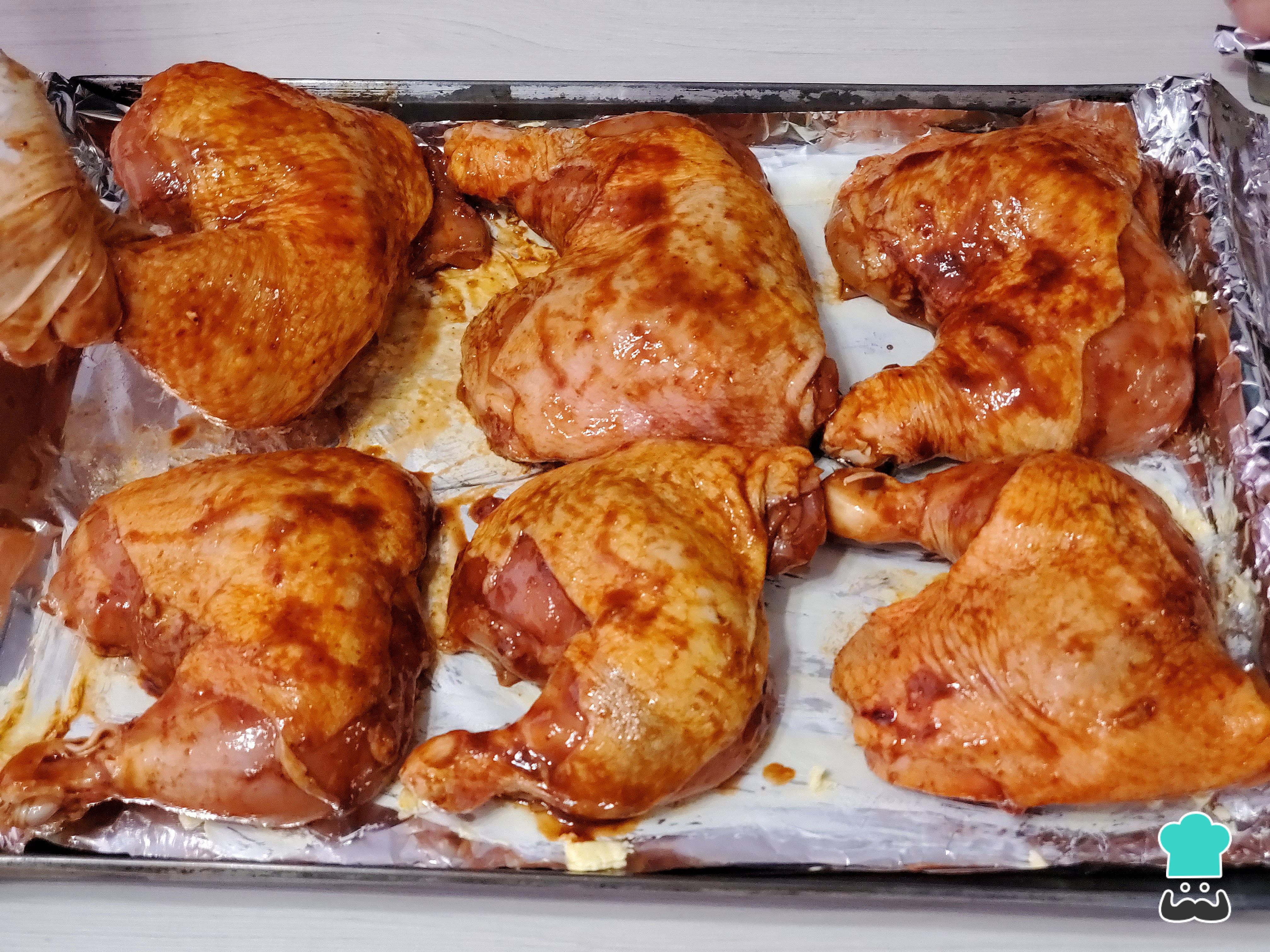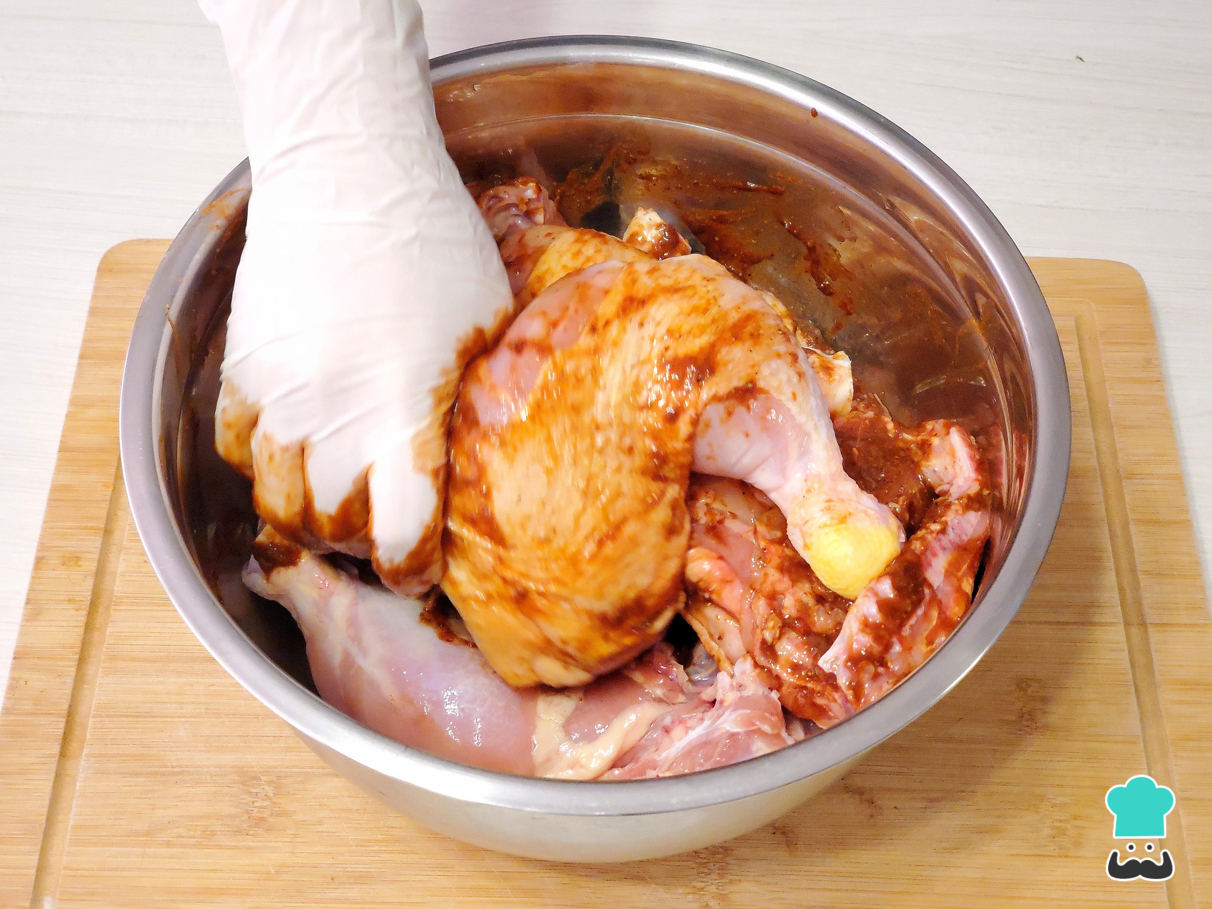A continuación, limpia las piezas de pollo y retira la grasa excedente (conserva el pellejo porque se vuelve crujiente después del horneado). Coloca las piezas en un bowl grande, embadúrnalos muy bien con el aderezo de ají y deja reposar en la refrigeradora por lo menos 2 horas.