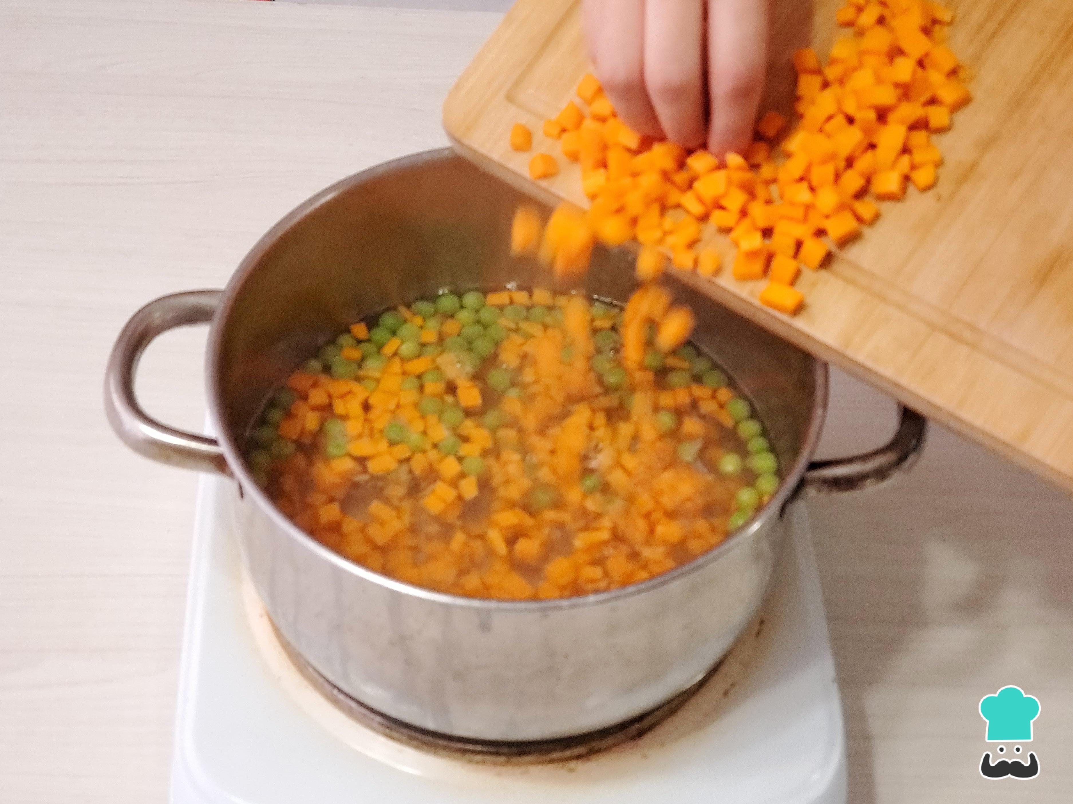Pela y corta las zanahorias en cubos pequeños y blanquea junto con las alverjas. Asimismo, nuevamente pon una cacerola con abundante agua salada a hervir y cocina las alverjas por 2 minutos. A los 2 minutos, añade las zanahorias, deja que se cocine por un par de minutos hasta que estén al dente y, cuando estén listos, corta la cocción sumergiéndolos en agua helada.