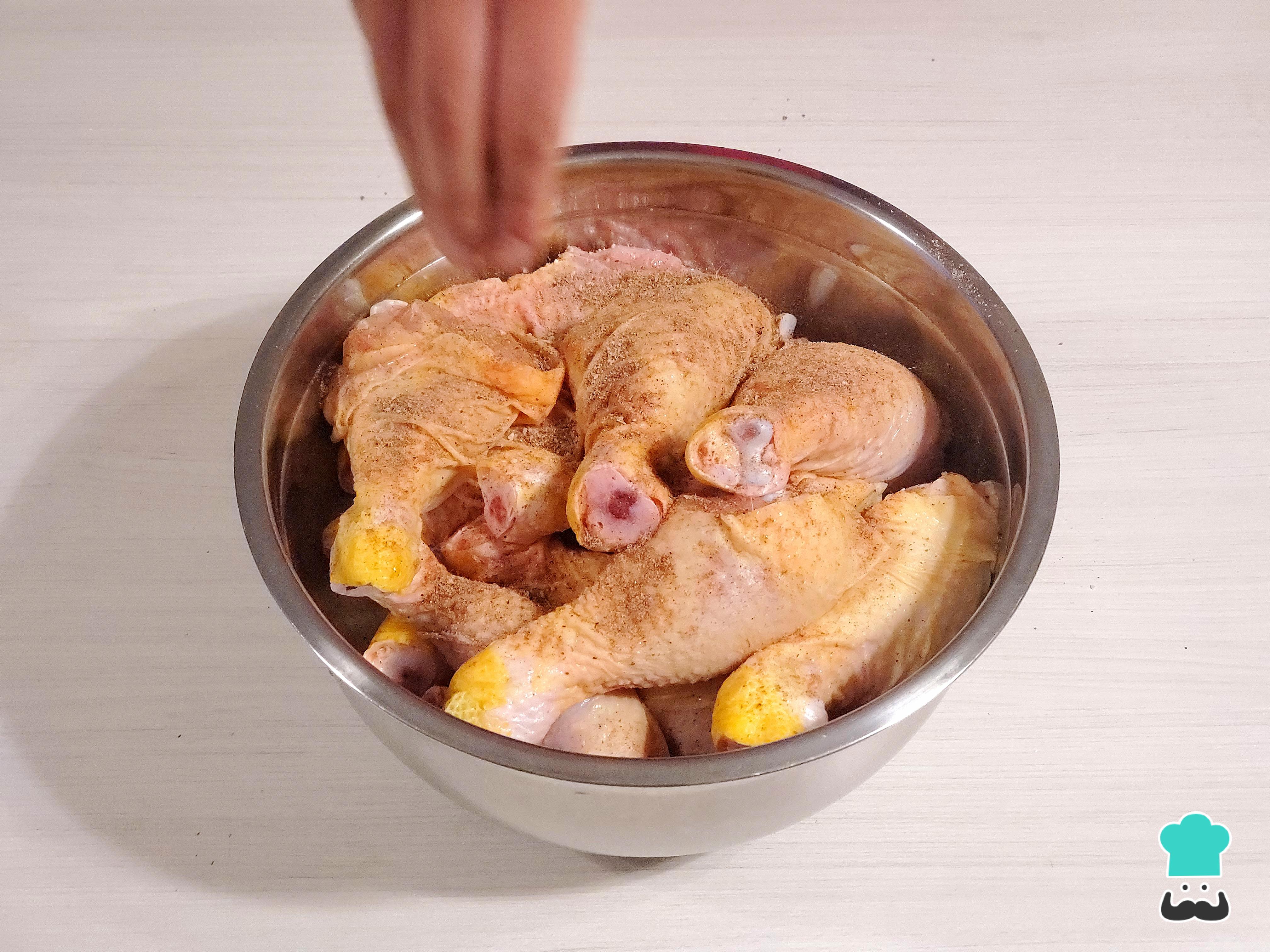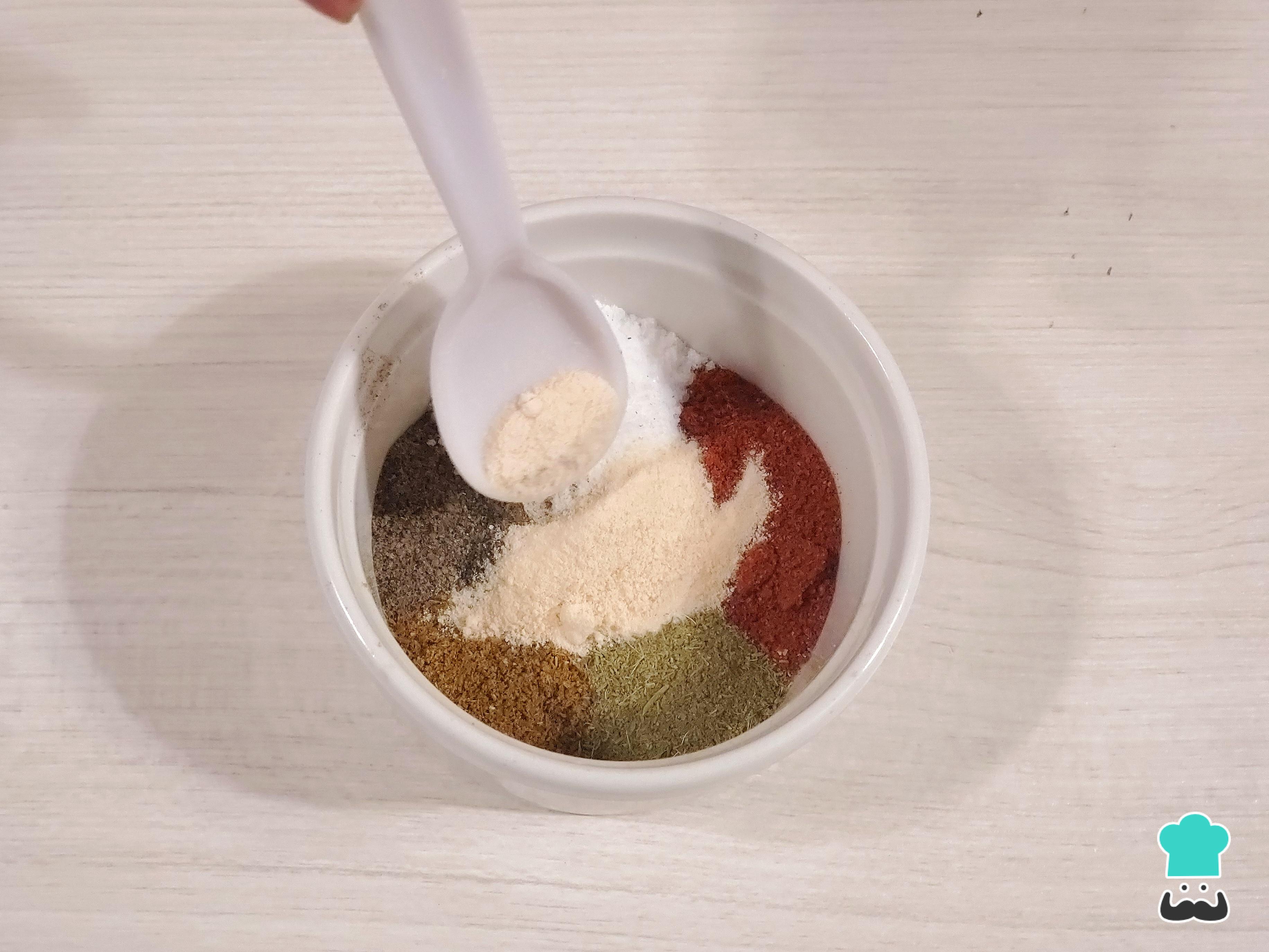 Comienza mezclando en un bol todas las especias para sazonar el pollo: ajo en polvo, orégano seco, paprika en polvo, comino molido, pimienta negra molida y sal.