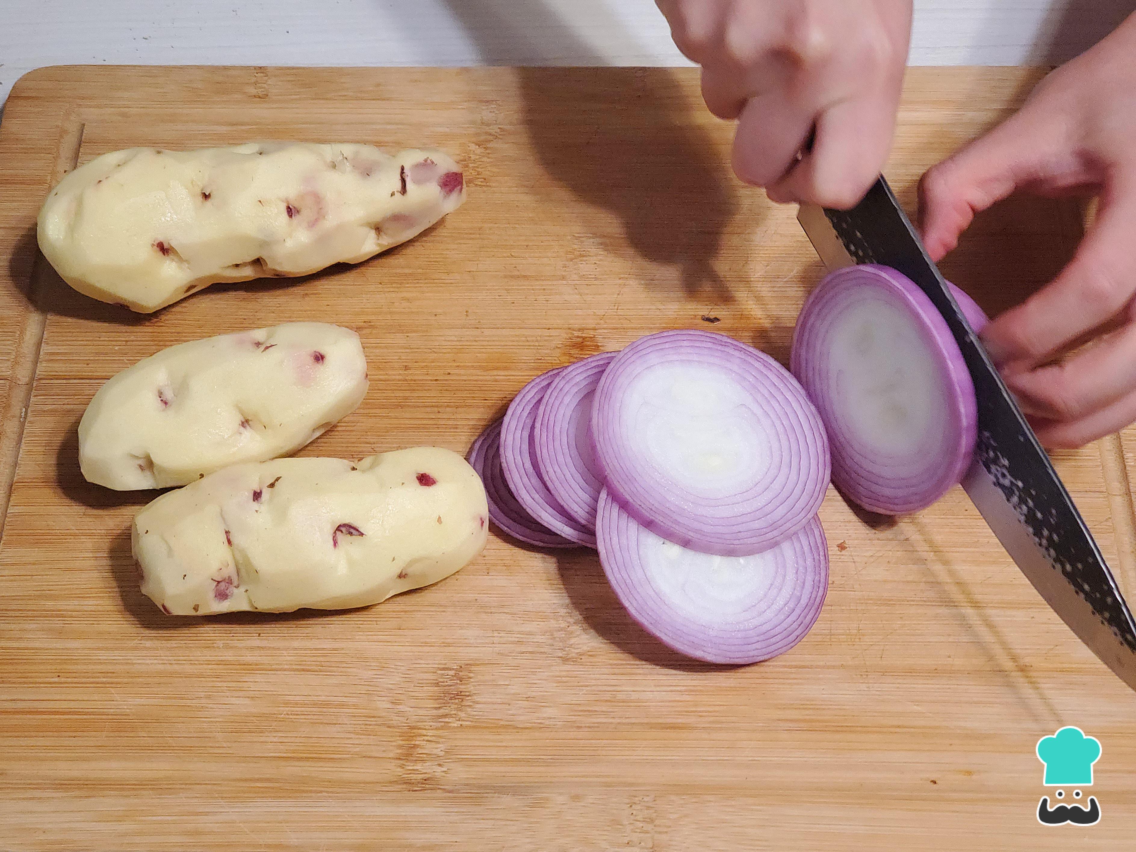 En una tabla corta una cebolla en rodajas para obtener aros. Para hacerlo, comienza cortando los dos extremos de la cebolla y, luego, retira la capa superior que la recubre. A continuación, coloca la cebolla de forma horizontal y empieza a cortar rodajas delgadas.