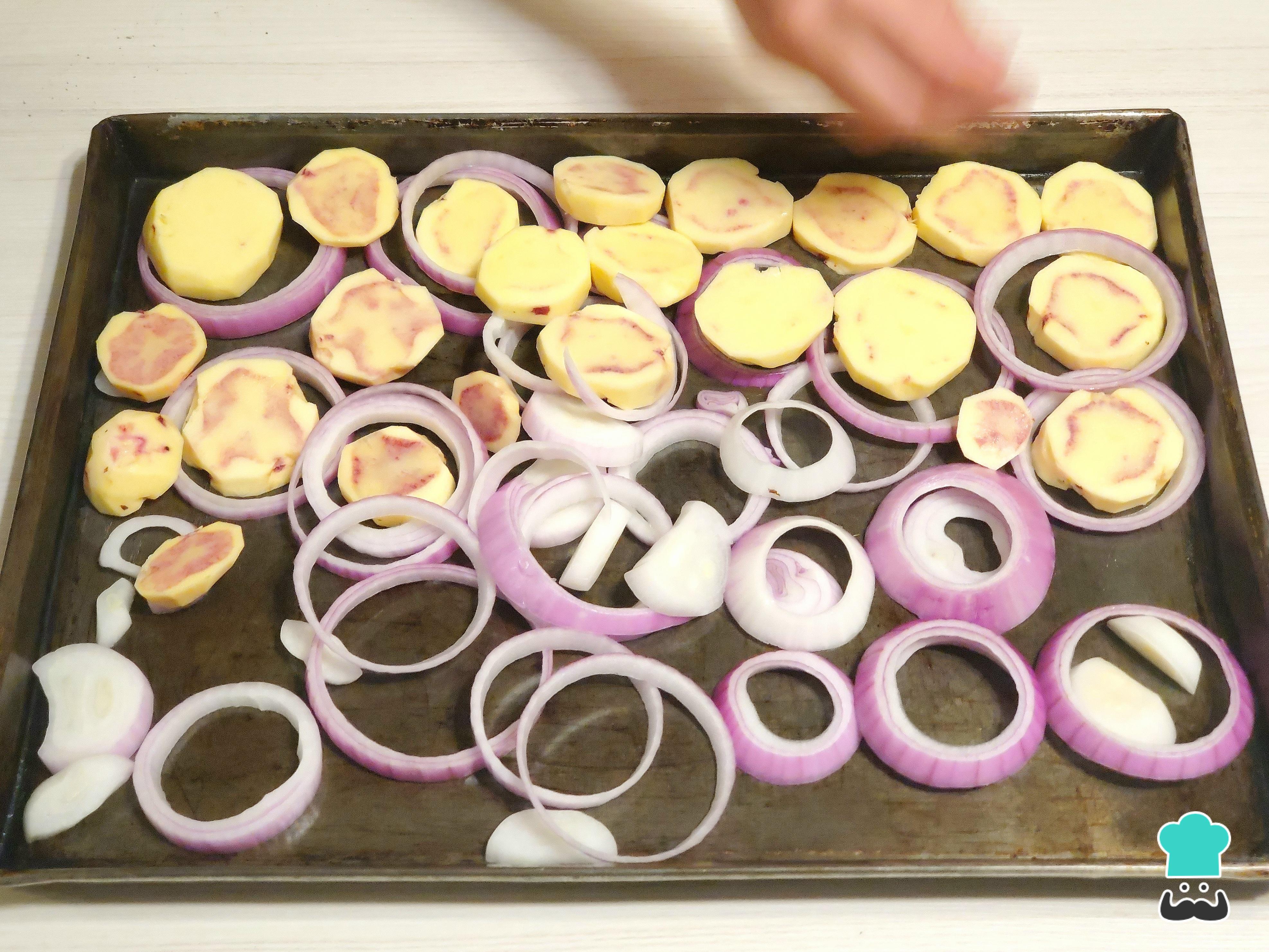 Acomoda estas papas y los aros de cebolla en una bandeja previamente untada con aceite de oliva, formando una capa uniforme.