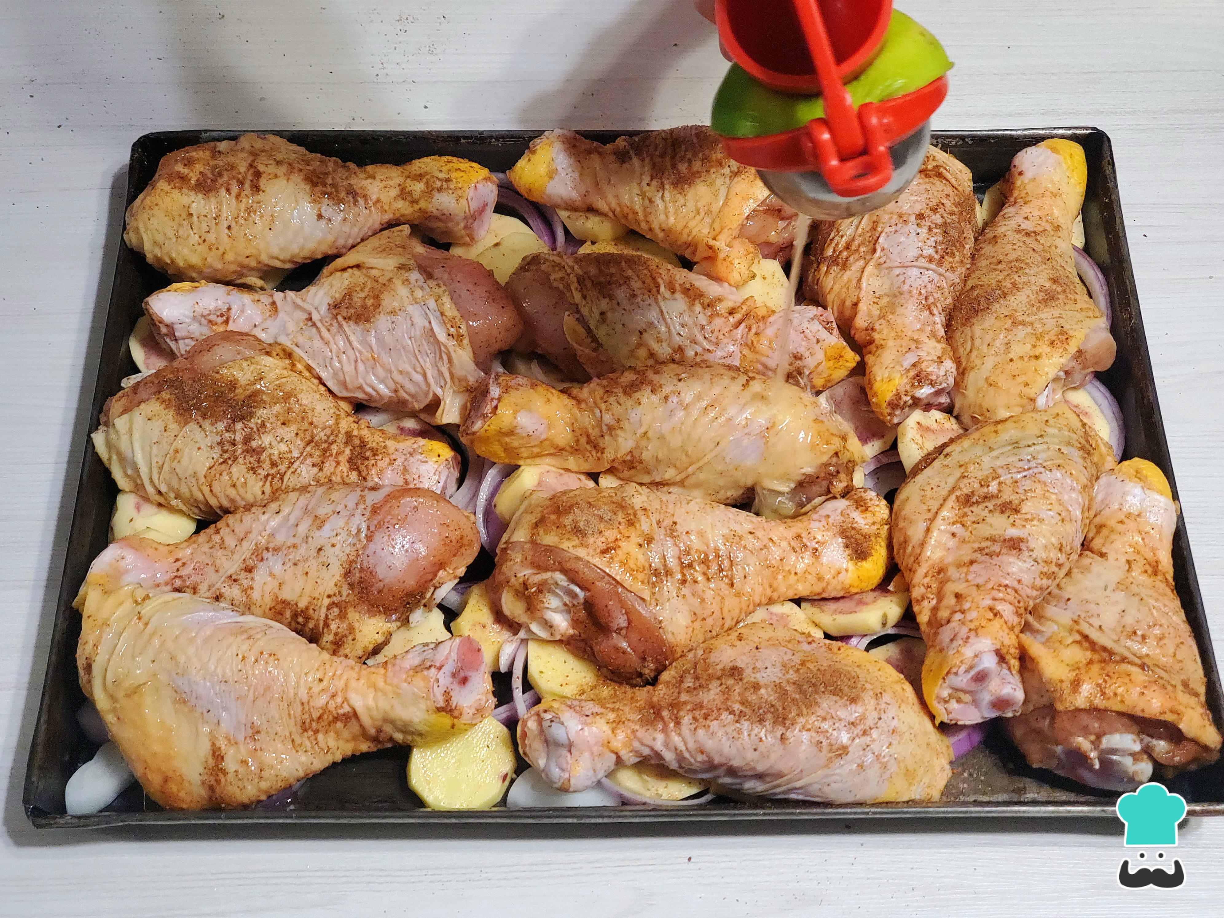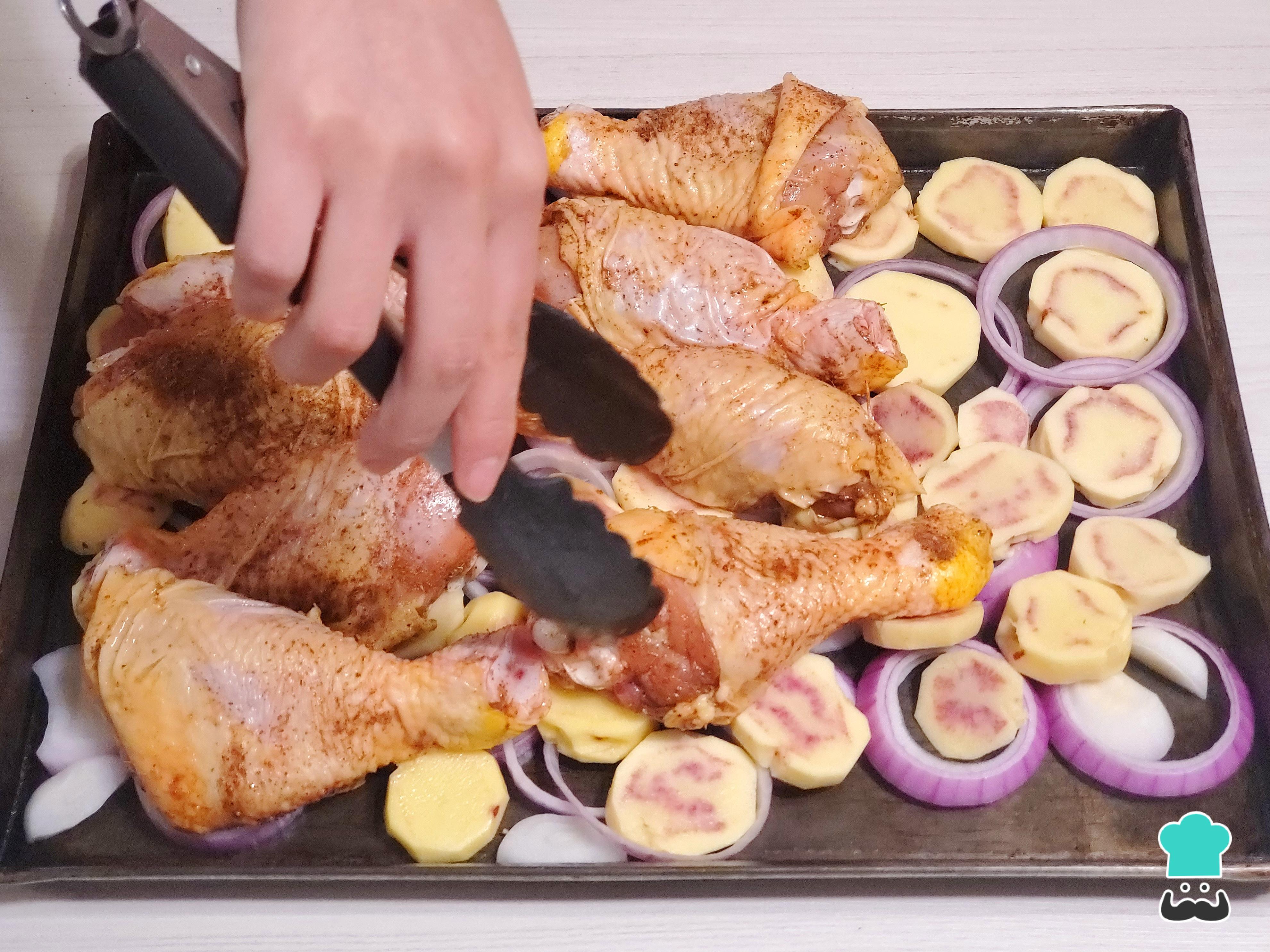 Encima coloca las piezas de pollo dejando un poco de espacio entre ellas.