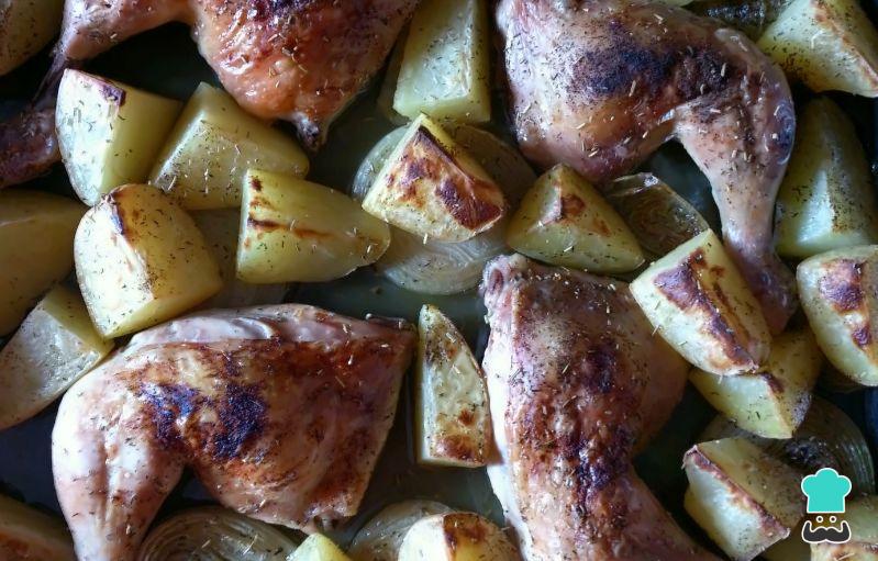 Truco: Si somos pocos para comer podemos poner sólo dos muslos de pollo o tres y si somos más se pueden poner tantos como nos quepan en la bandeja del horno.