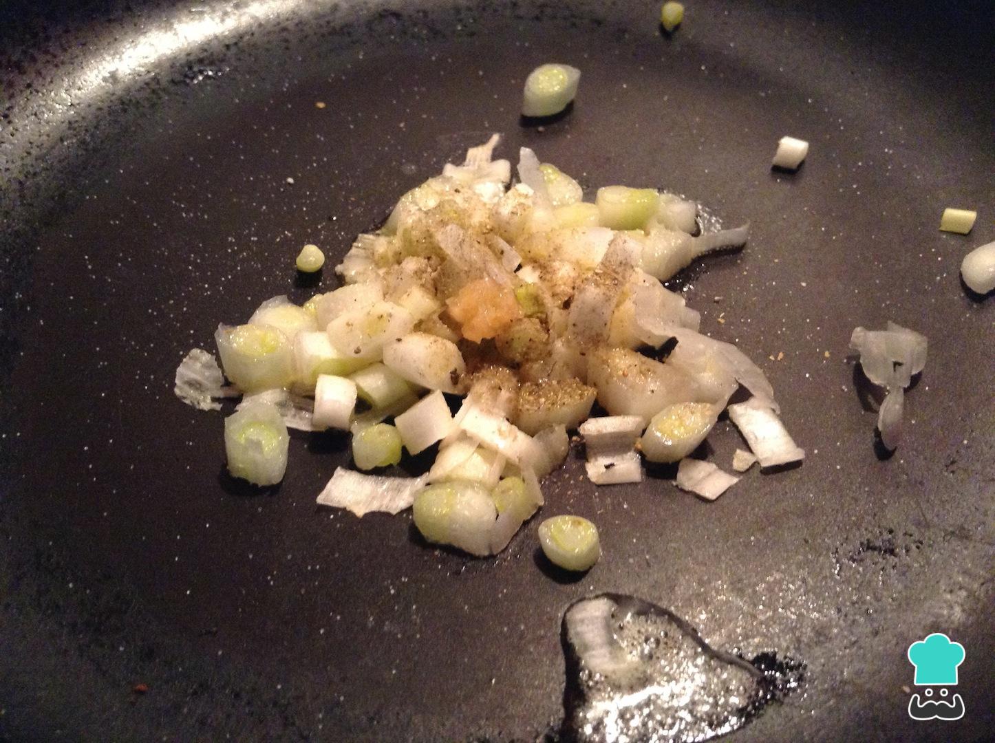 Lleva una sartén a fuego medio con la mantequilla. Cuando se haya fundido, adiciona la cebolla de verdeo con sal, pimienta negra y un poco de pasta de ajo. Saltéala durante algunos minutos y retira del fuego.