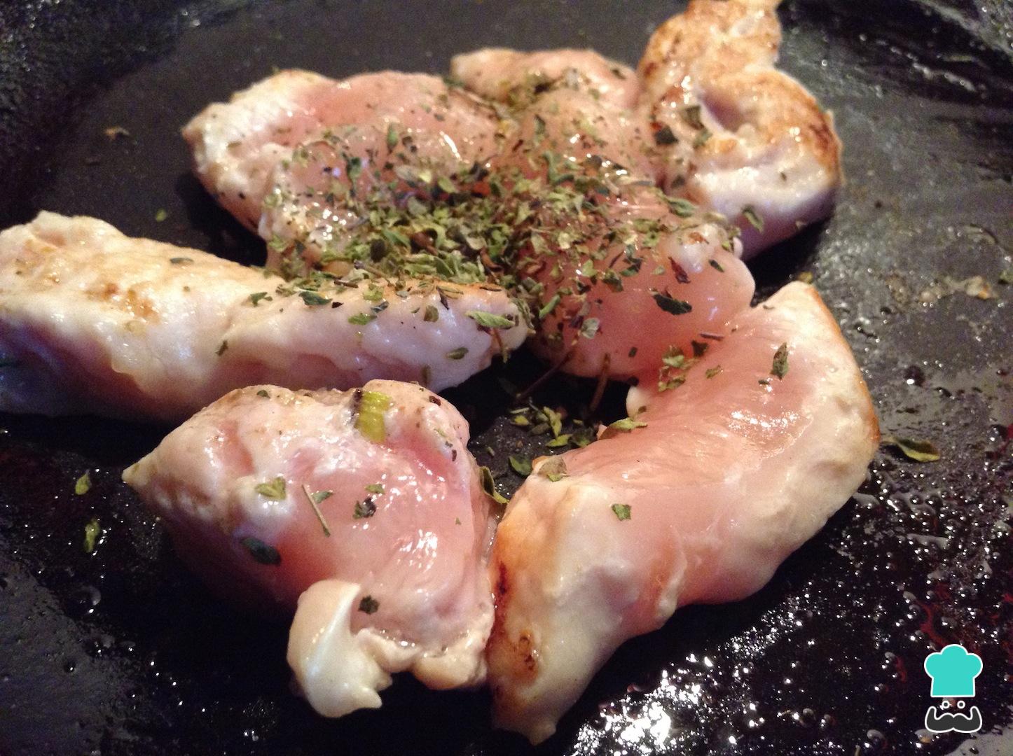 En la misma sartén donde salteaste la cebolla larga agrega el pollo cortado en tiras o cubos. Añade sal y pimienta negra al gusto.